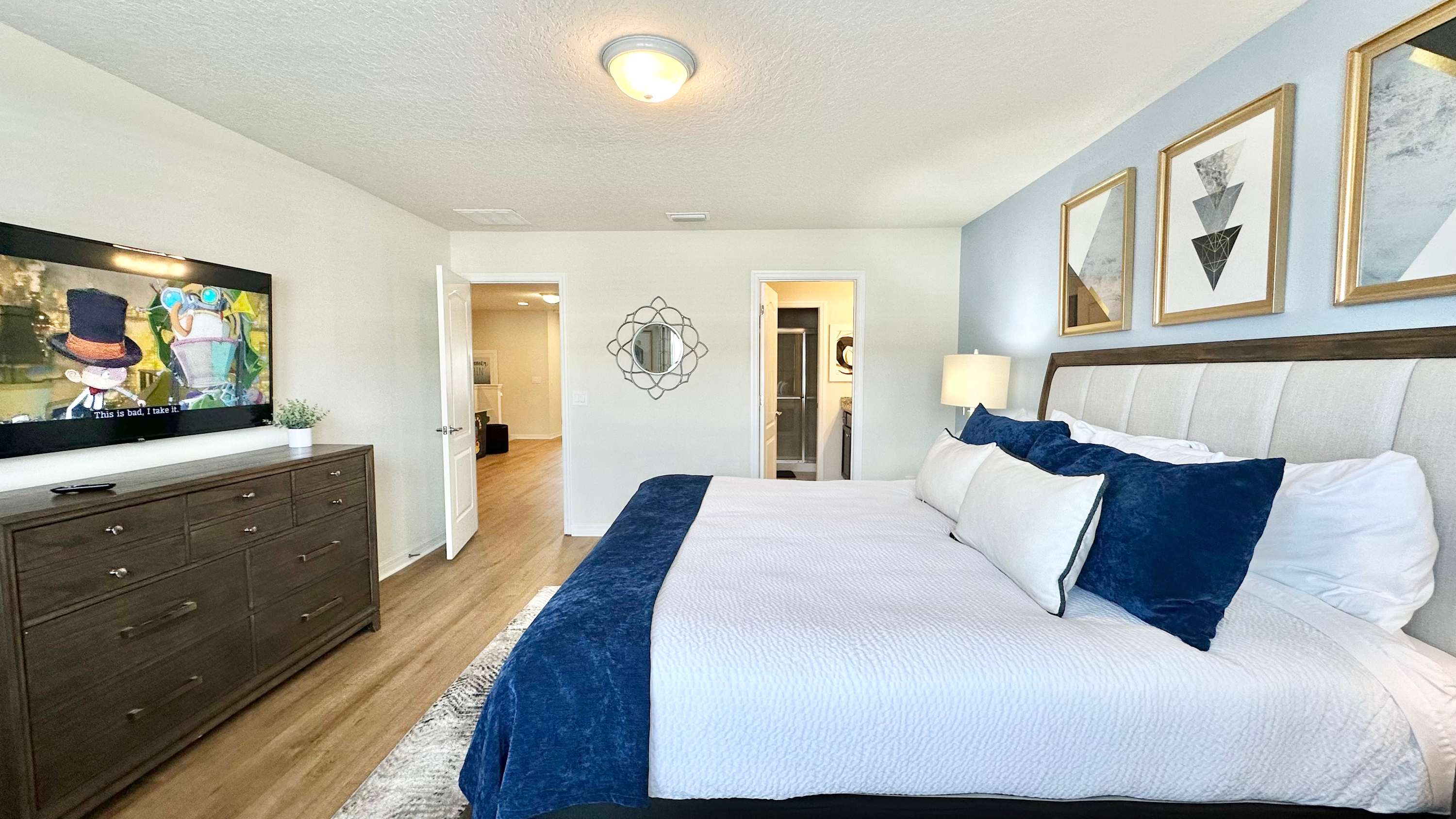 Bedroom #3 includes a king size bed, a smart TV, and an ensuite bathroom with a dual vanity and a walk-in shower.