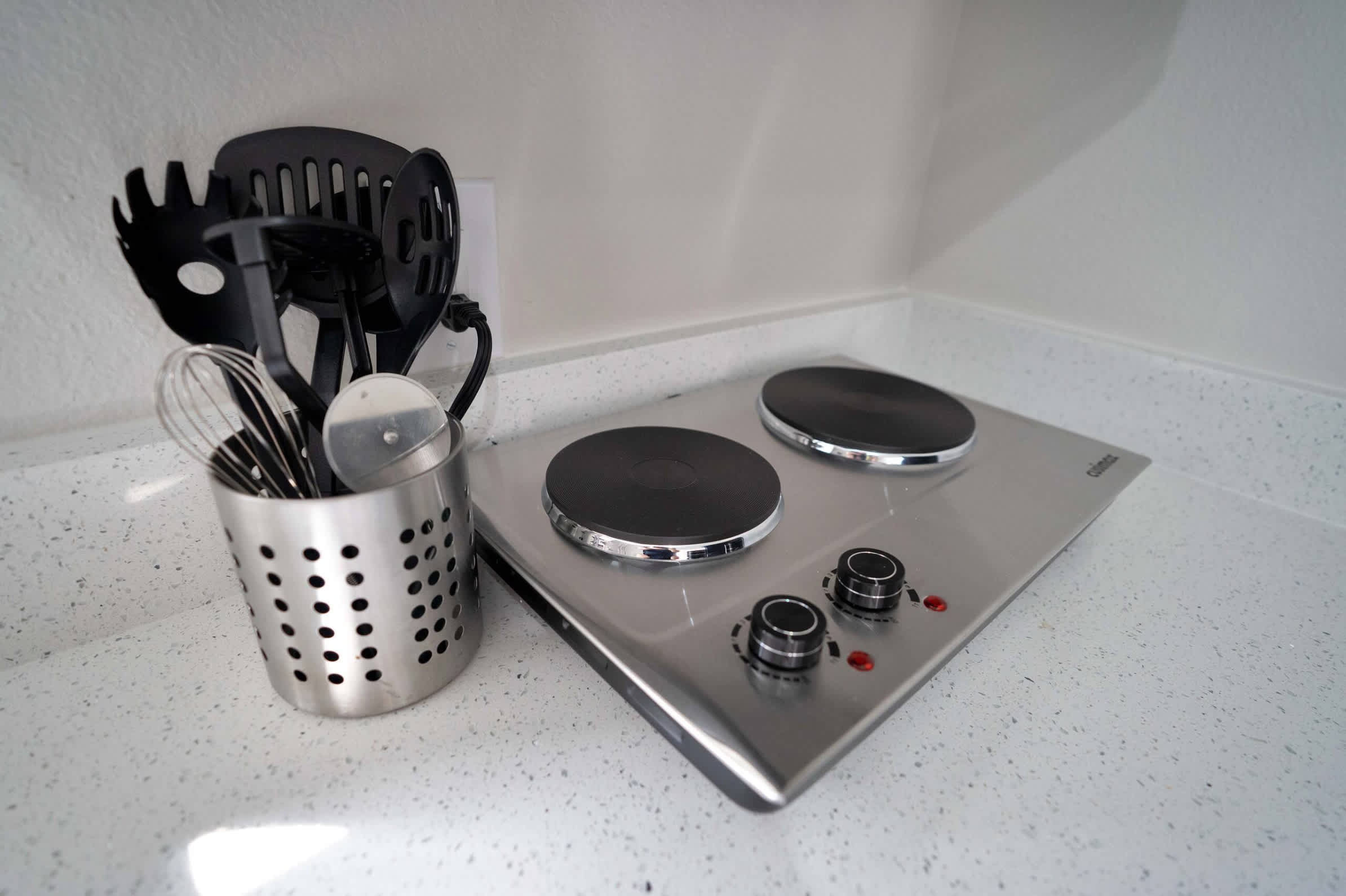 Upon arrival, drop your bags and kick your feet up on the couch next to the luxurious king size bed while you stream your favorite shows and make plans for the evening ahead. Debating on dining in or heading out? The kitchenette is equipped with a stainless steel refrigerator, microwave, a dual countertop hot plate, and stunning cabinets stocked with all the cooking necessities. Whether you decide to whip up a quick meal or grab takeout from a nearby restaurant, light some candles while you and your loved one take a seat at the dining table for two.