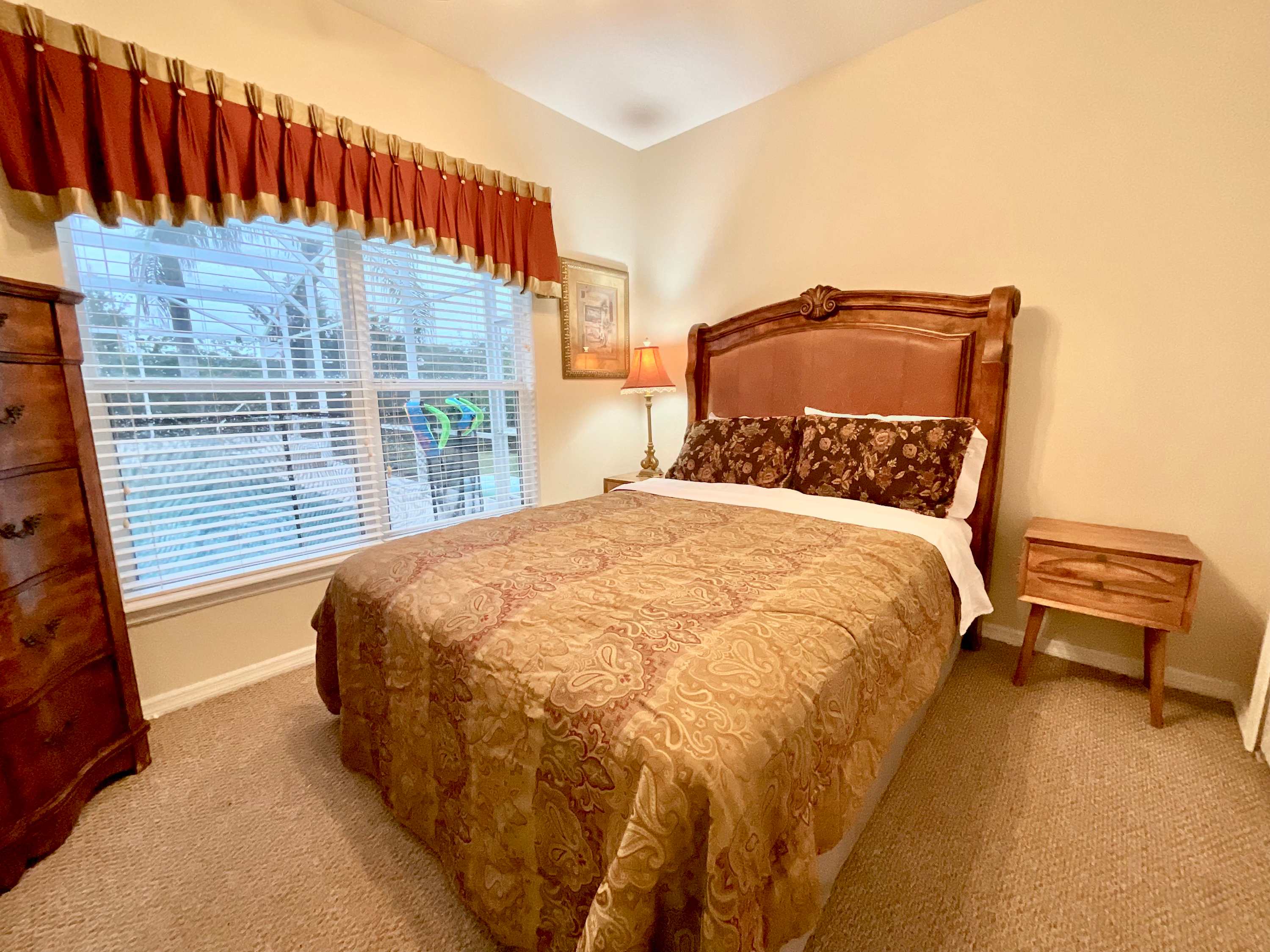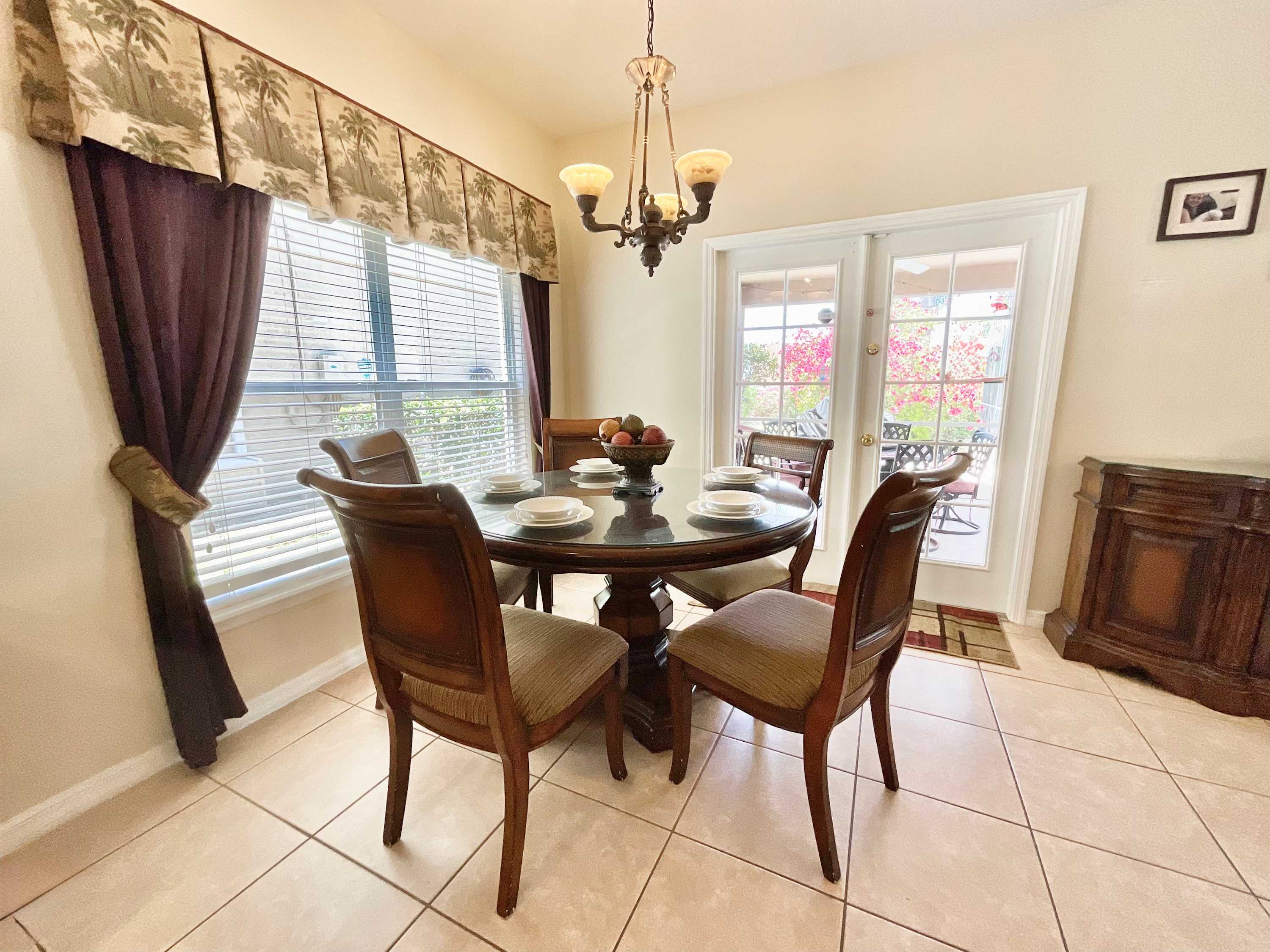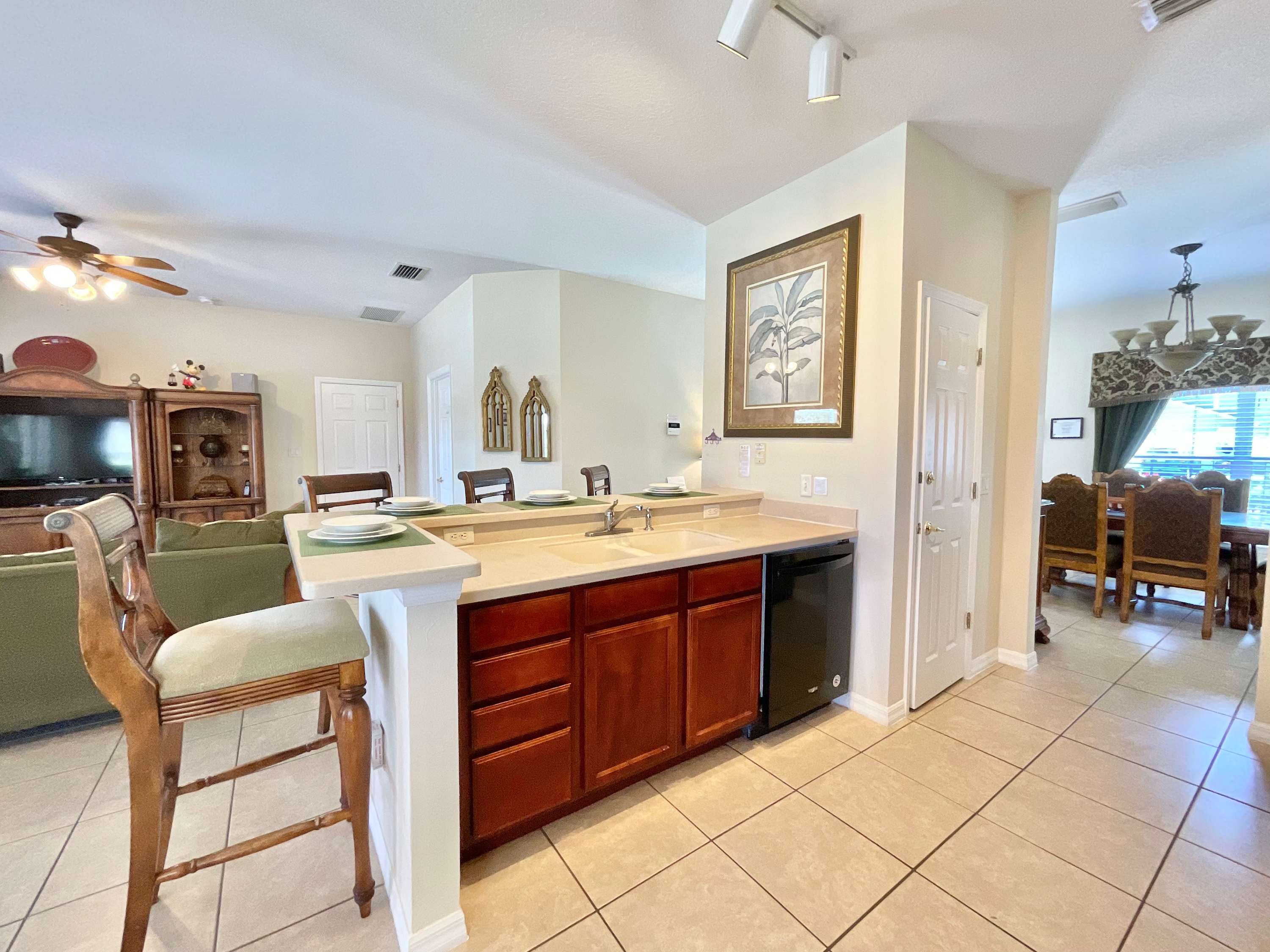 Start your vacation off on the right foot and head straight to the backyard when you arrive at Marcella’s Villa. The spacious lanai encloses a combo pool and hot tub lined with chaise loungers for everyone to take a dip and relax. Back indoors, order some takeout before preparing some light appetizers in the fully equipped kitchen with black appliances and redwood cabinetry stocked with cookware and dining ware. Snag one of the four high-top stools at the counter to snack on the spread before gathering around the dining table for six or the kitchen table for four. Don’t forget to whip out the highchair for your littlest one to join you!