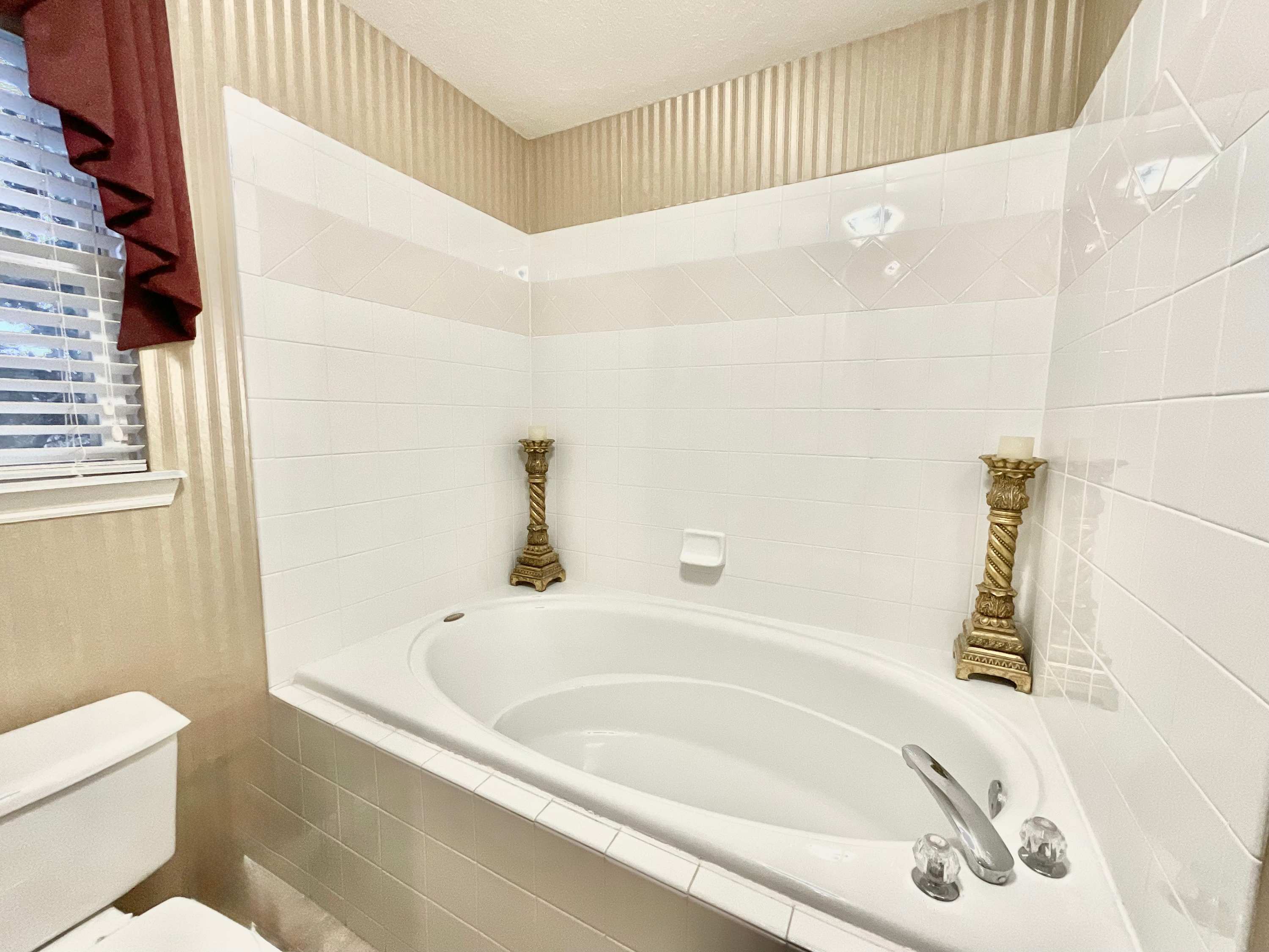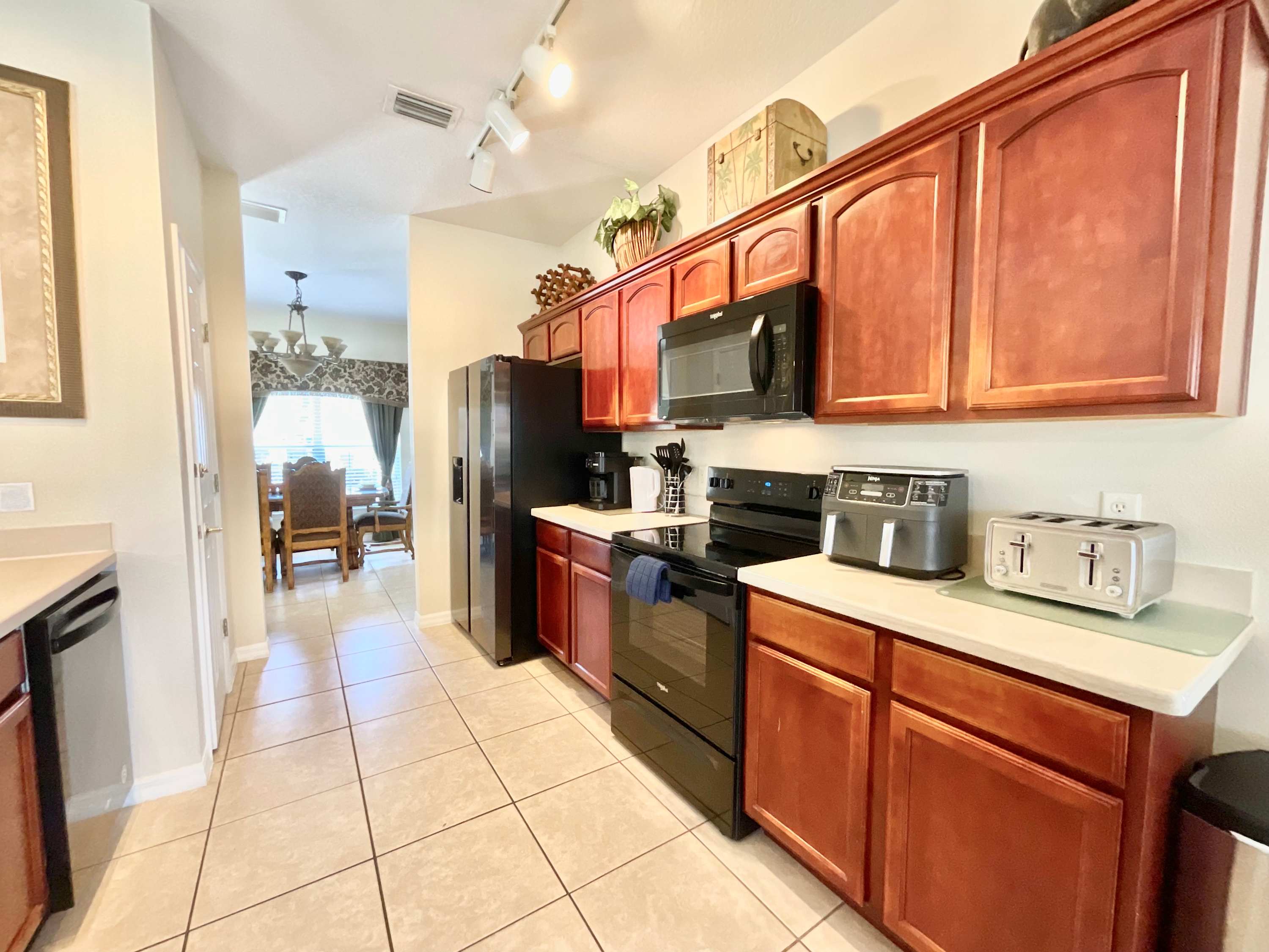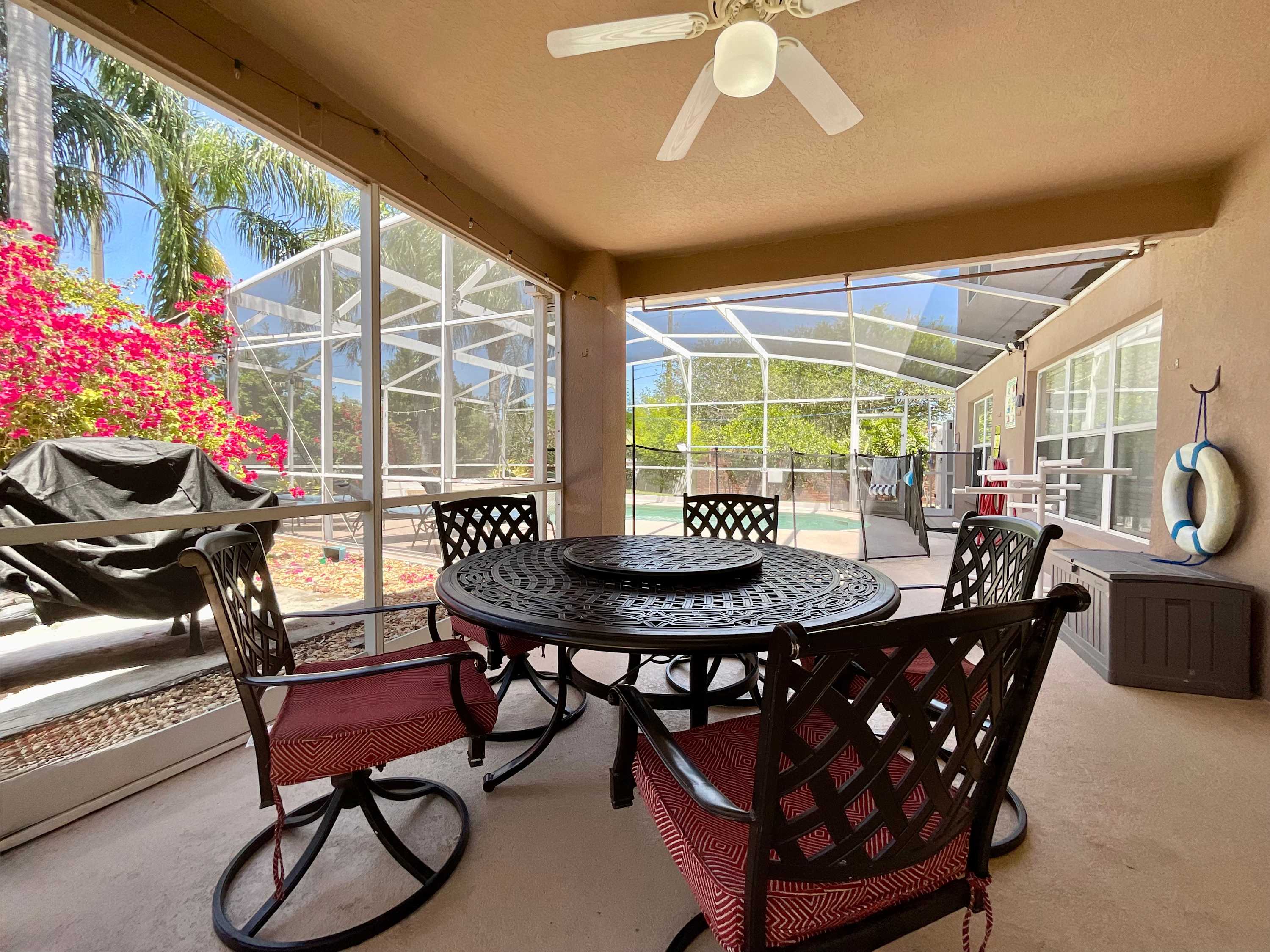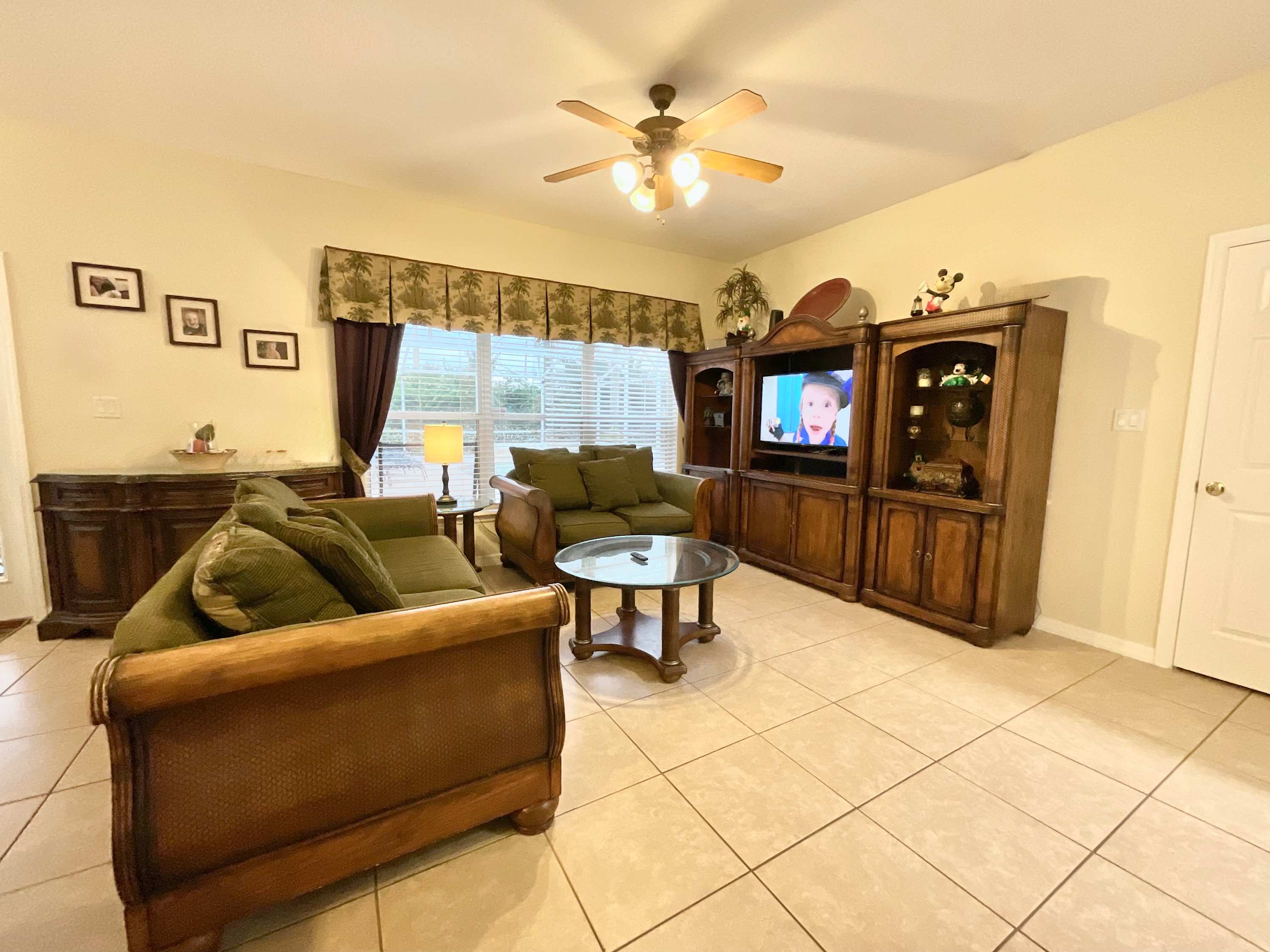 Start your vacation off on the right foot and head straight to the backyard when you arrive at Marcella’s Villa. The spacious lanai encloses a combo pool and hot tub lined with chaise loungers for everyone to take a dip and relax. Back indoors, order some takeout before preparing some light appetizers in the fully equipped kitchen with black appliances and redwood cabinetry stocked with cookware and dining ware. Snag one of the four high-top stools at the counter to snack on the spread before gathering around the dining table for six or the kitchen table for four. Don’t forget to whip out the highchair for your littlest one to join you!
