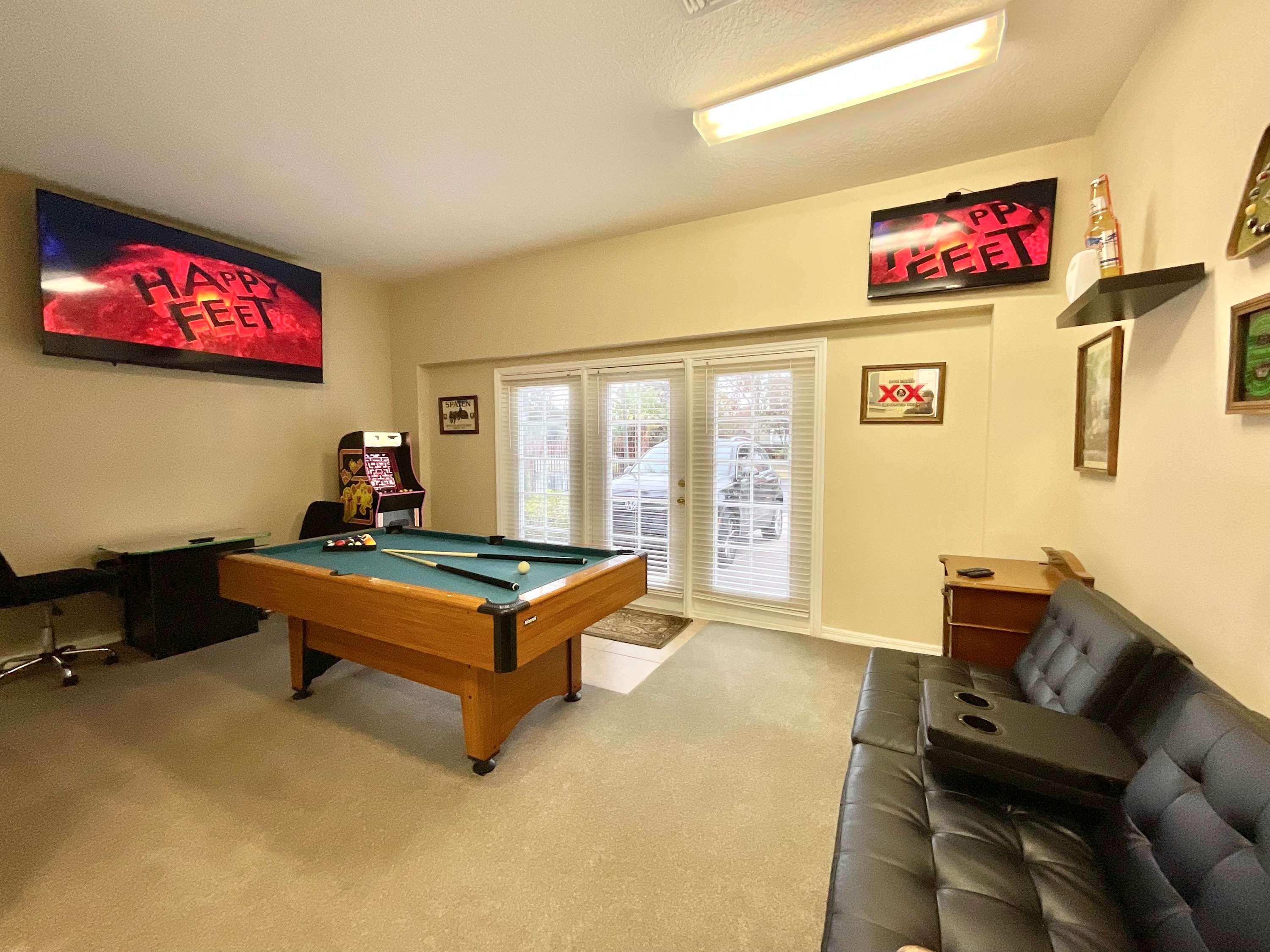 After an evening bite, let the adults claim the living room sofas and stream a favorite movie on the smart TV while the kids make their way to the game room. Between board games, arcade games, a pool table, two TVs, and a PlayStation 2, they’ll stay busy all night. For those who need to keep up with work during your time away, keep in mind there’s also a dedicated workspace in the game room to check those pesky emails or take a quick video call if needed.