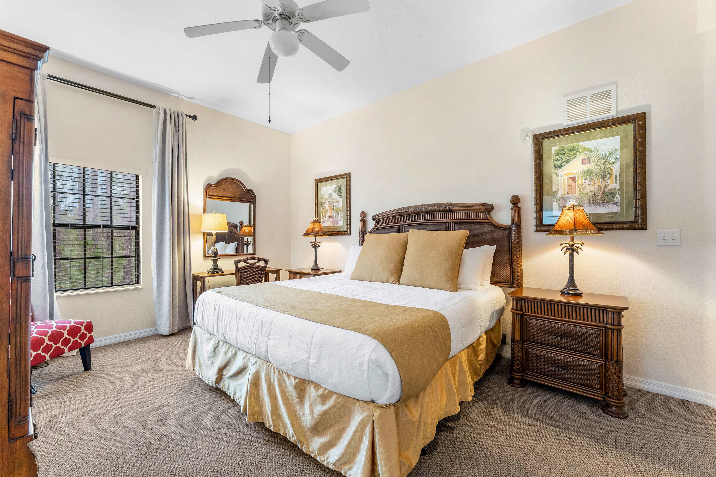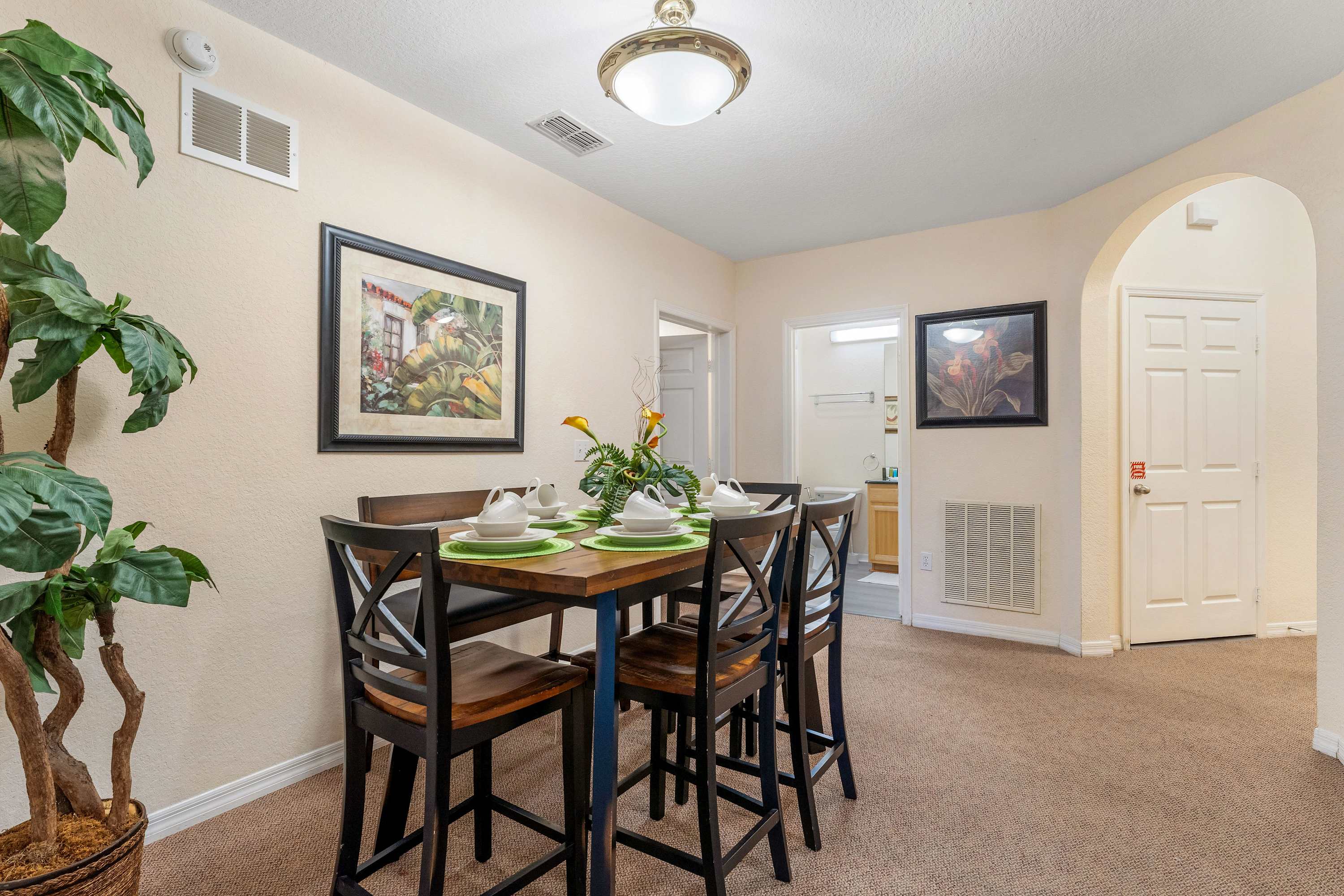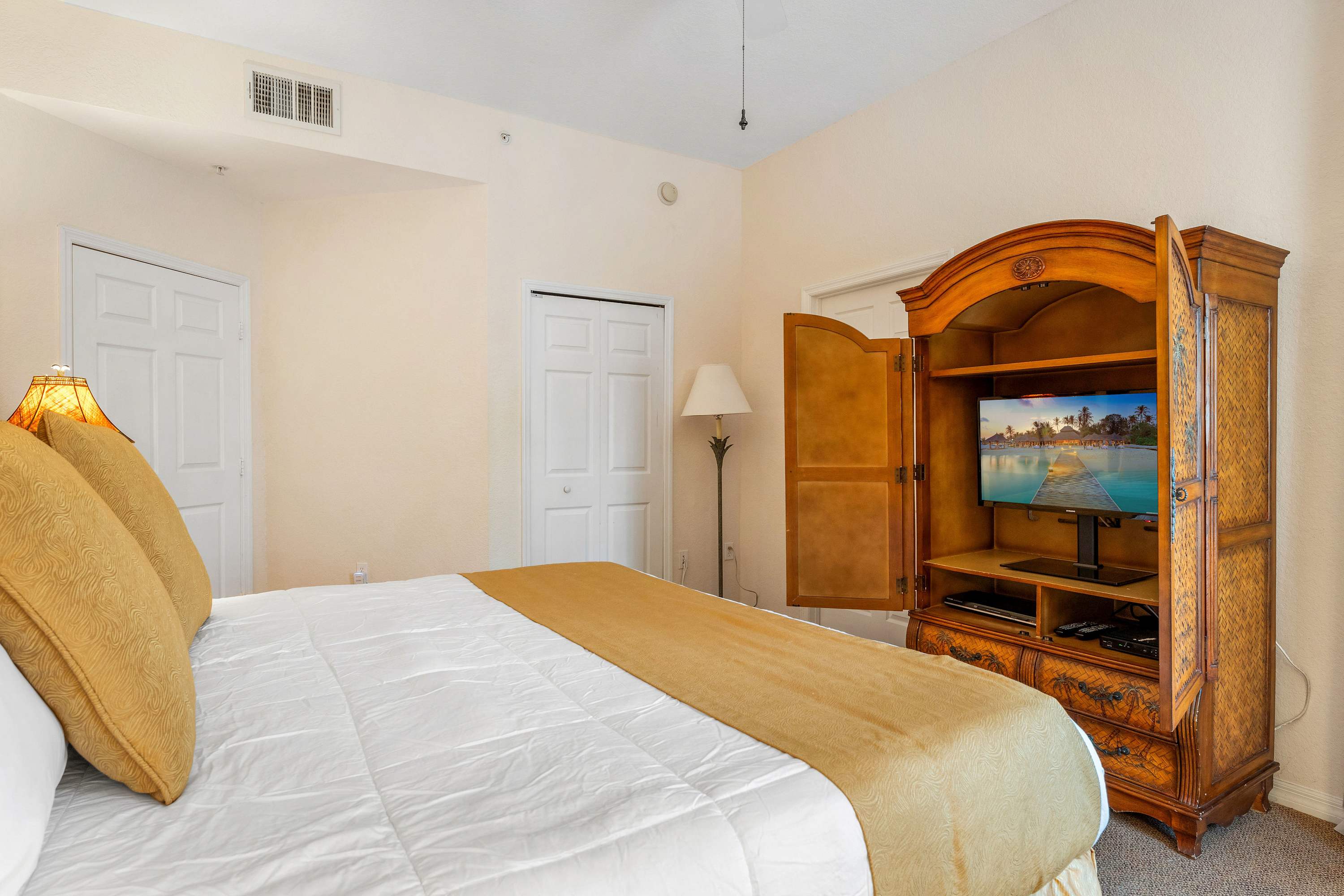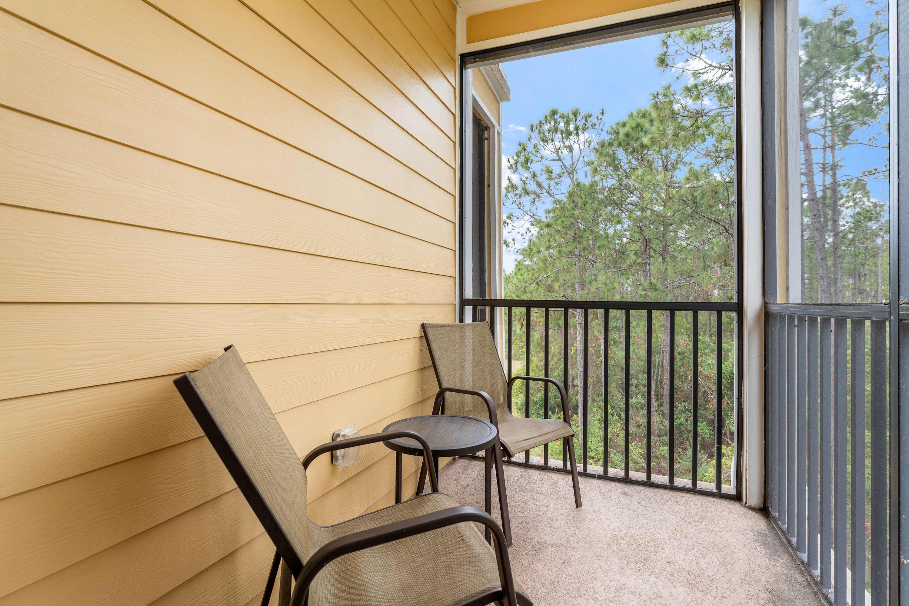 Indoors, tall ceilings sit atop bright and breezy spaces designed to help you relax and unwind after long days on your feet. The living room offers plush sofa seating and a large, mounted smart TV for keeping up with all your favorite stream-ready shows. Pop out to the screened-in balcony to enjoy morning and afternoon refreshments or a delicious meal al fresco. The fully equipped kitchen contains stainless steel appliances, glossy stone counters, and ample cabinetry stocked with crockery, cookware, utensils, and glassware. Families can enjoy meals together in the dining area, gathered around the chic high-top table with seating for the whole crew.