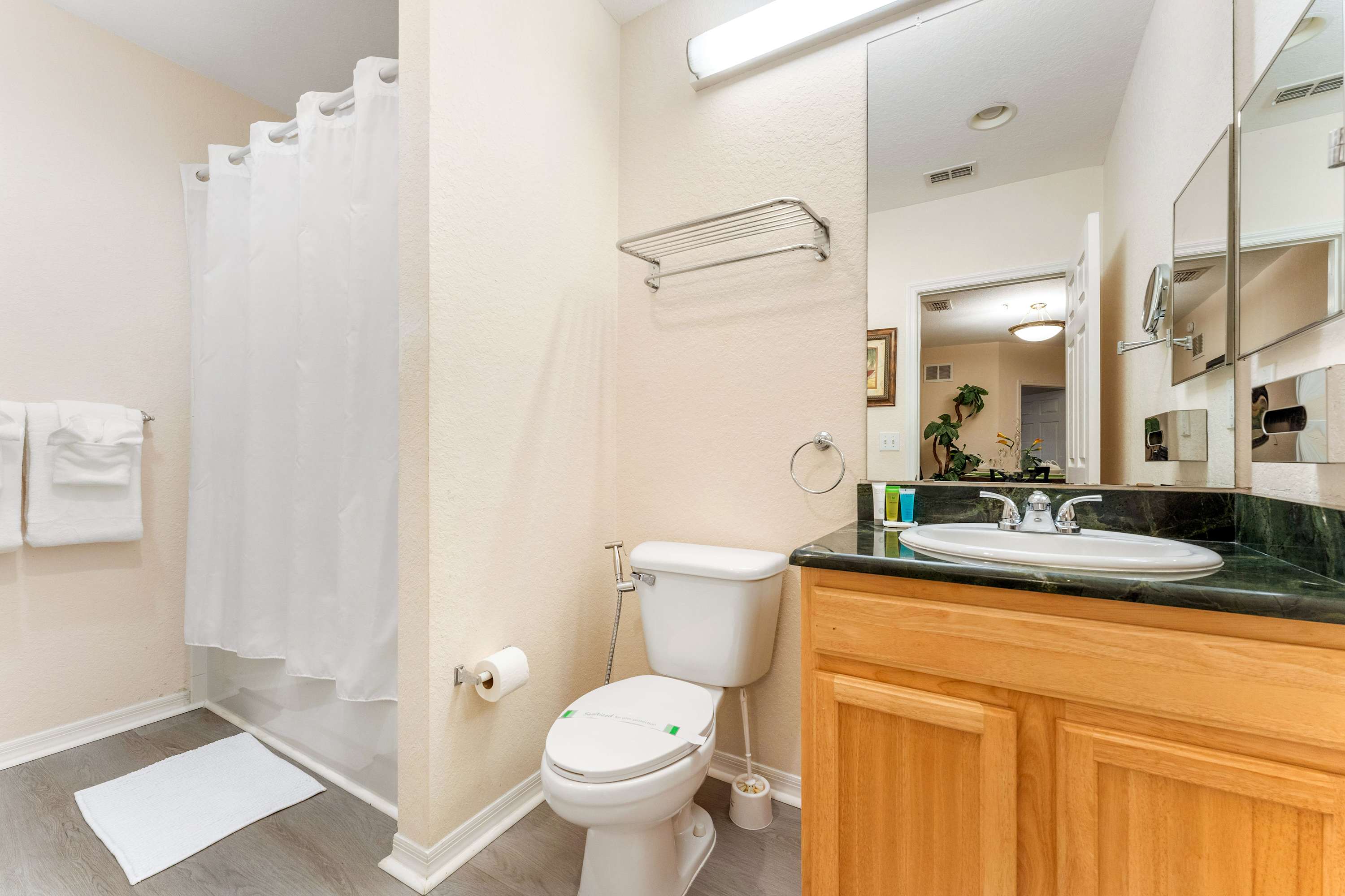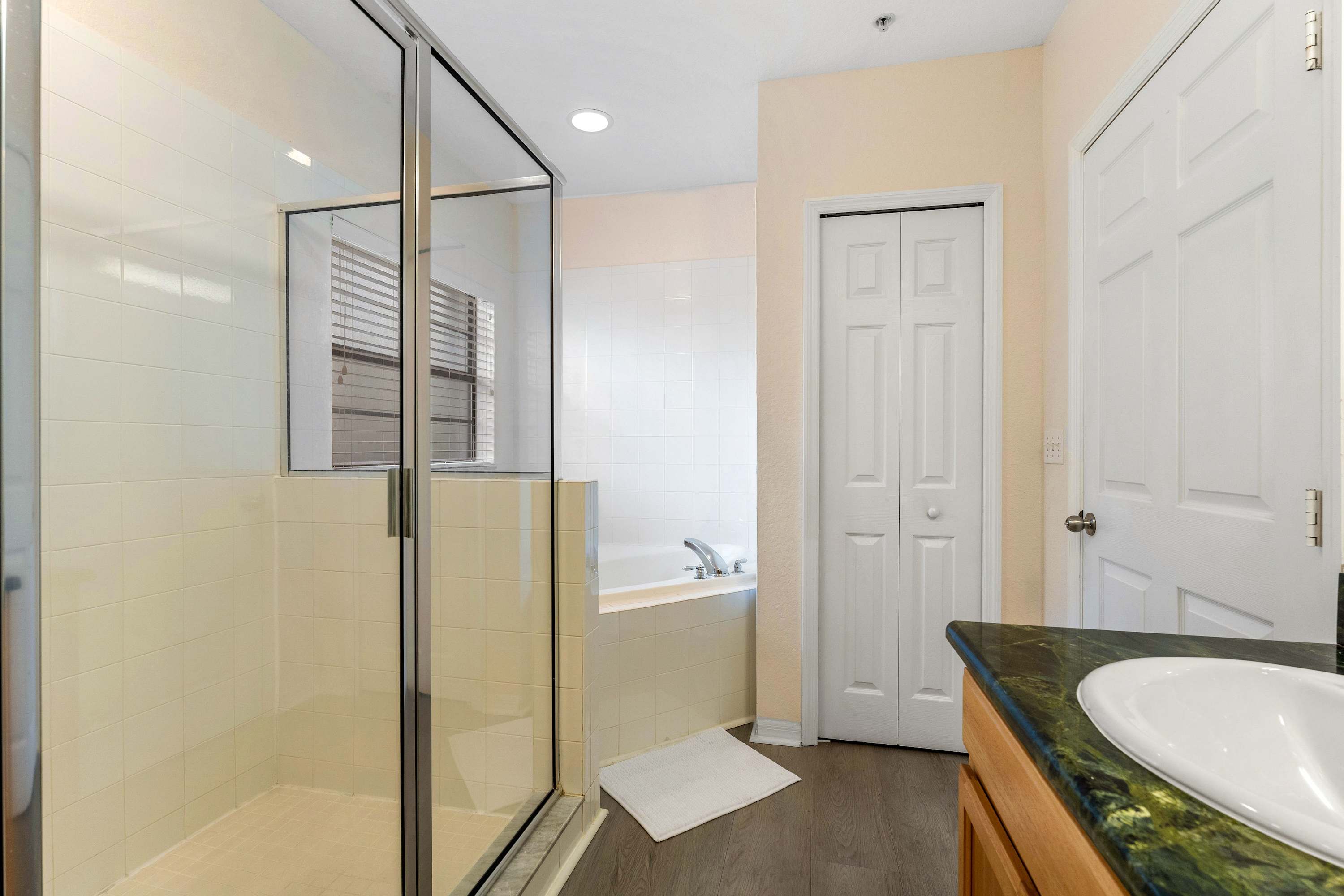 The home also includes an additional full guest bathroom with a single vanity and shower/tub combo.