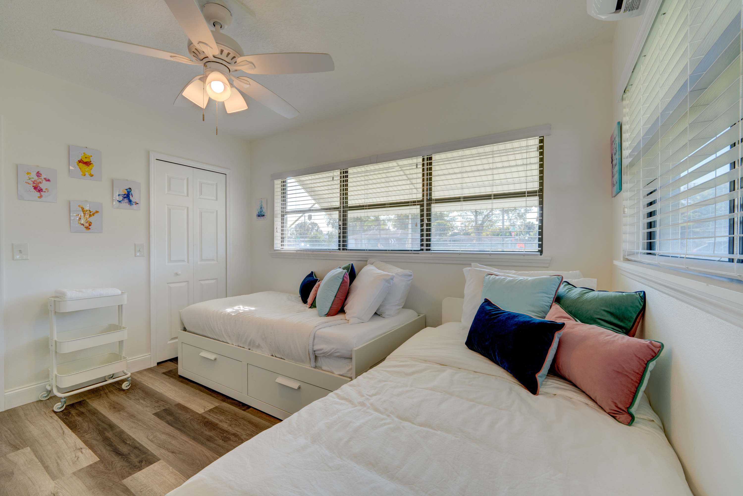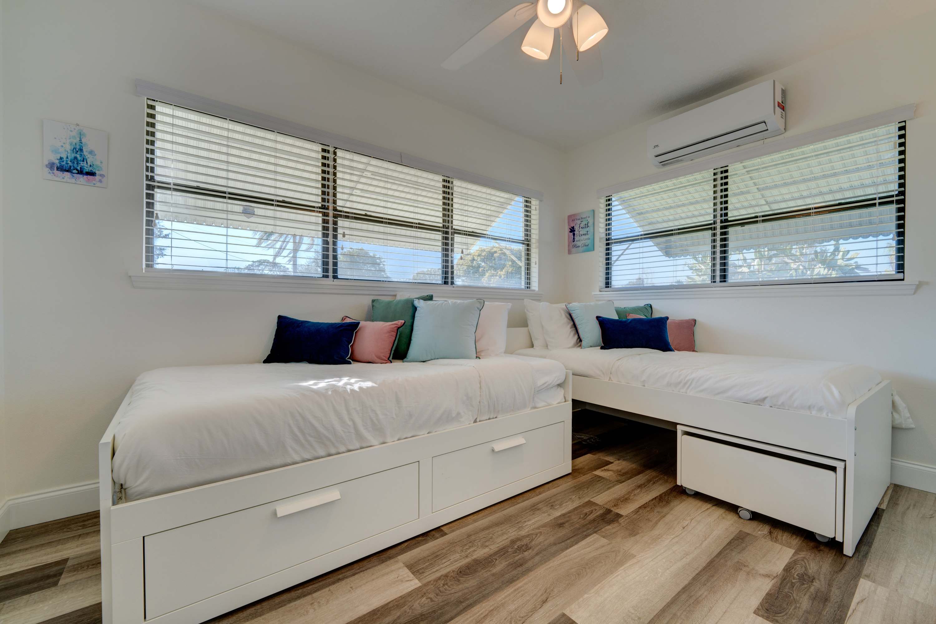 Bedroom #3 features two twin-size beds with a trundle that can be converted into a king-size bed, along with a smart TV. Additionally, there is an under-bed rolling storage unit that can be used as a coffee or game table.