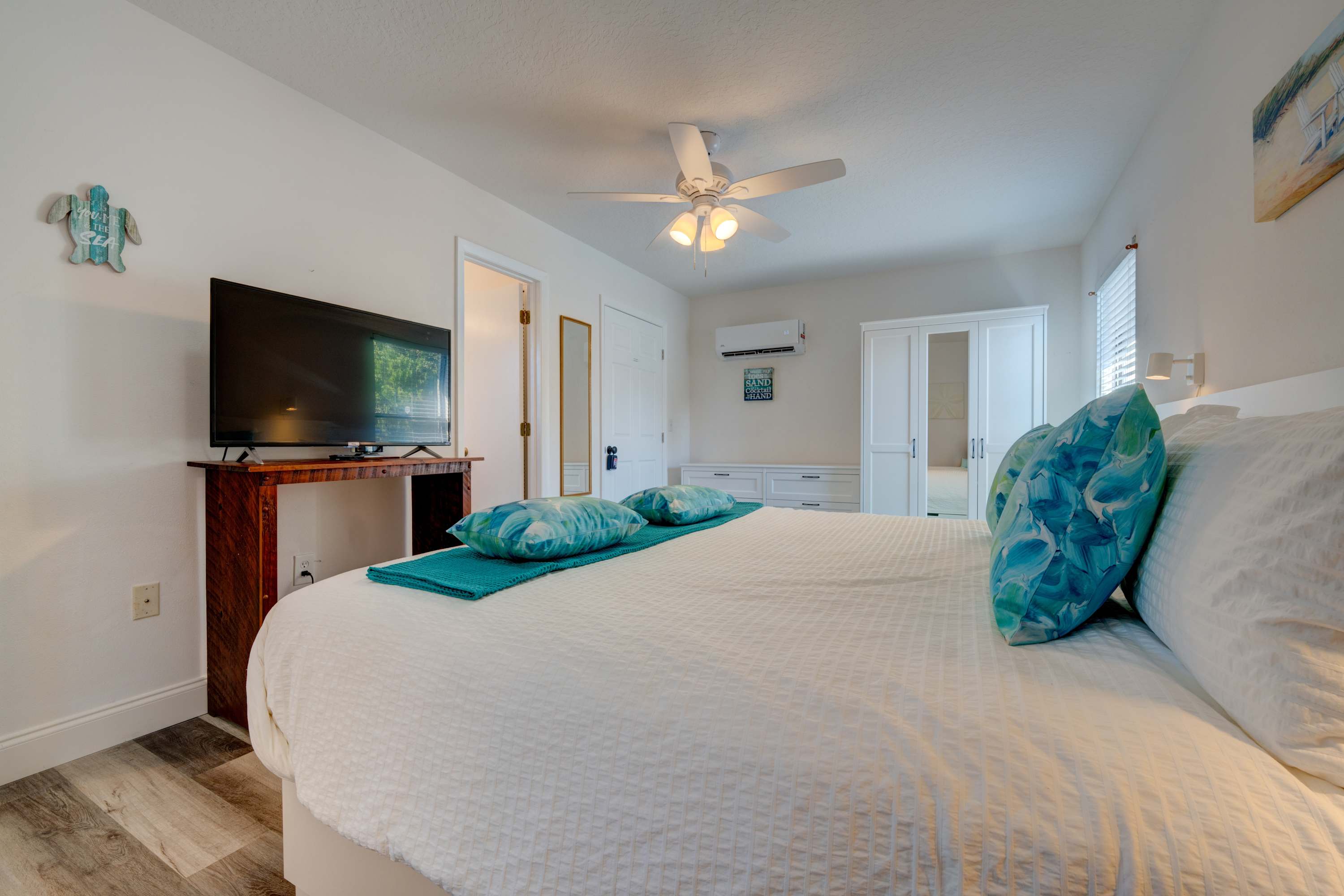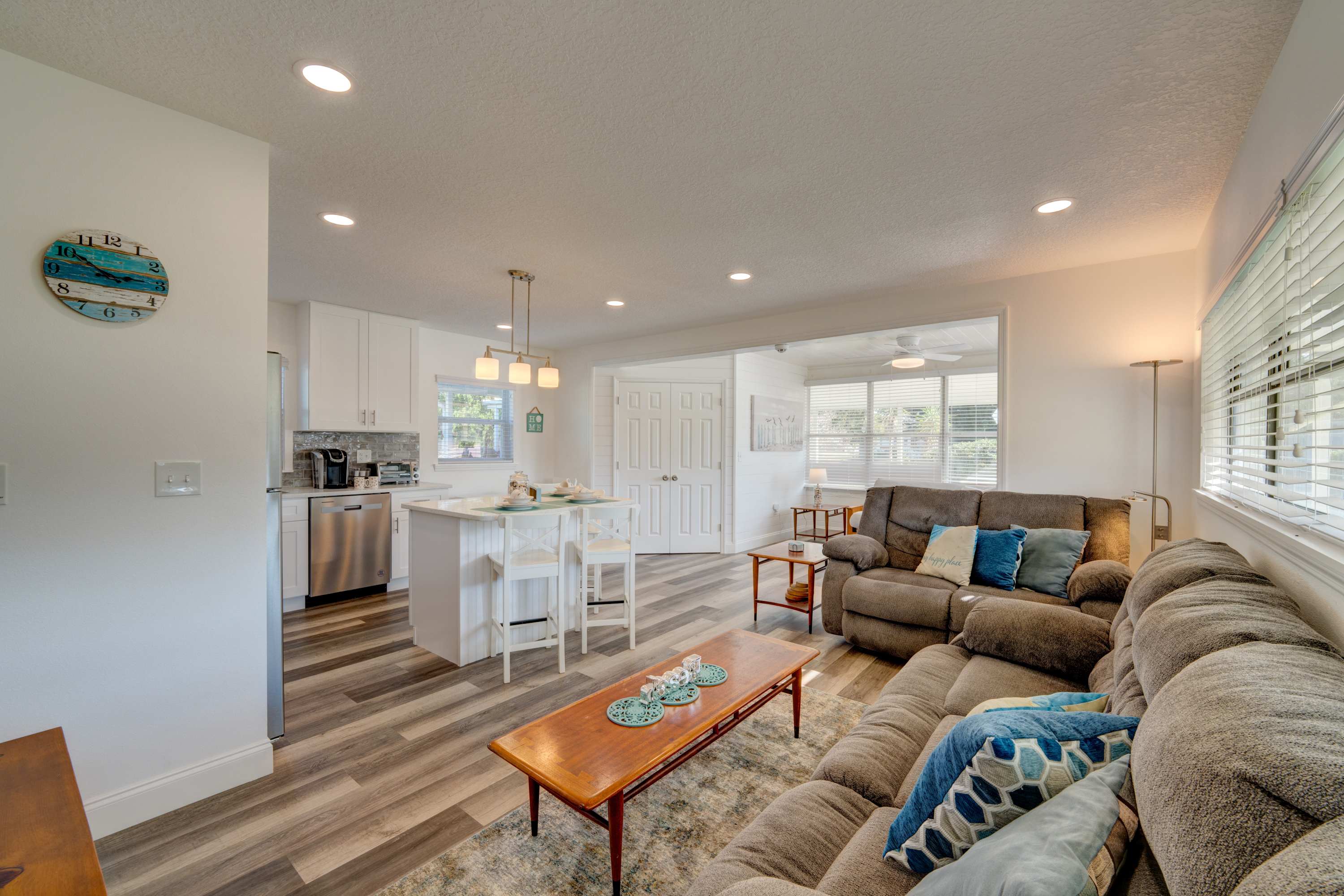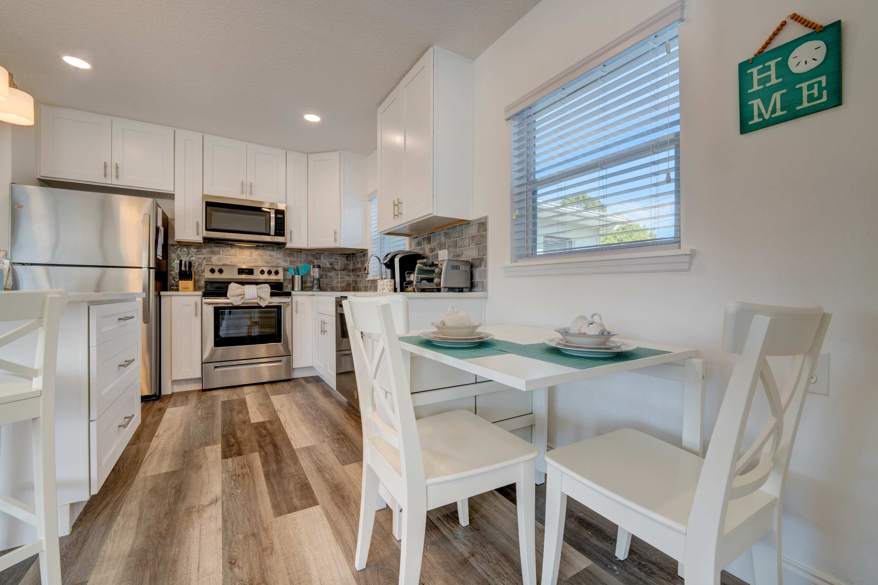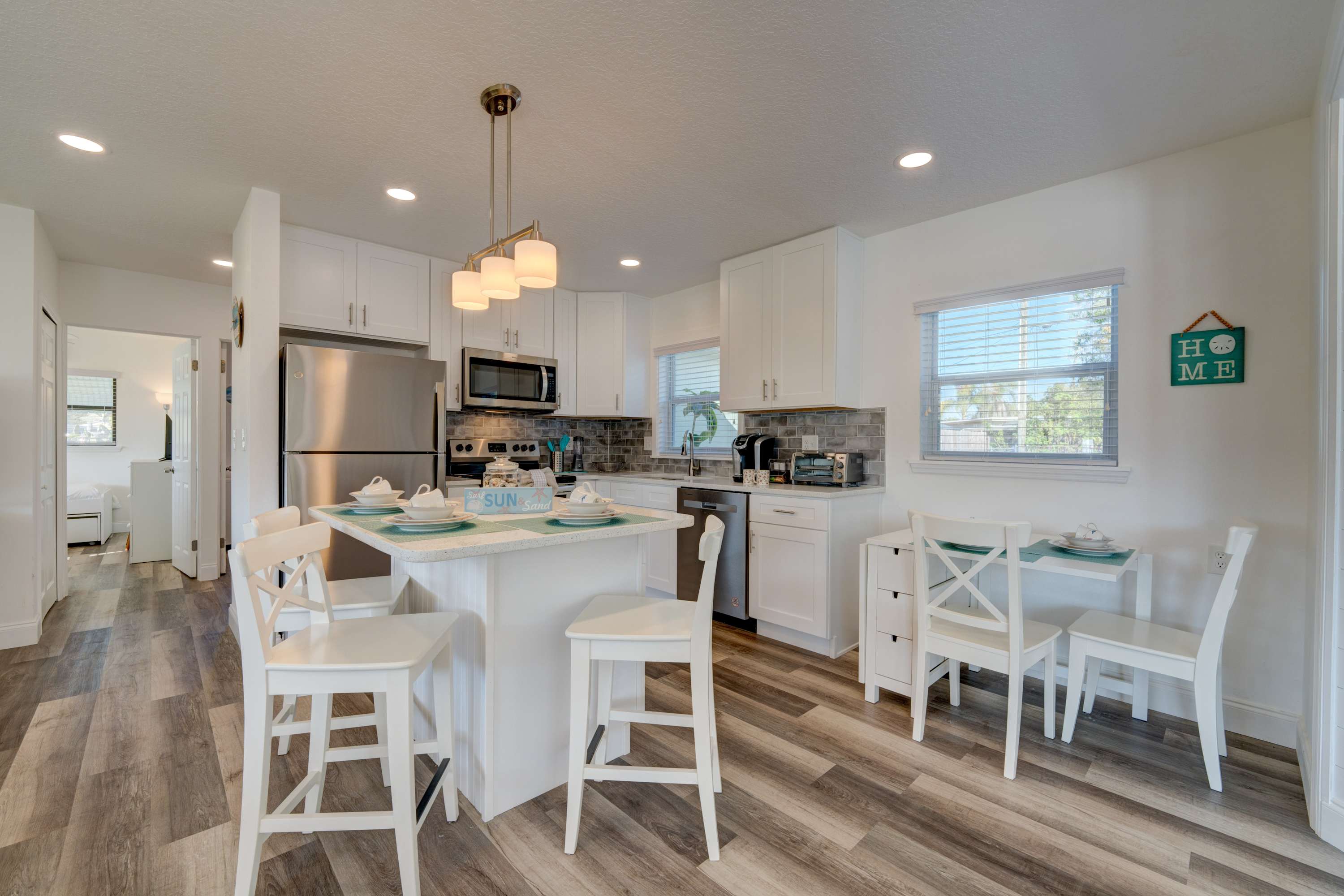 As a beloved family home for over thirty years, you’ll find all the usual comforts in this home-away-from-home. The fully equipped kitchen showcases stainless steel appliances, glossy quartz counters, and sleek white cabinetry stocked with cookware and dining ware. Snag a high-top stool at the counter to snack on a spread of appetizers or enjoy a cozy meal with your loved one at the kitchen nook for up to four.