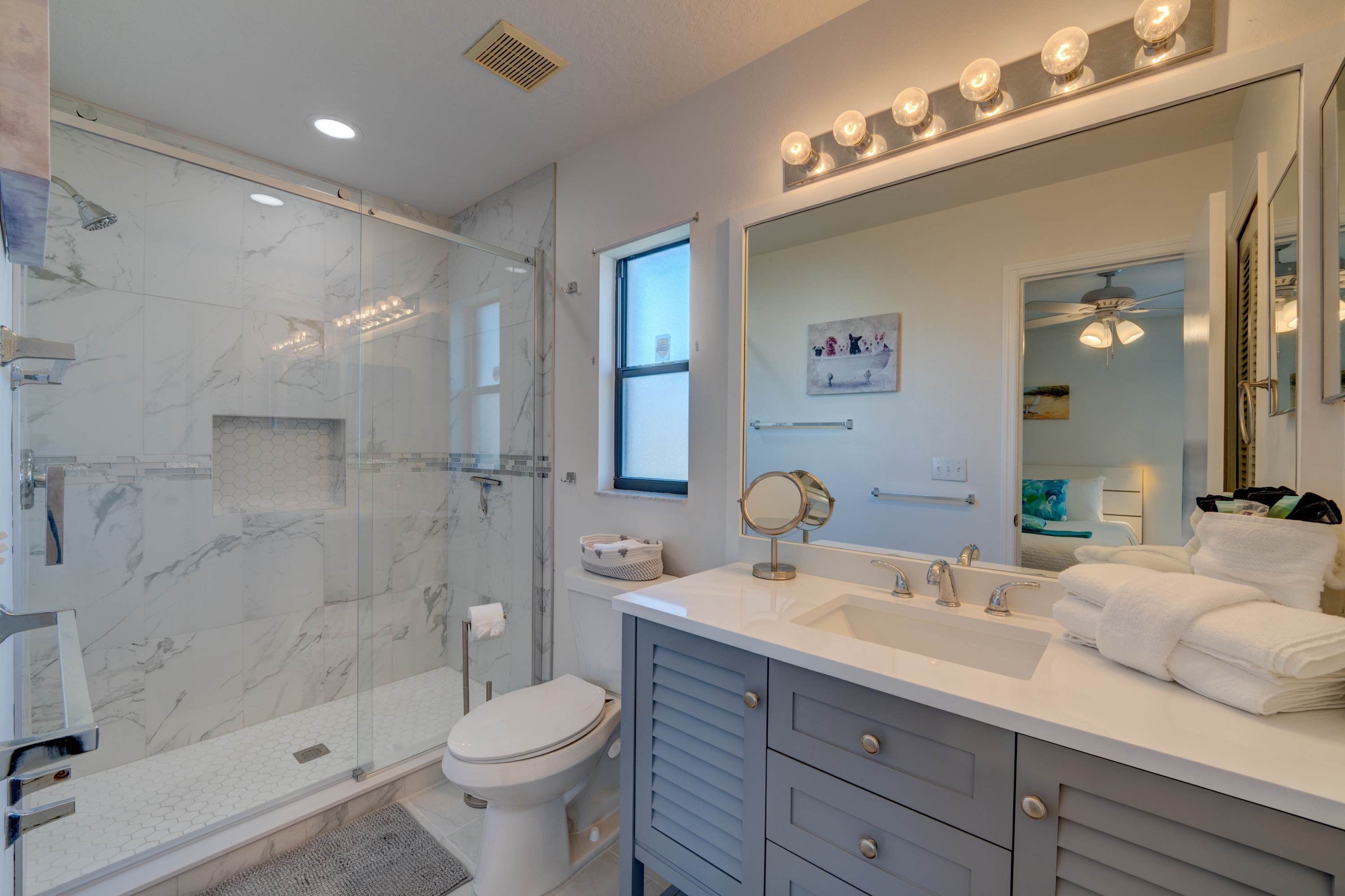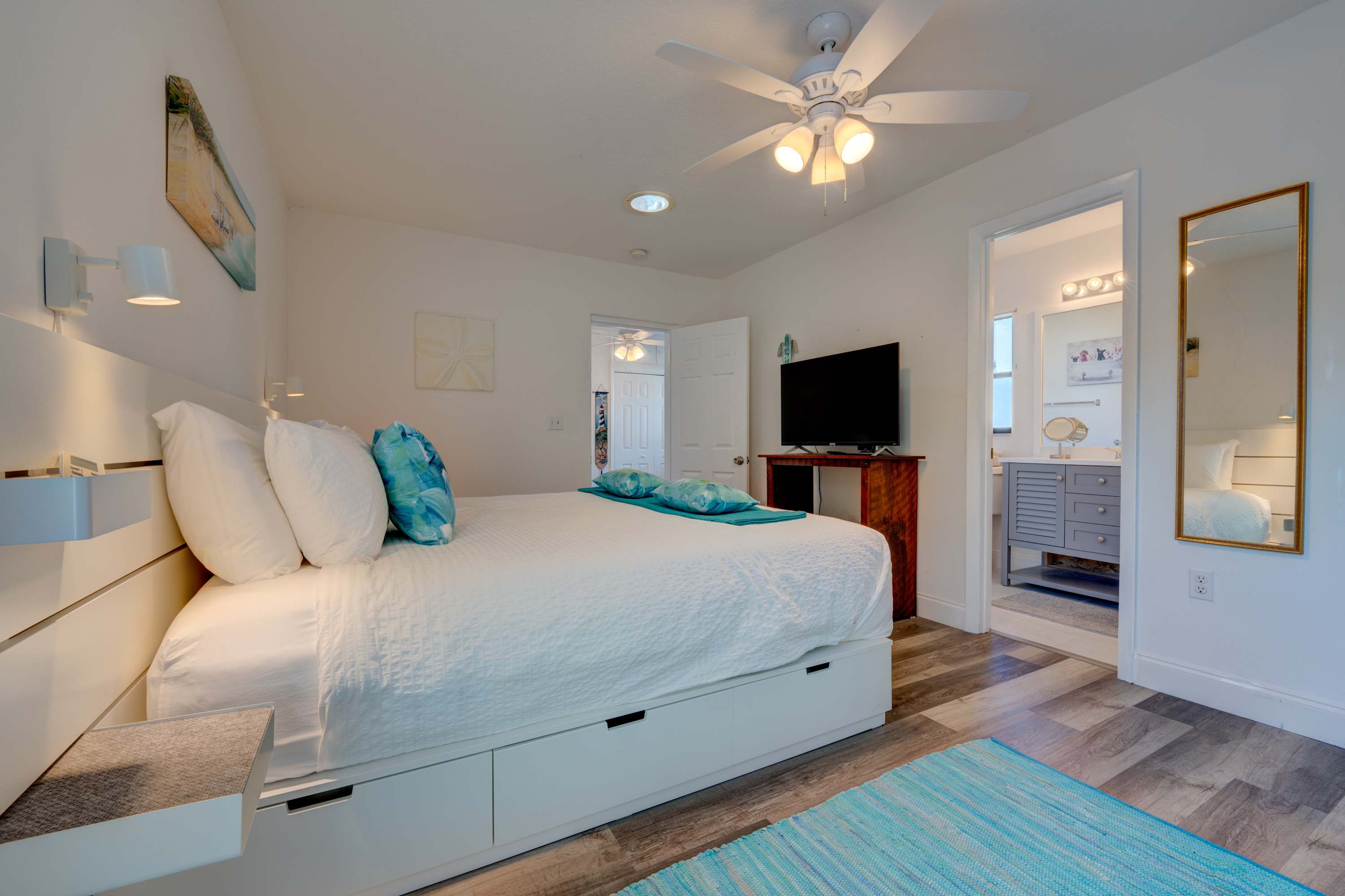 Bedroom #1 includes a king size bed, smart TV, and ensuite bathroom with a single vanity and a walk-in glass shower.
