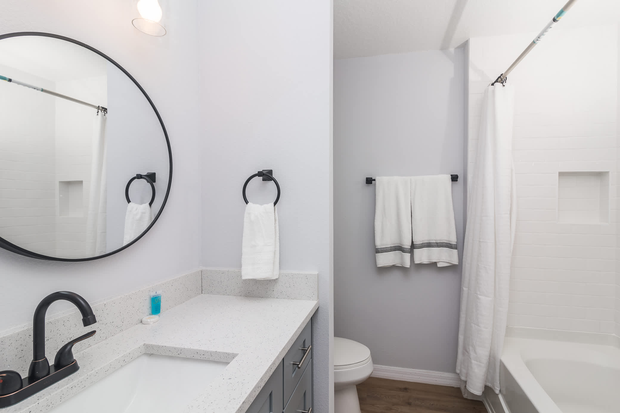 An additional full bathroom with shower/tub combo is fully stocked to accommodate the guests in the first 2 bedrooms.
