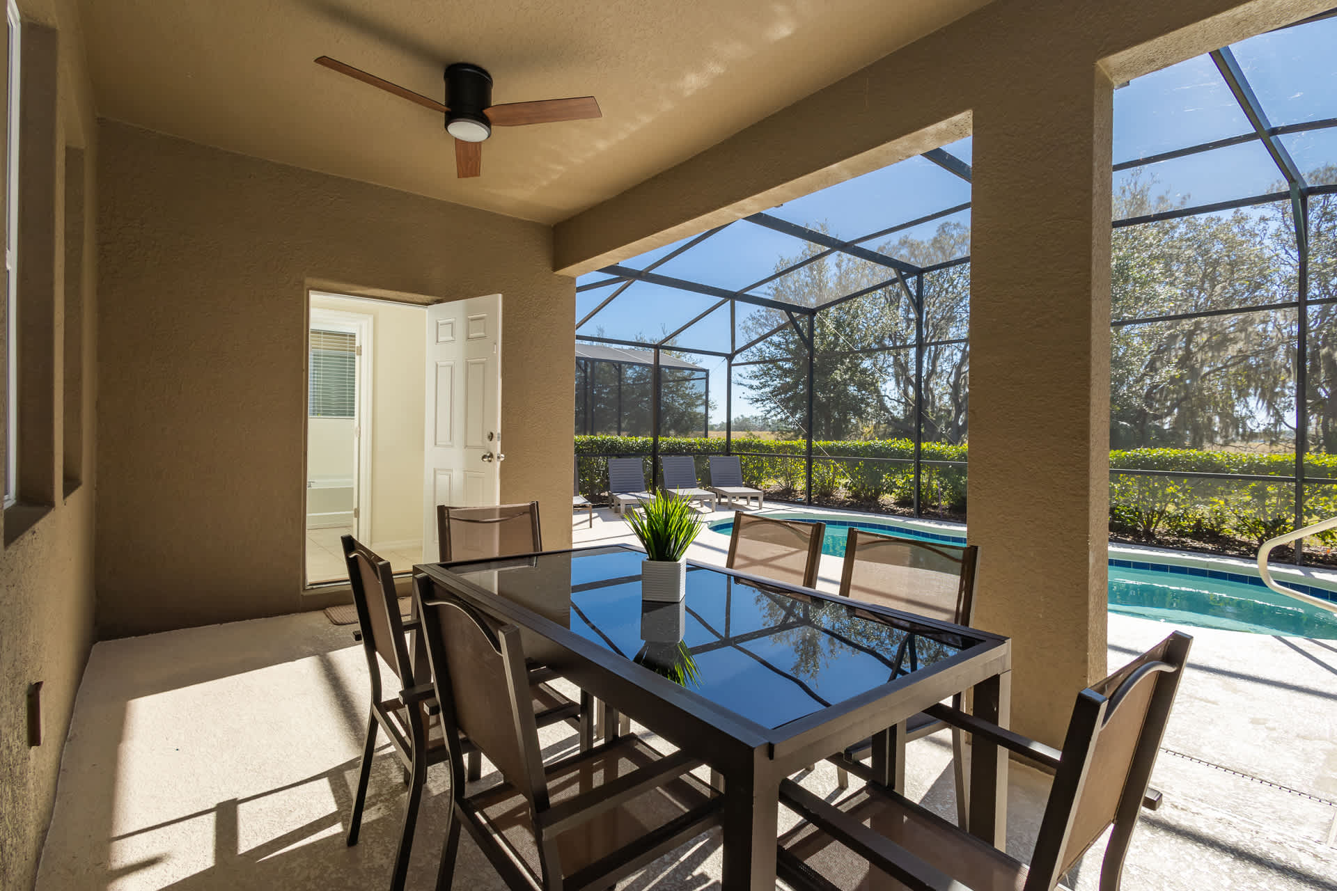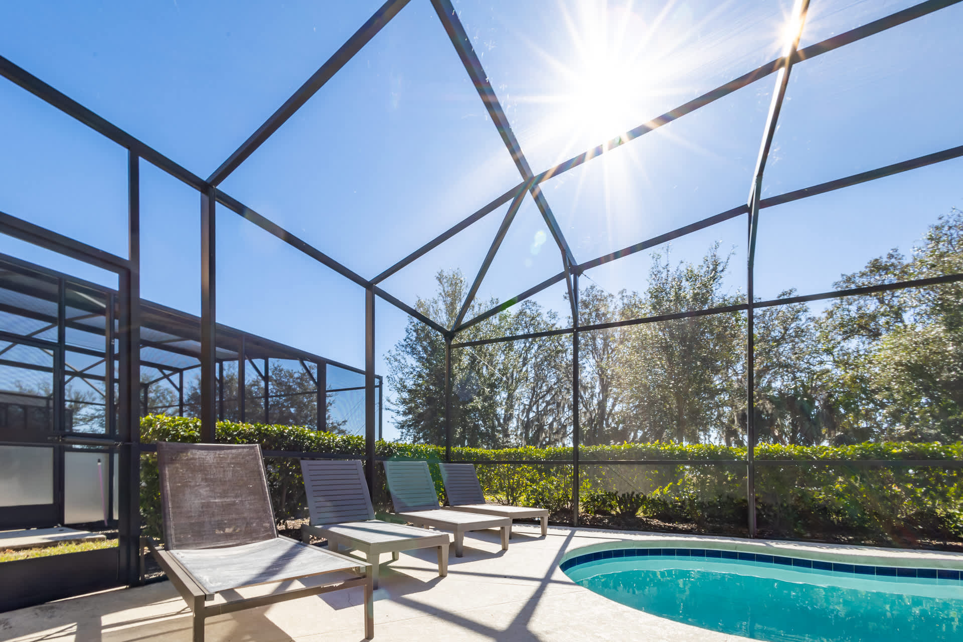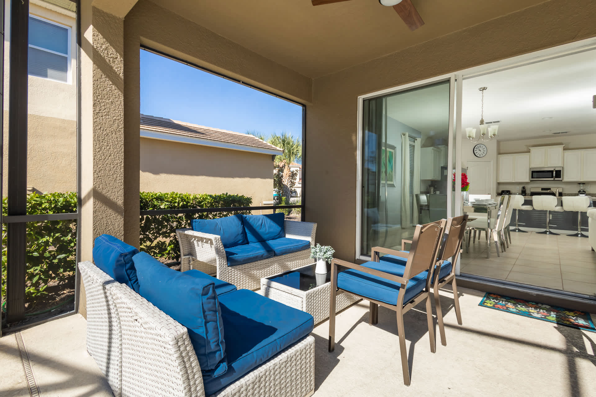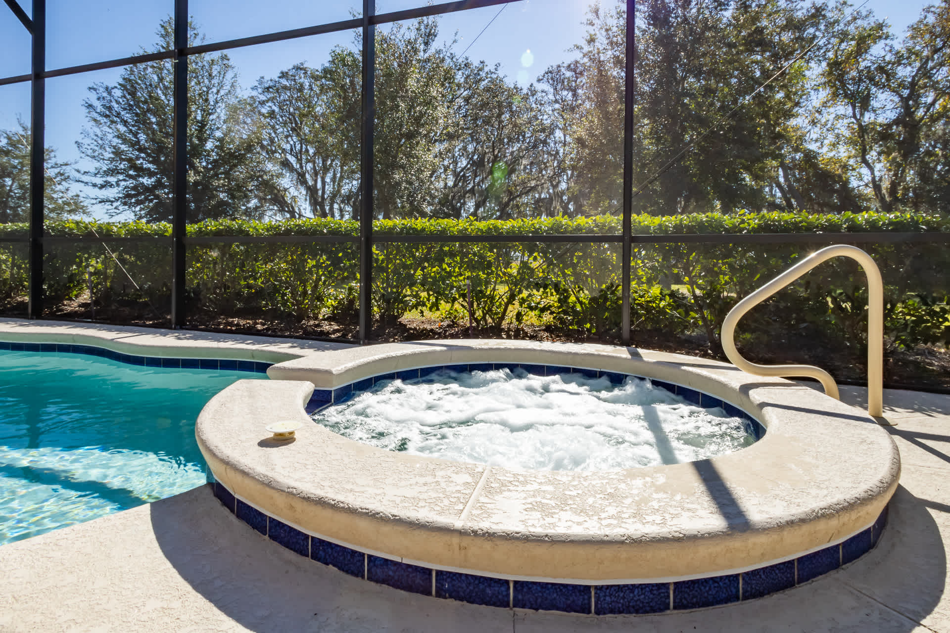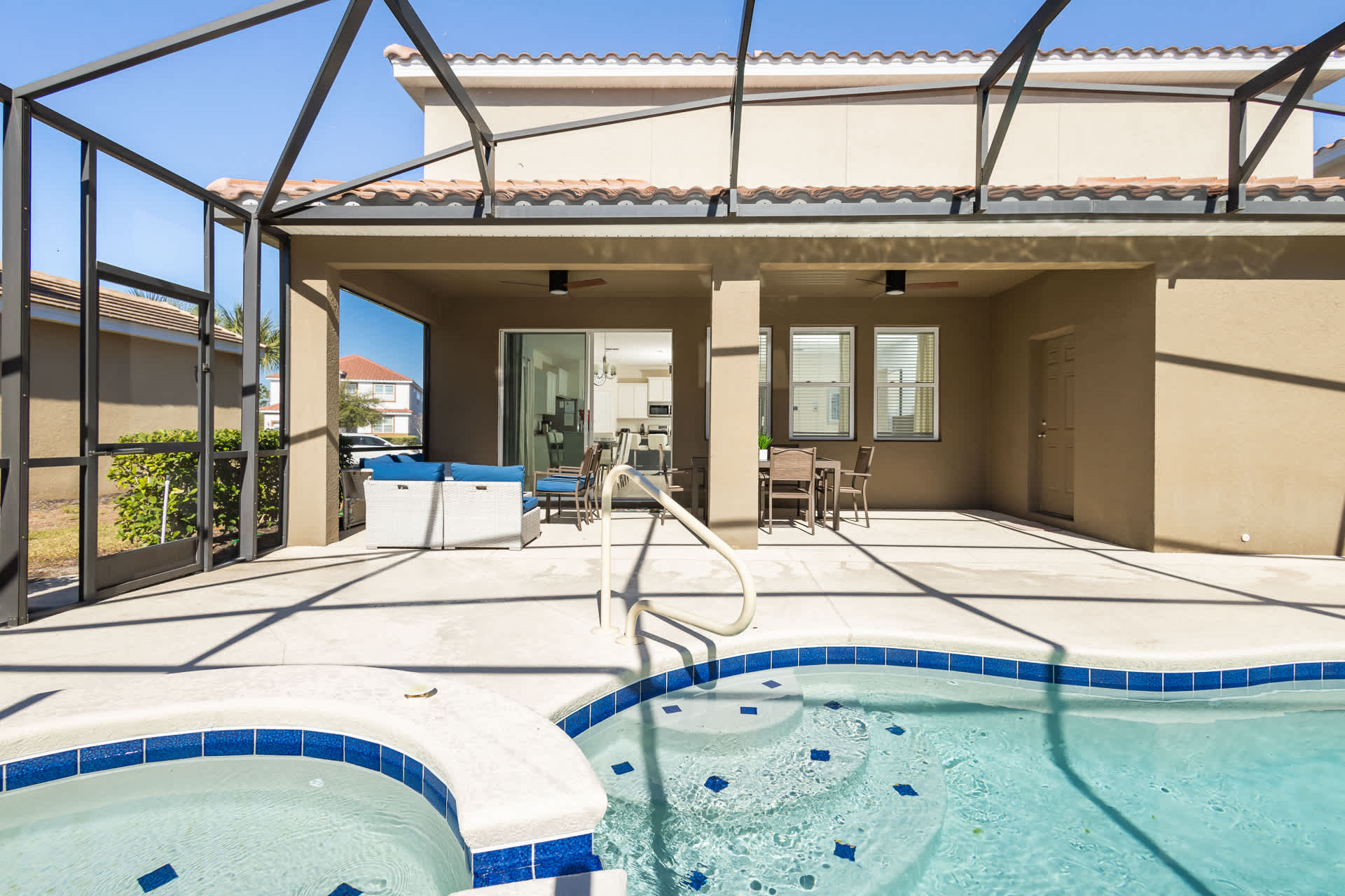 At the home, the spacious, full-screened patio provides a relaxing space to unwind after a day of exploring the nearby attractions, with comfortable chaise and sofa seating and plenty of spots to enjoy the beautiful Florida weather. With no neighbors to the rear of the patio, privacy is in abundance while you splash and play in the sparkling inground pool or soak your tired muscles in the overflowing spa.
