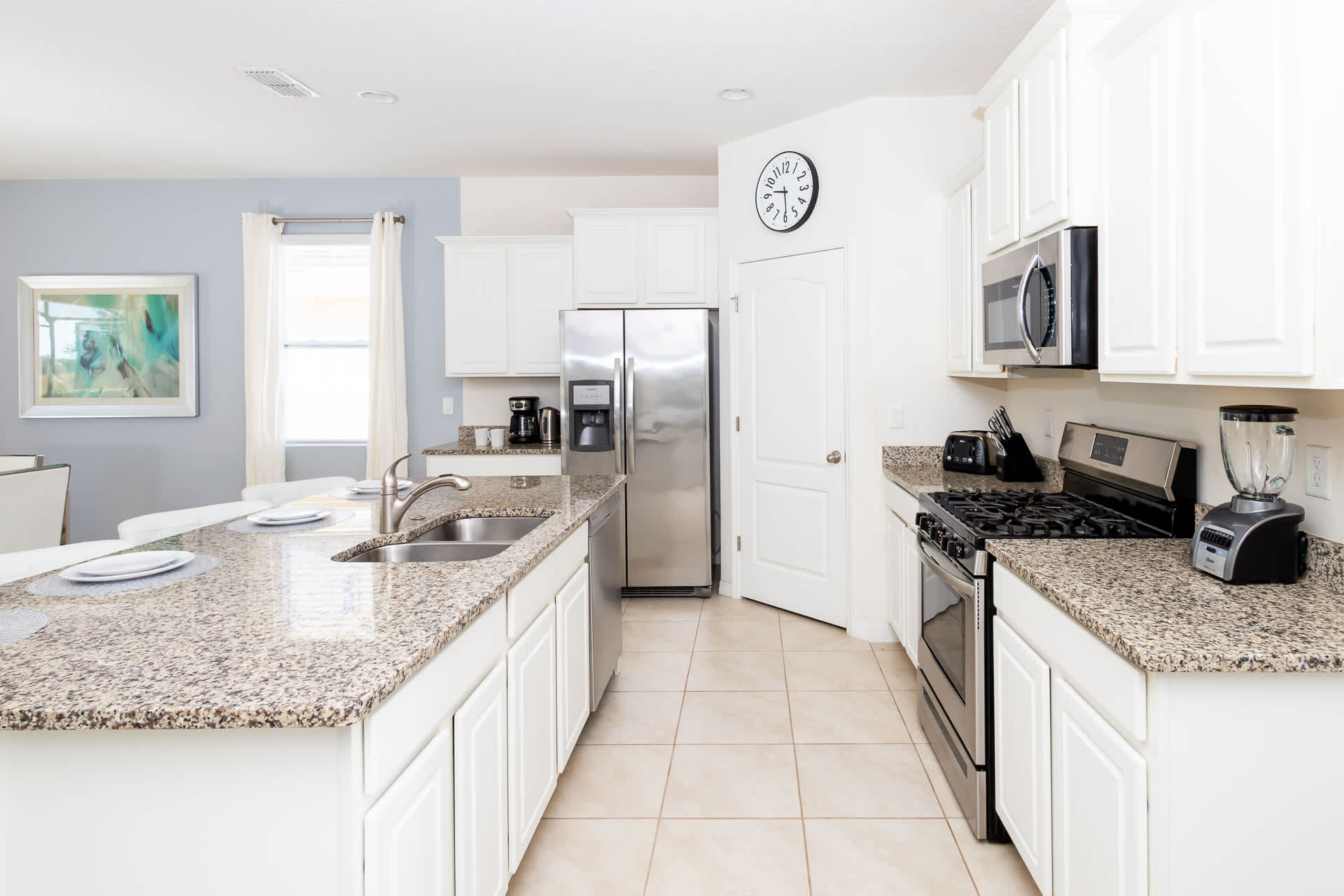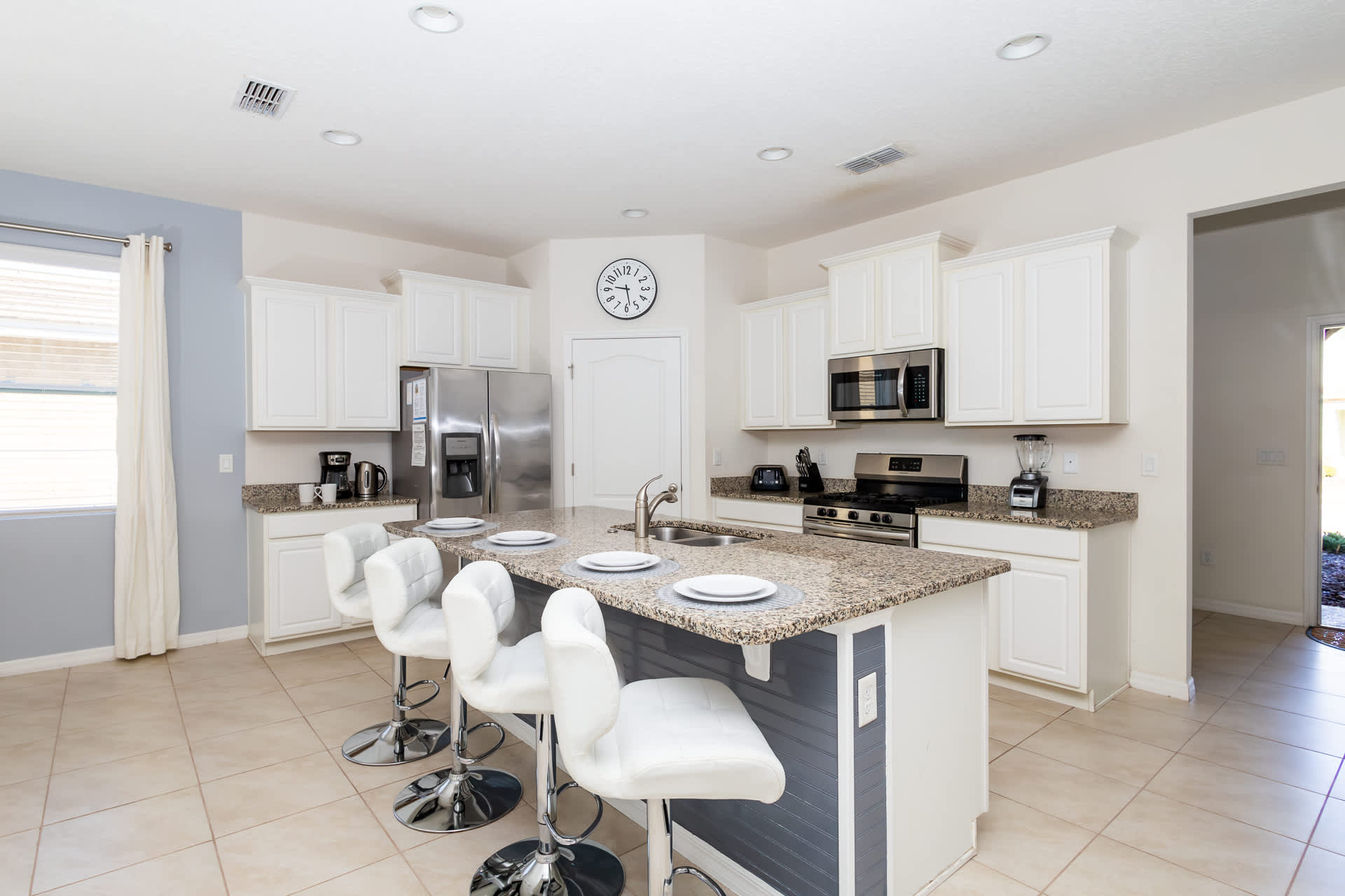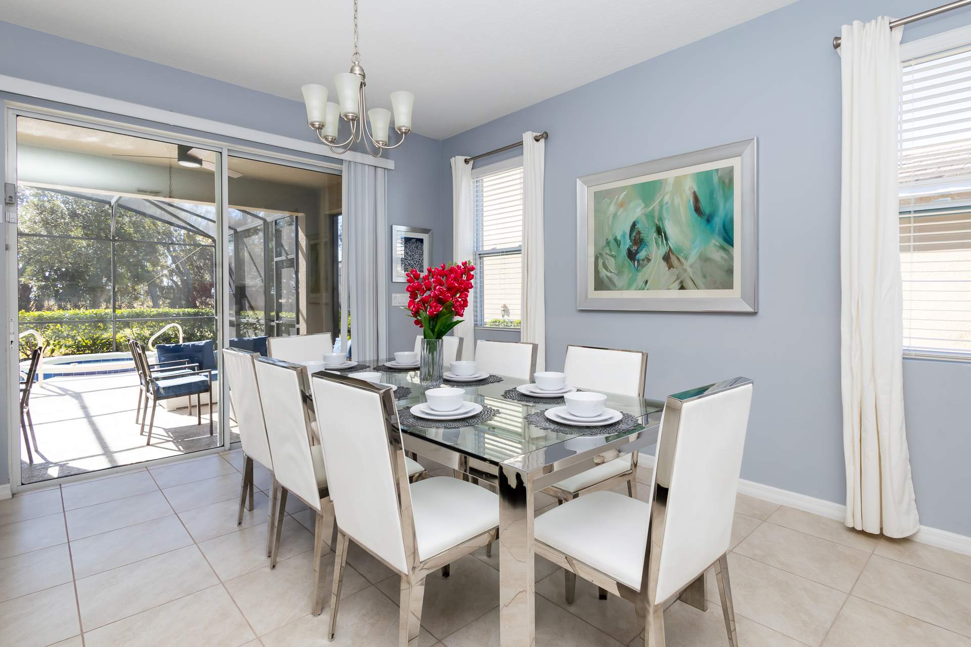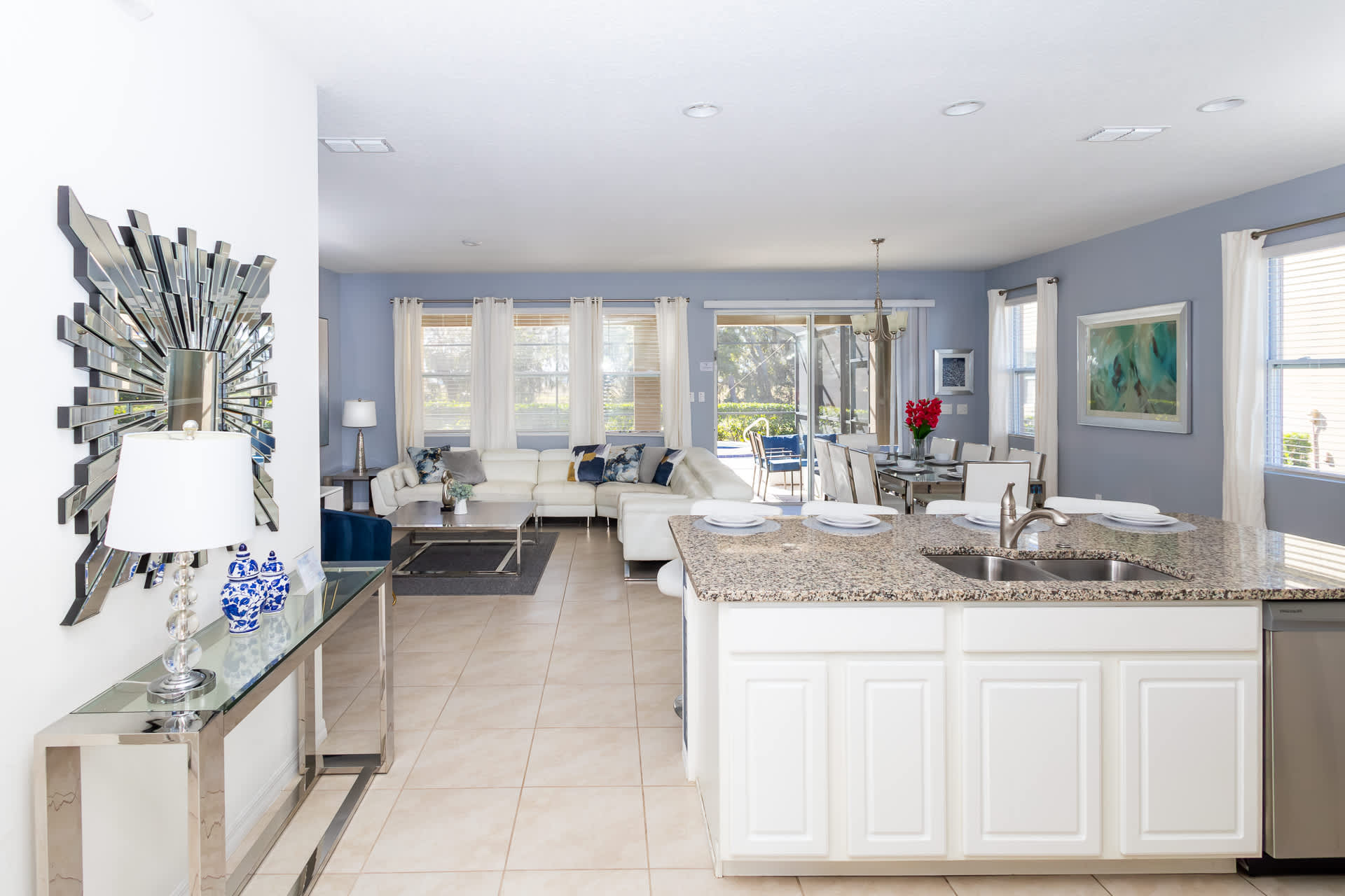 At the home, the spacious, full-screened patio provides a relaxing space to unwind after a day of exploring the nearby attractions, with comfortable chaise and sofa seating and plenty of spots to enjoy the beautiful Florida weather. With no neighbors to the rear of the patio, privacy is in abundance while you splash and play in the sparkling inground pool or soak your tired muscles in the overflowing spa.