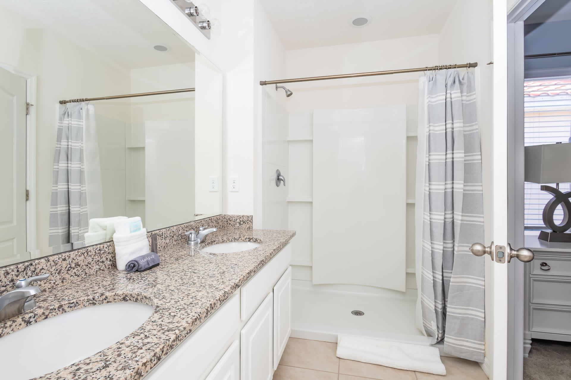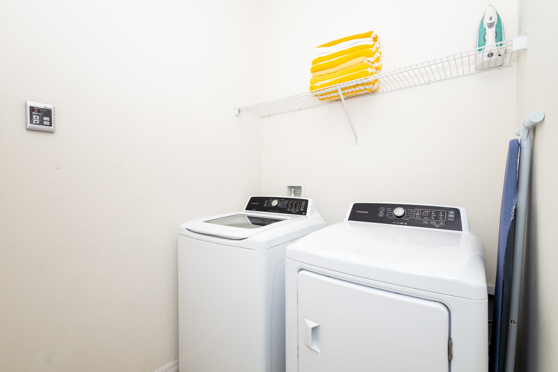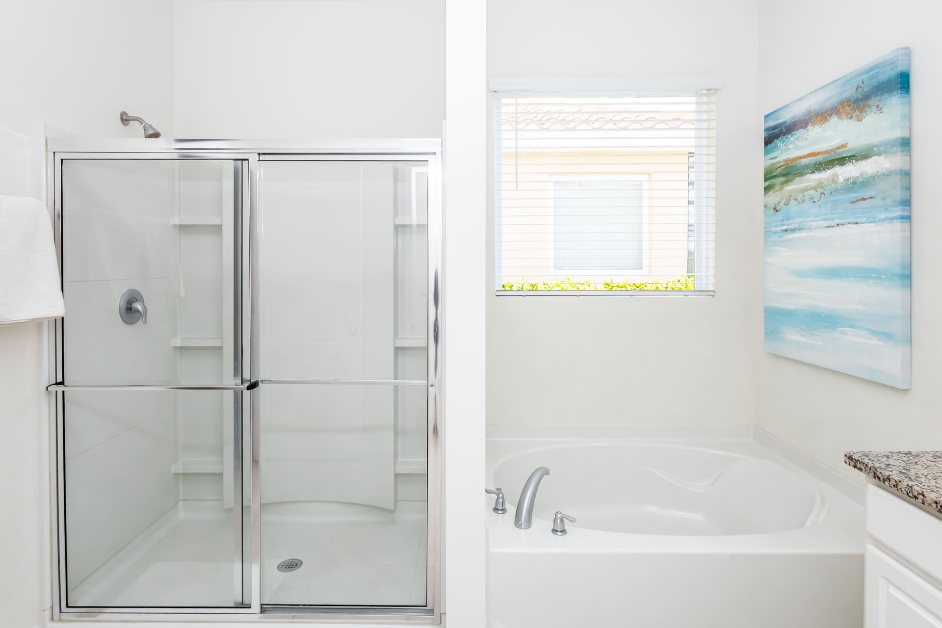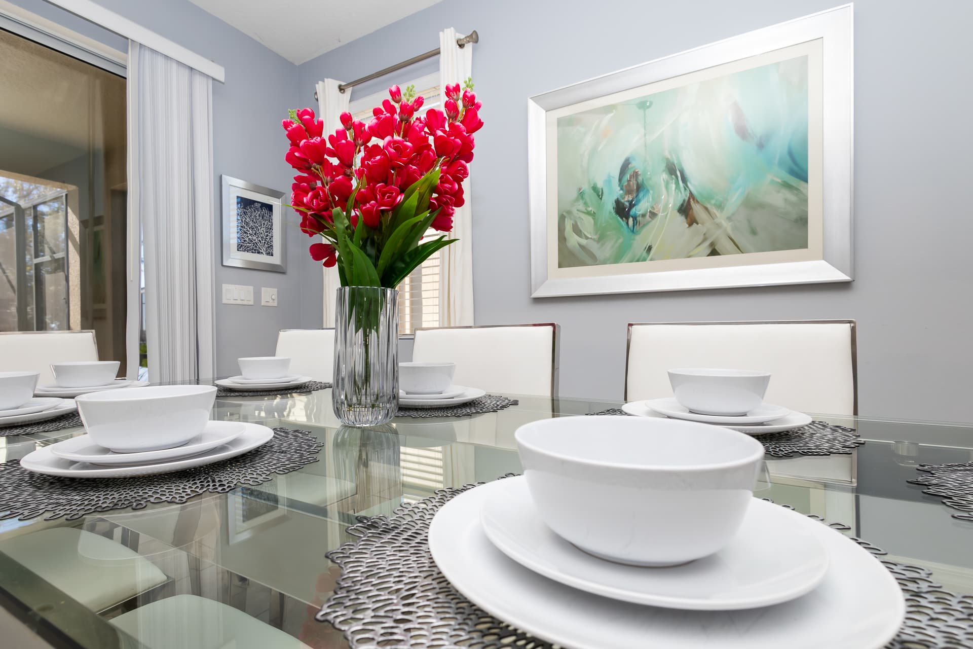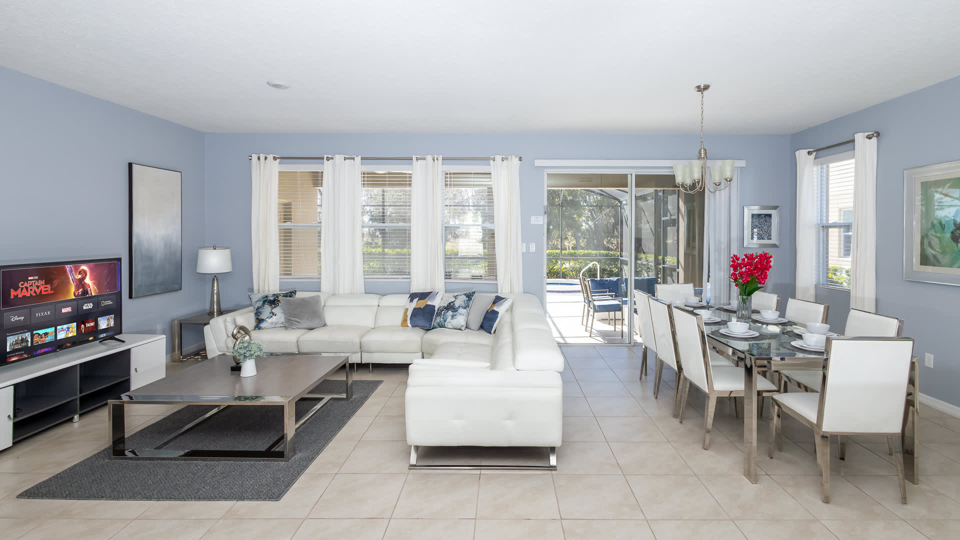 At the home, the spacious, full-screened patio provides a relaxing space to unwind after a day of exploring the nearby attractions, with comfortable chaise and sofa seating and plenty of spots to enjoy the beautiful Florida weather. With no neighbors to the rear of the patio, privacy is in abundance while you splash and play in the sparkling inground pool or soak your tired muscles in the overflowing spa.