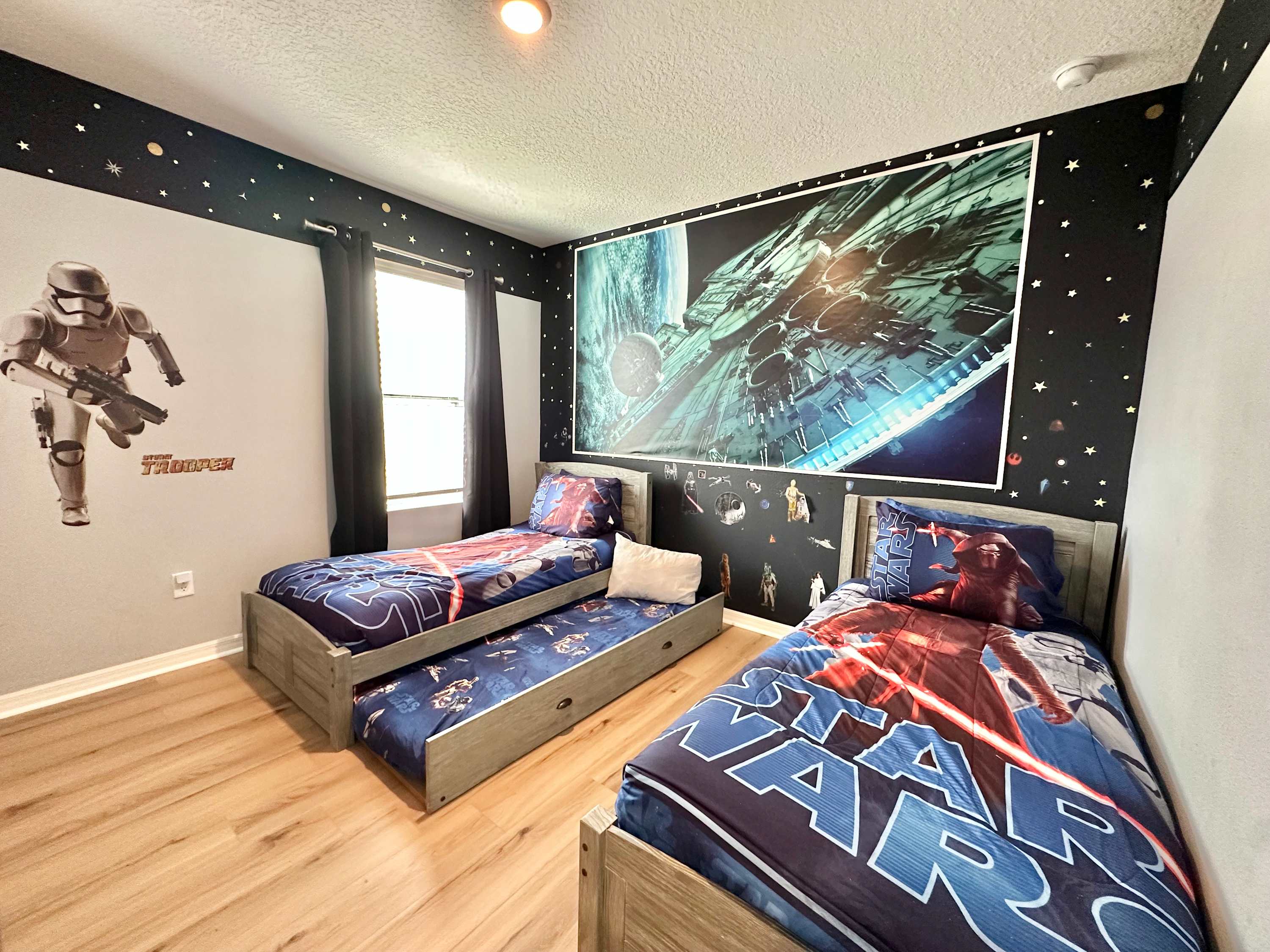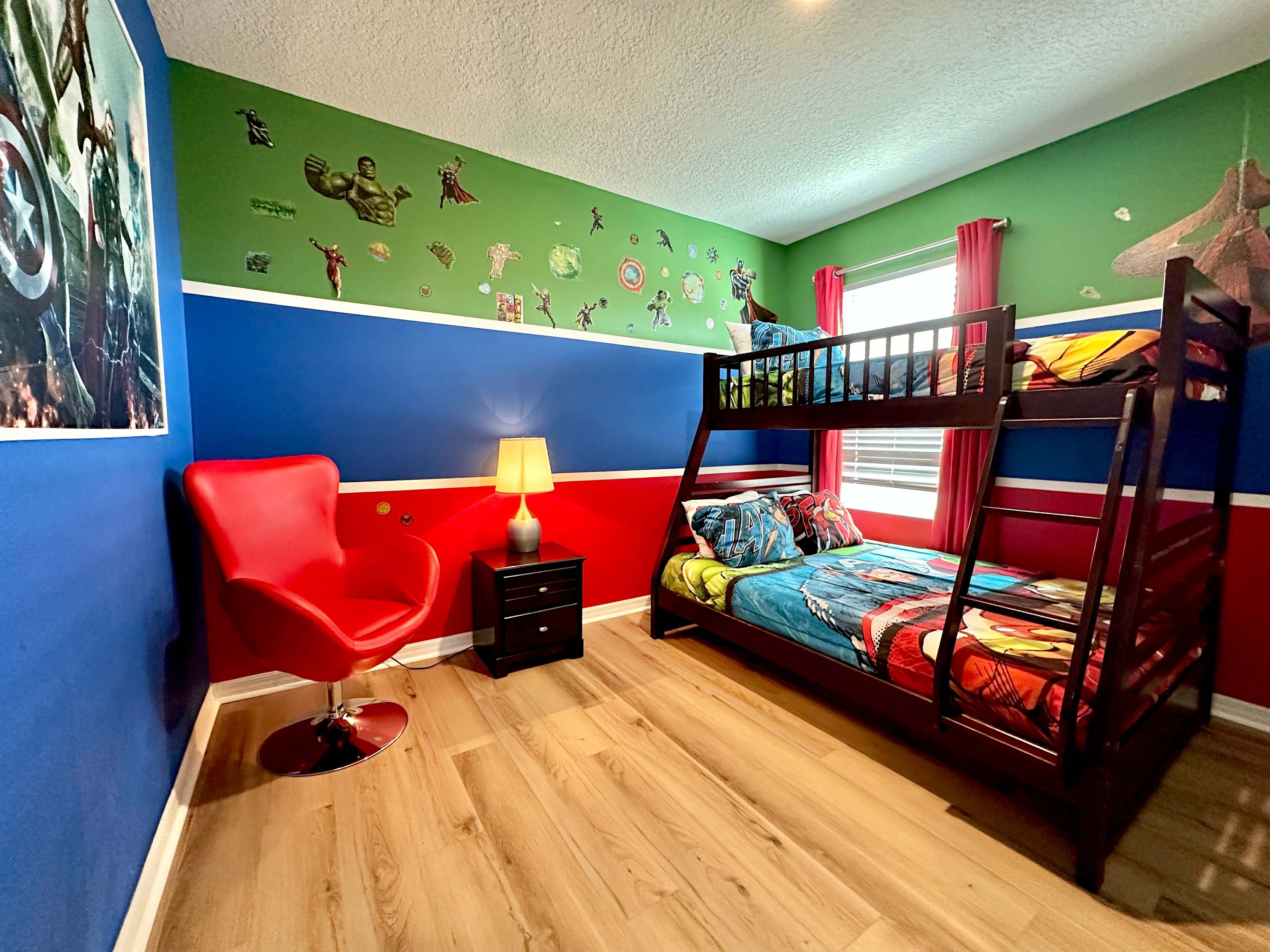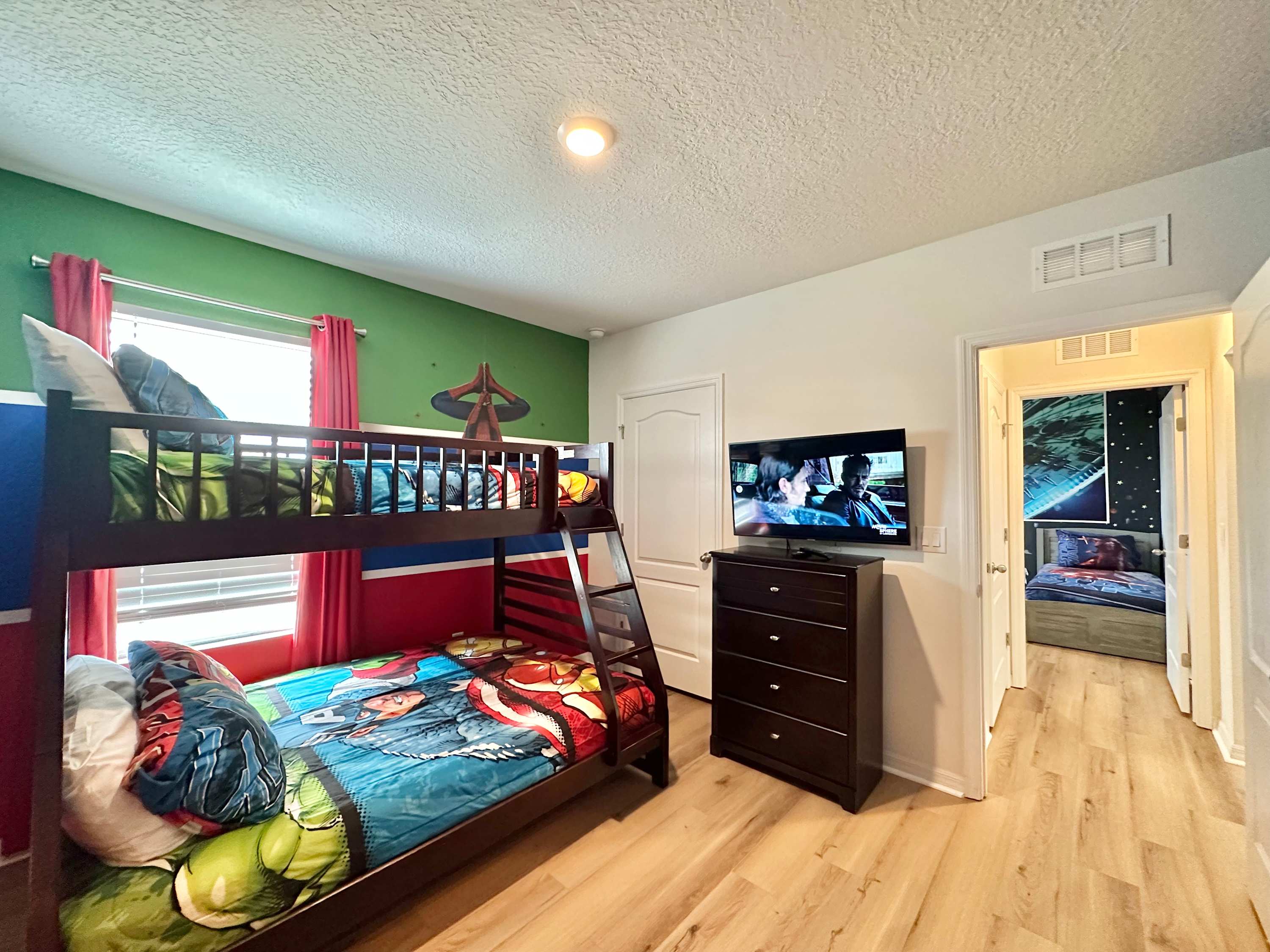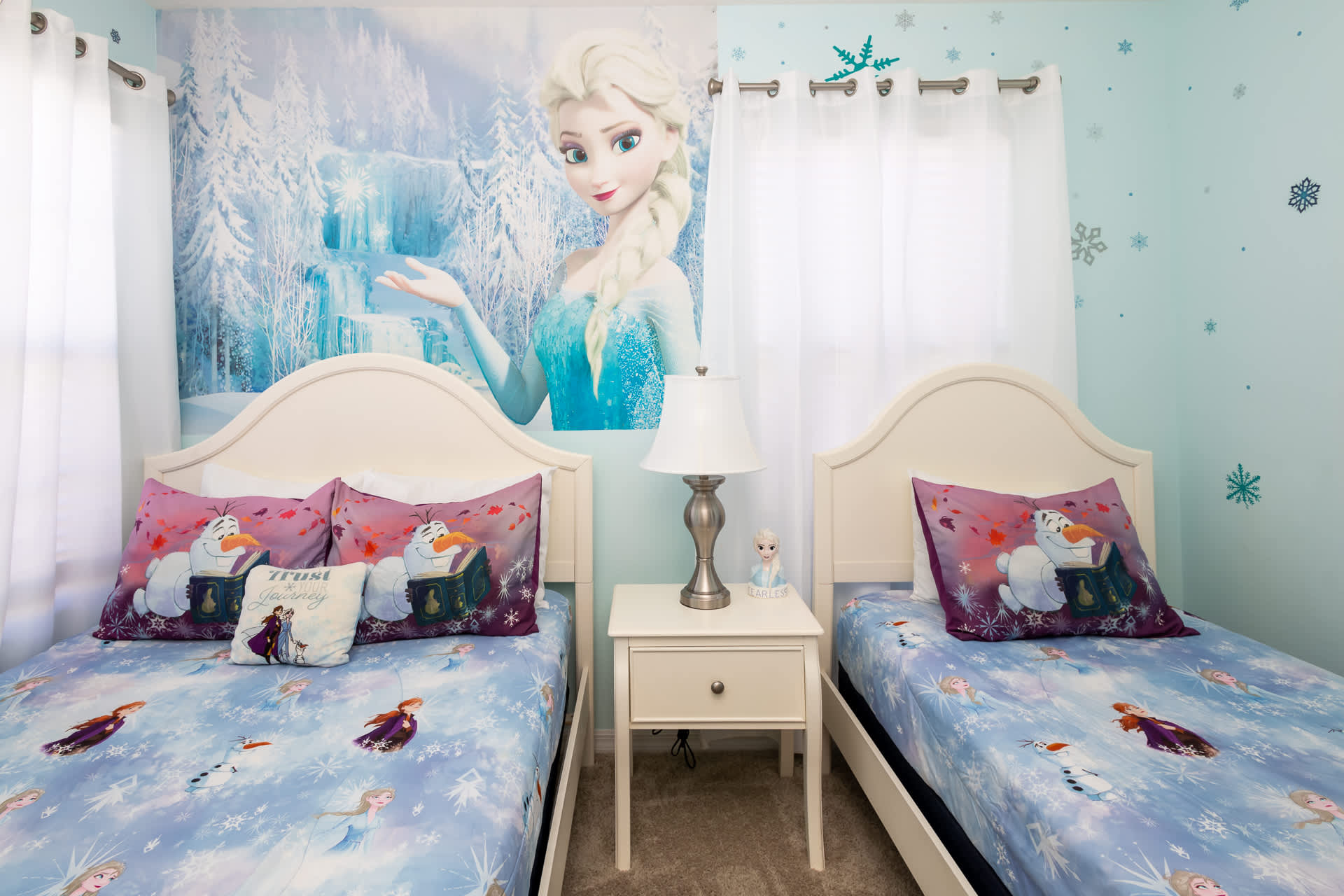 This home sleeps up to 13 guests between 5 private bedrooms. Each bedroom is thoughtfully themed, with the enchanting world of Frozen, the thrilling universe of Marvel, and the epic adventure of Star Wars brought to life through creative decor and attention to detail.