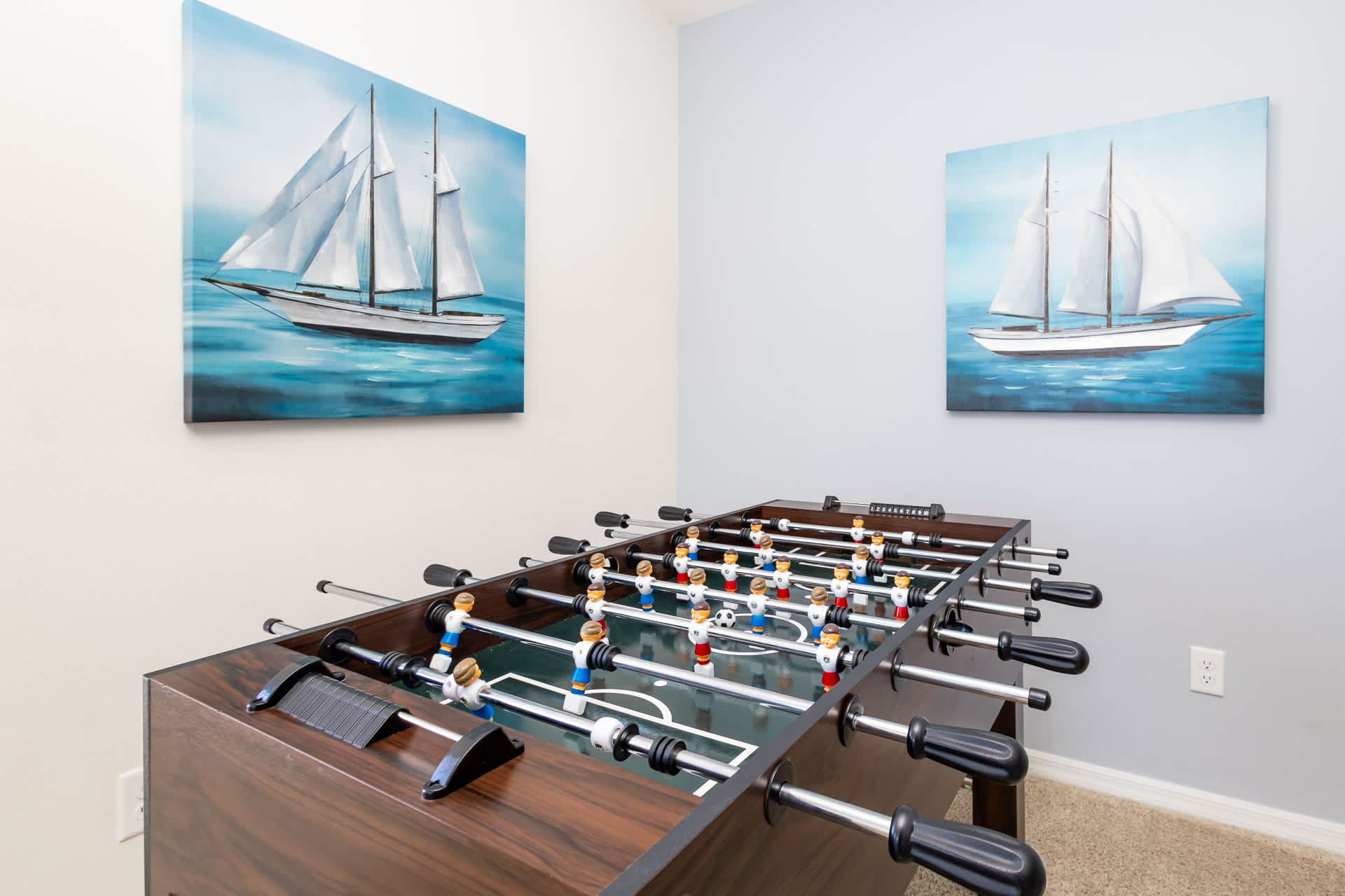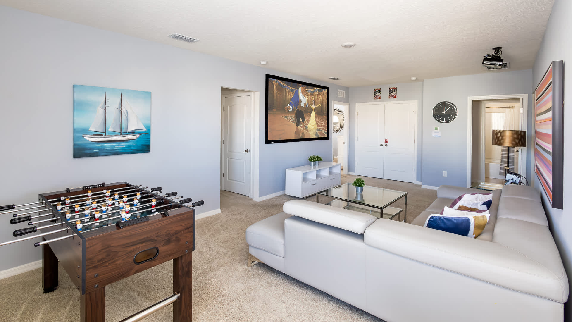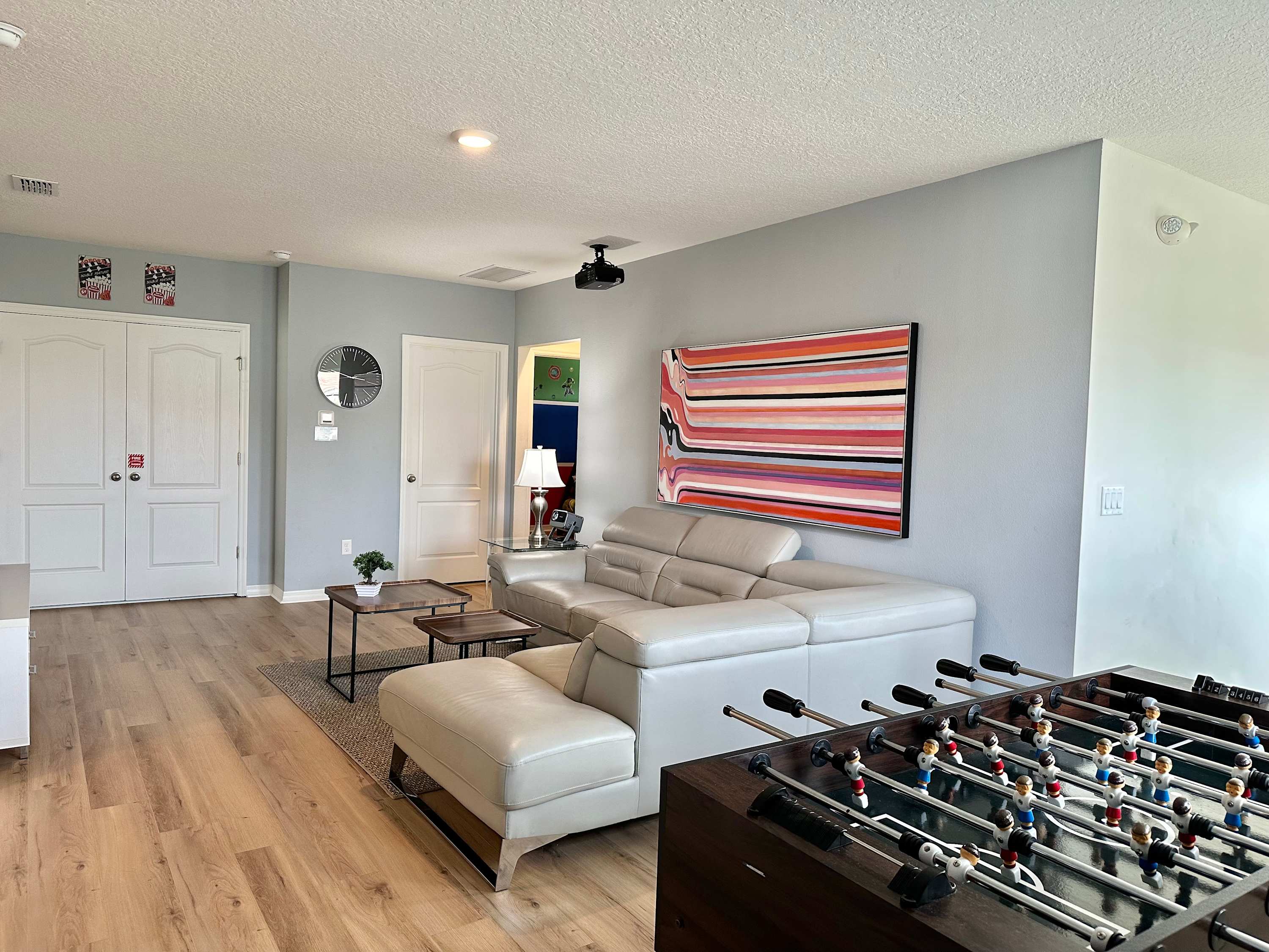 Indoors, the open concept living area is ideal for gathering, whether you're enjoying a meal together, catching up with loved ones, or planning your next adventure. Spread out along the plush L-shaped sofa or have a seat in the blue velour armchair, streaming all your favorite shows on the smart TV. Upstairs, a second living area offers a unique entertainment experience, the perfect spot for an immersive movie night on the projector TV or heart-pumping rounds of foosball.