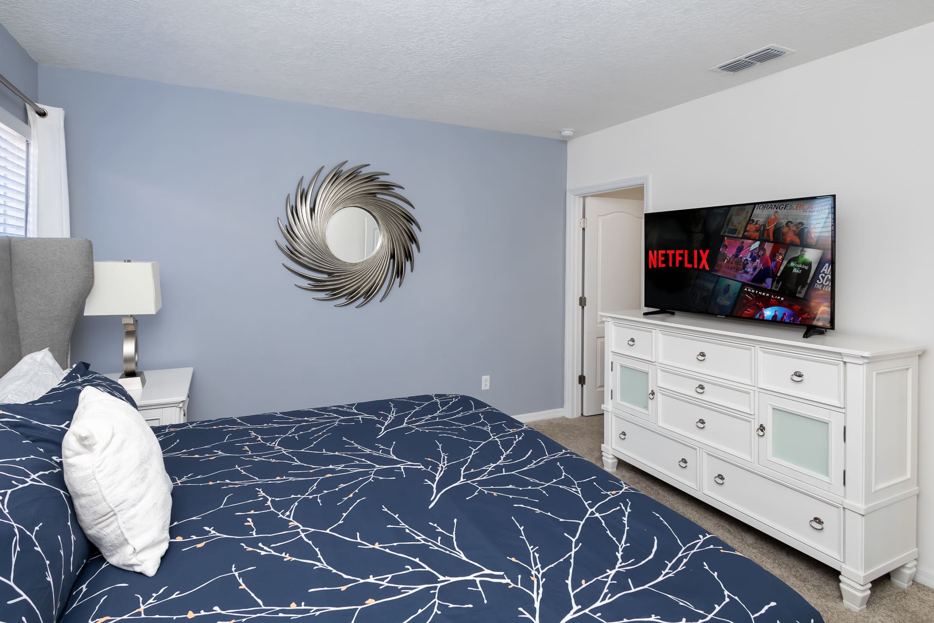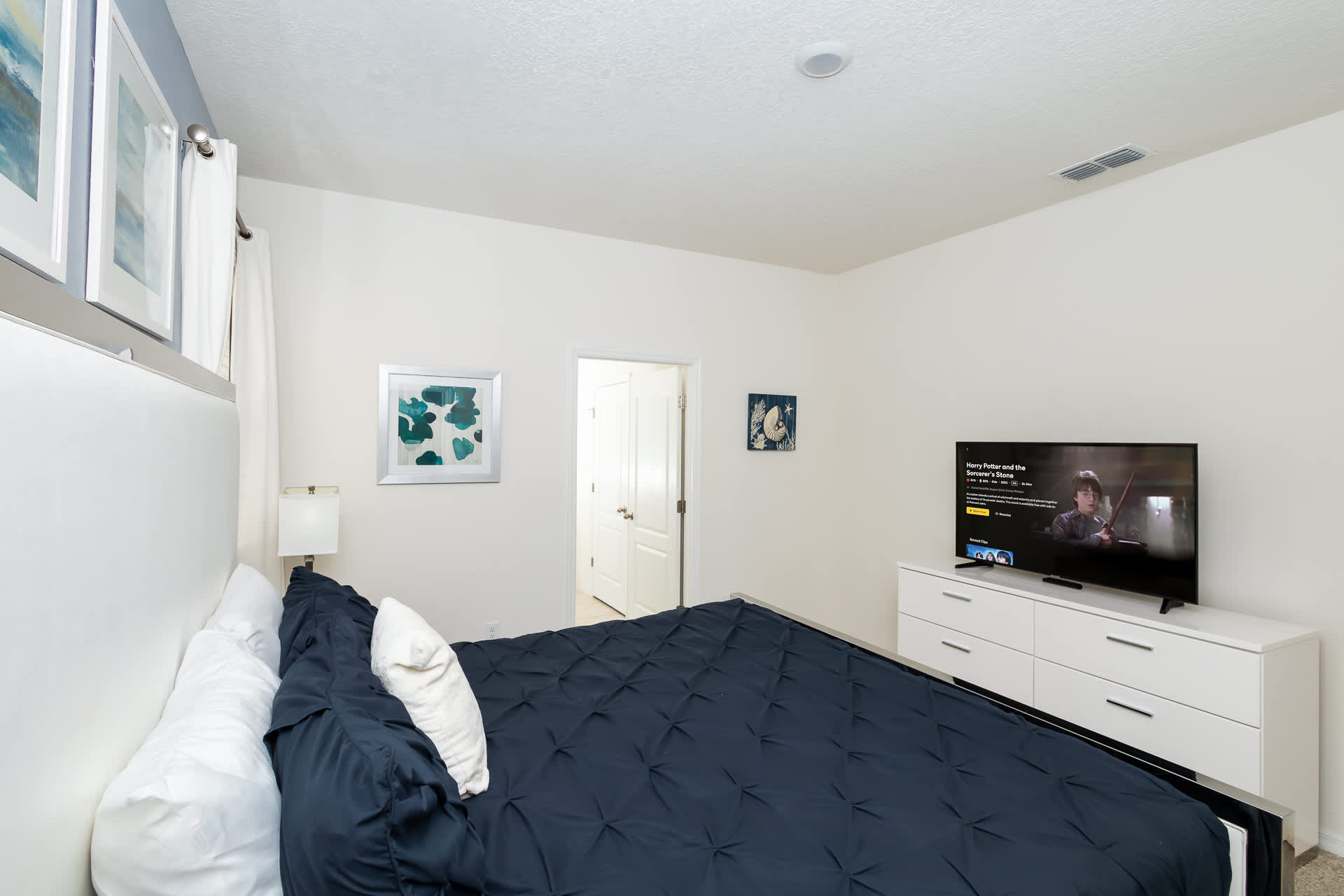 Bedroom #4 includes a king size bed, smart TV, and ensuite bathroom with a dual vanity and walk-in shower.