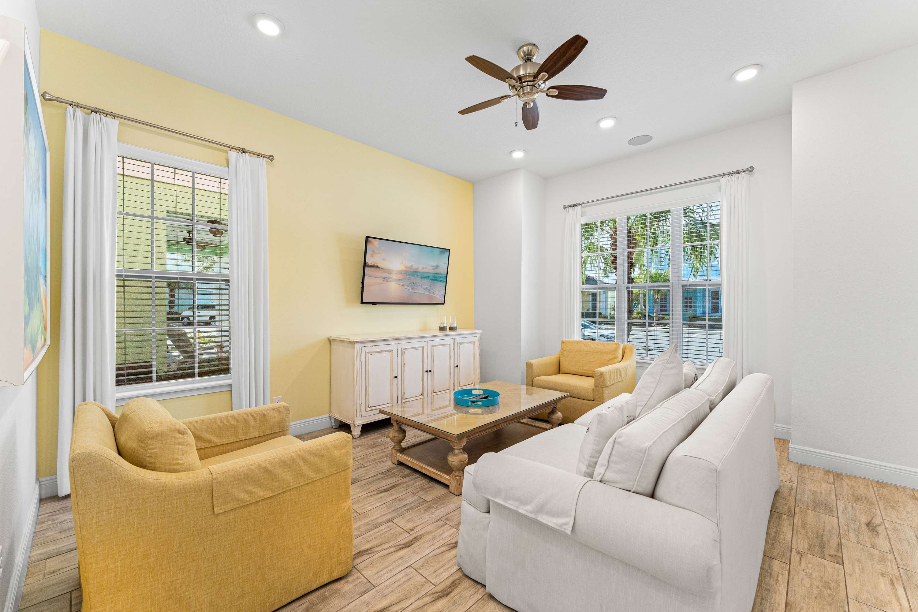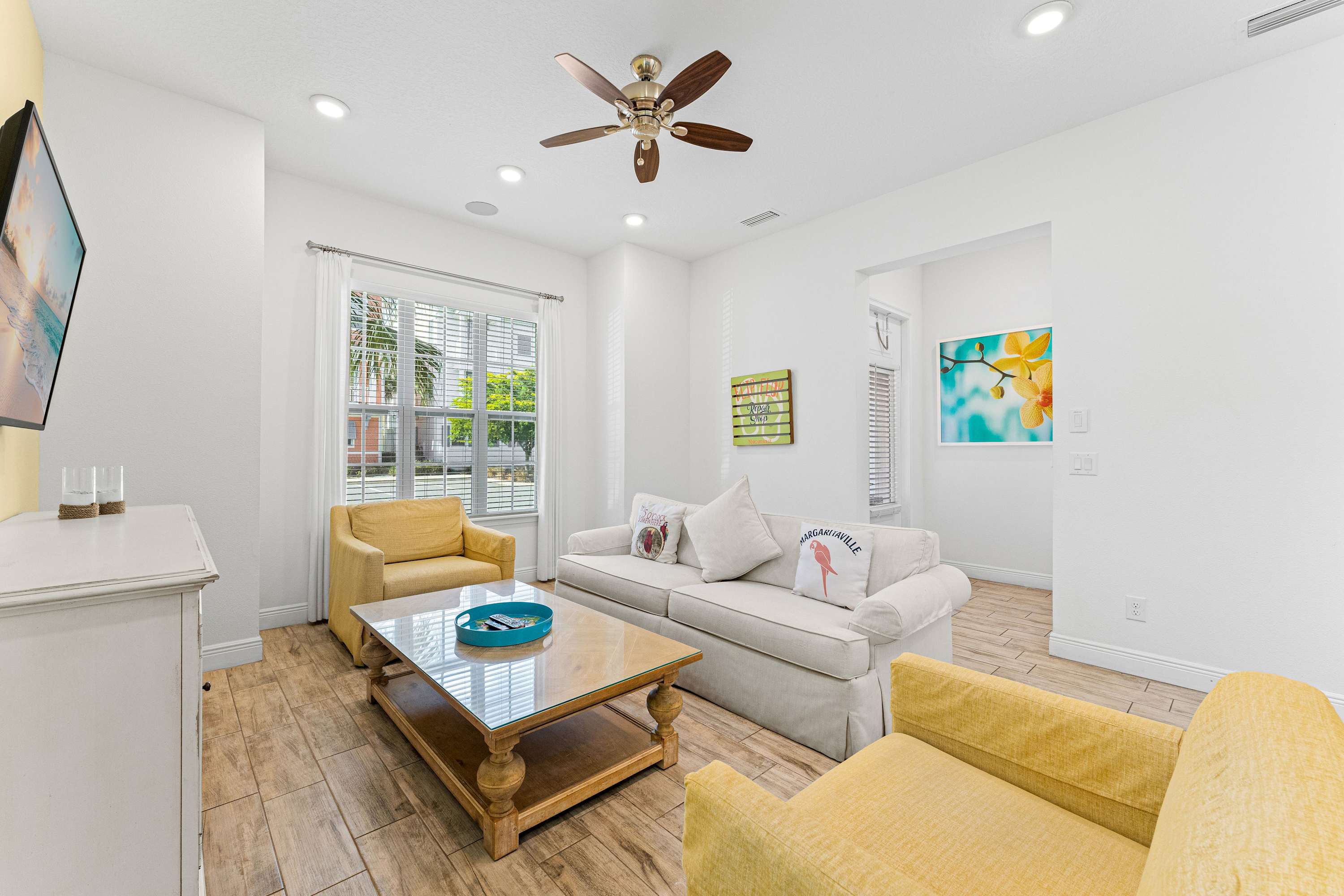 The home’s vibrant coral exterior is a welcoming sight, signaling the sunny days ahead as you step through the doors and into the stylish interior. Tall ceilings sit atop open spaces designed for connection and relaxation, illuminated in bright, natural light from the large, picture windows. Sink back into plush sofa and armchair seating in the living room while you stream all your favorite shows and movies on the mounted smart TV.