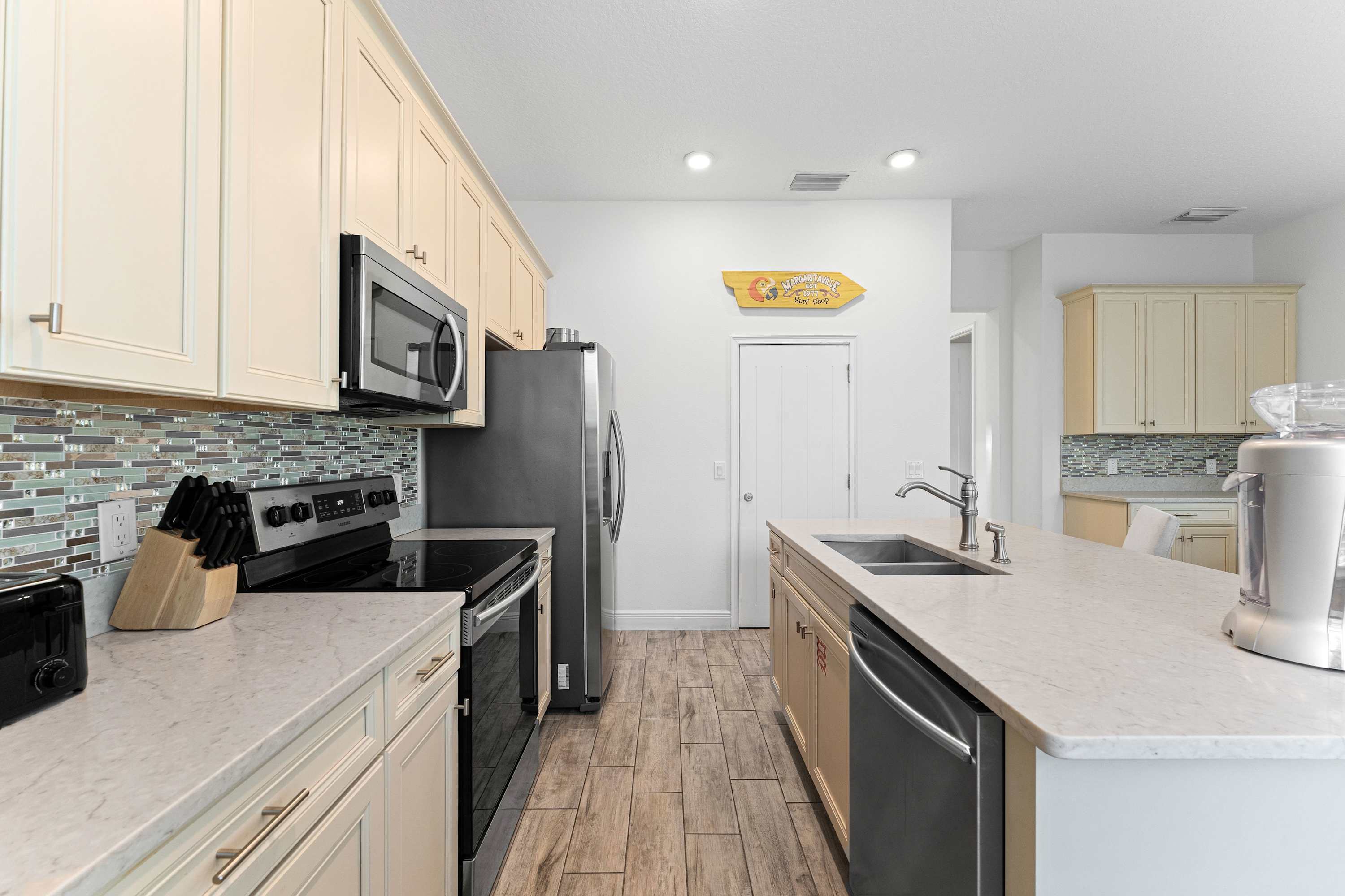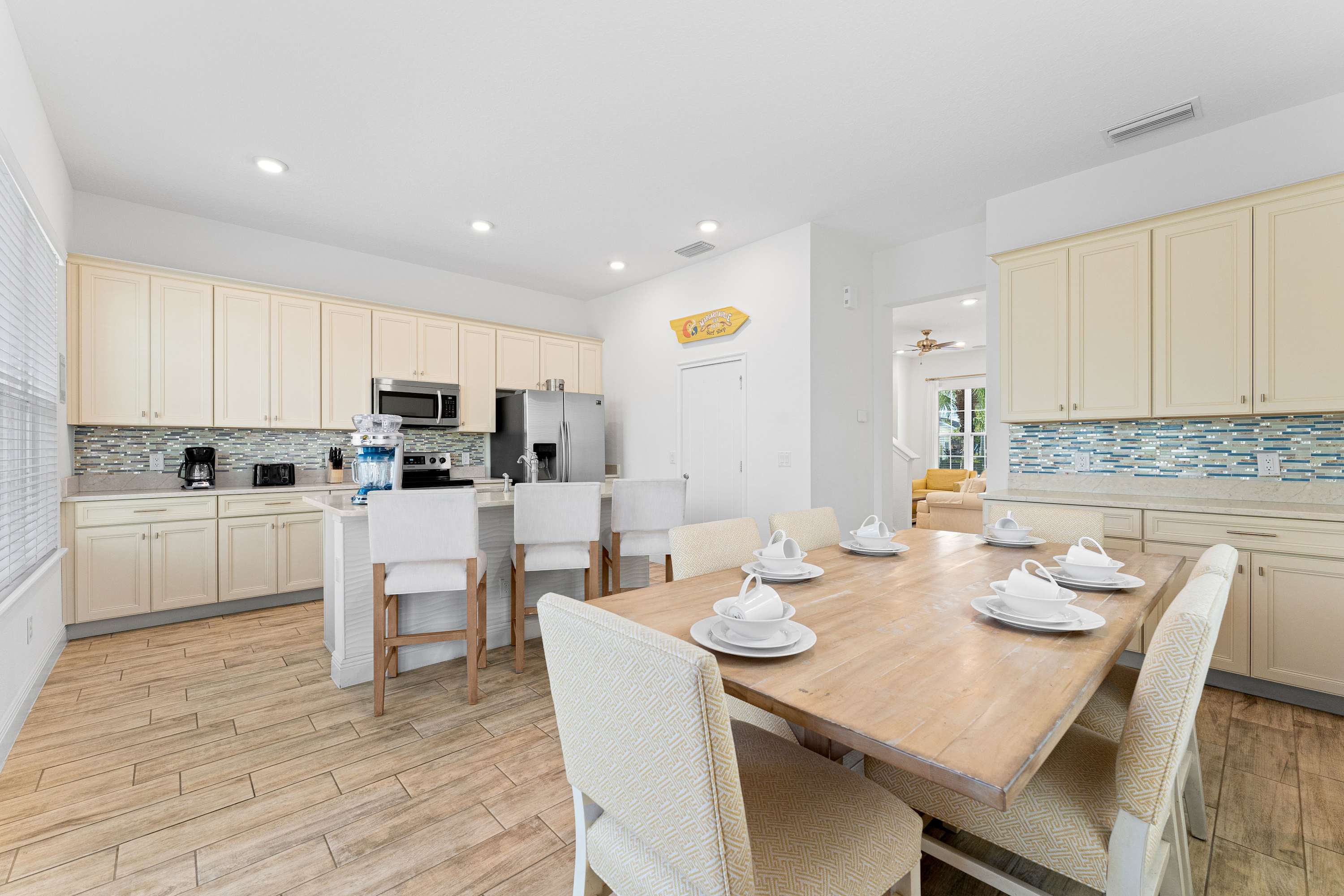 The stylish kitchen is ready to assist in all your mealtime endeavors, with upgraded stainless steel appliances, glossy quartz countertops, and natural wood cabinetry stocked with all the comforts of home. Snack on a spread of hors d’oeuvres on high-top stools at the island, gather around the dining table for a formal family style meal, or head out to the back patio to dine al fresco in the fresh air as you bask in the tranquil surroundings. When cocktail hour comes calling, fire up the margarita mixer for a refreshing homemade blend that will put you in just the right kind of mood.