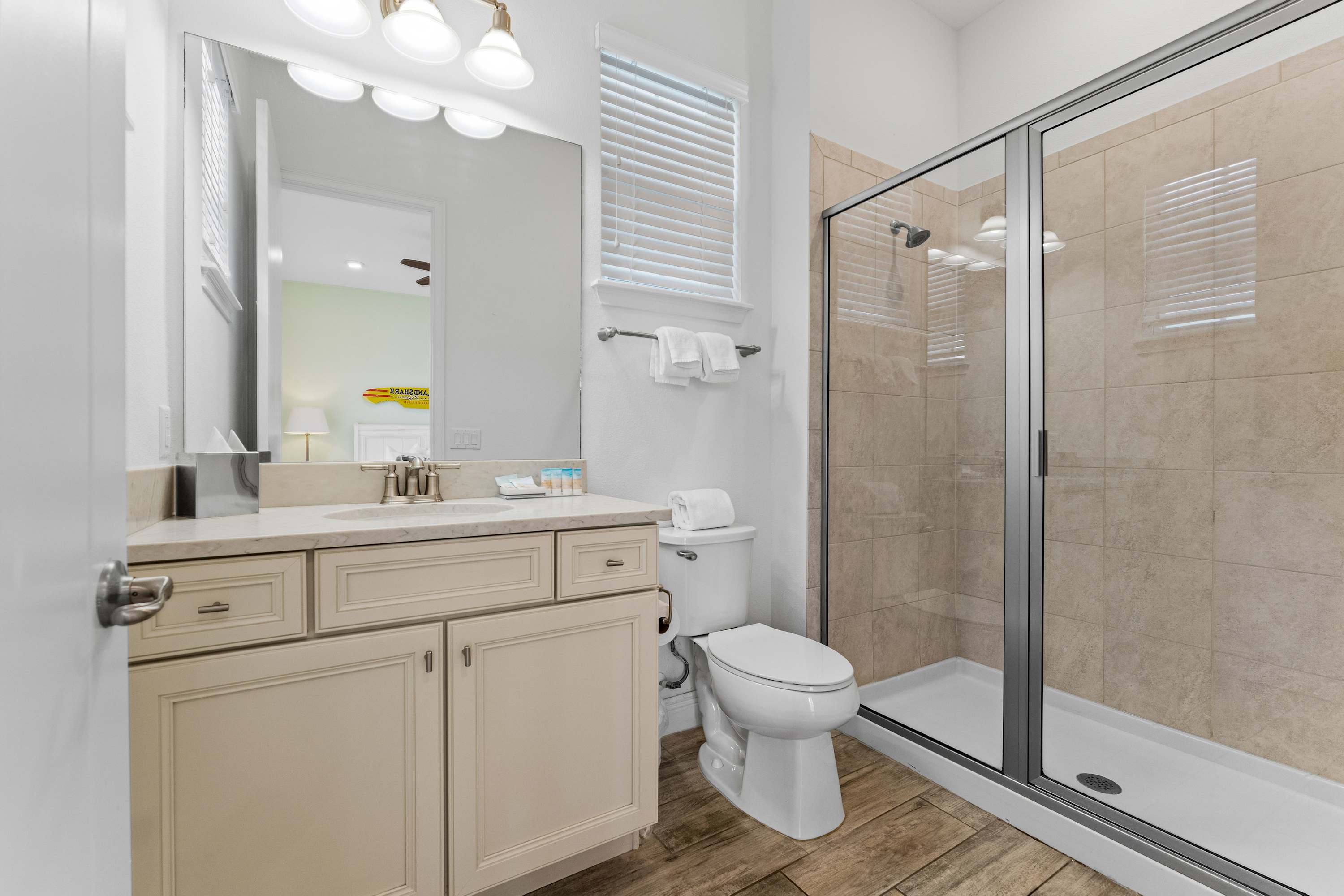 The home also includes a half bathroom as well as an additional full guest bathroom with a single vanity and glass walk-in shower.