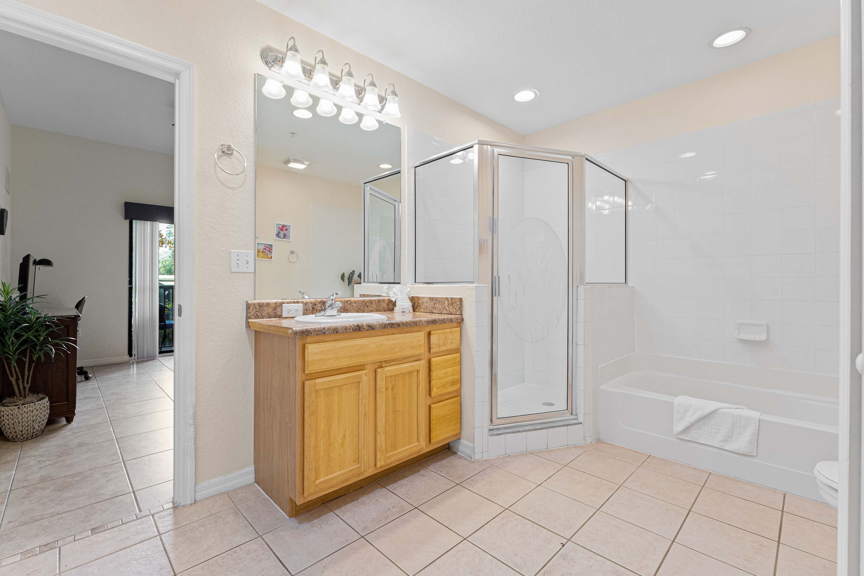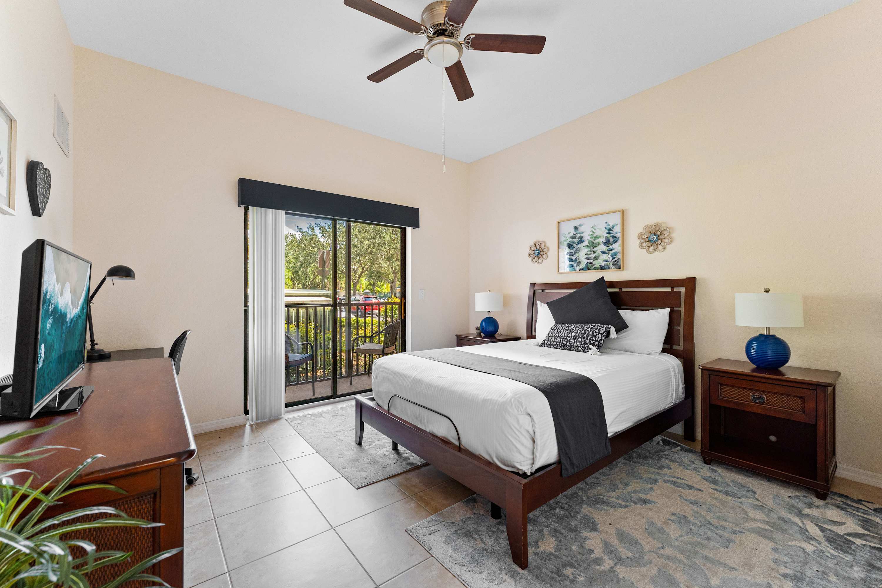 Bedroom #2 includes a brand new queen-size bed with controls to raise and lower the head of the bed only, a TV, a dedicated workspace, patio access, and a shared ensuite bathroom with a single vanity, soaking tub, and glass walk-in shower.