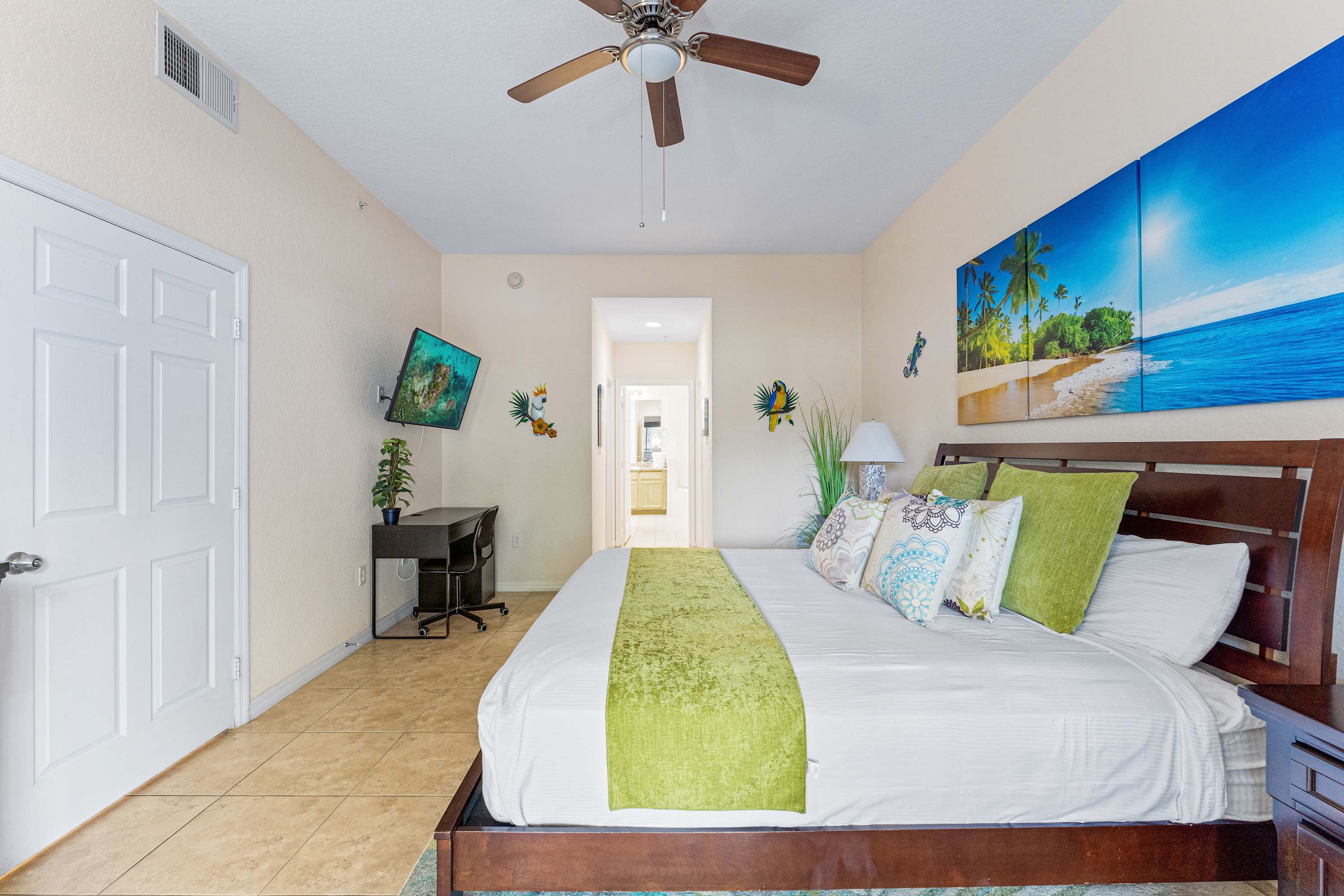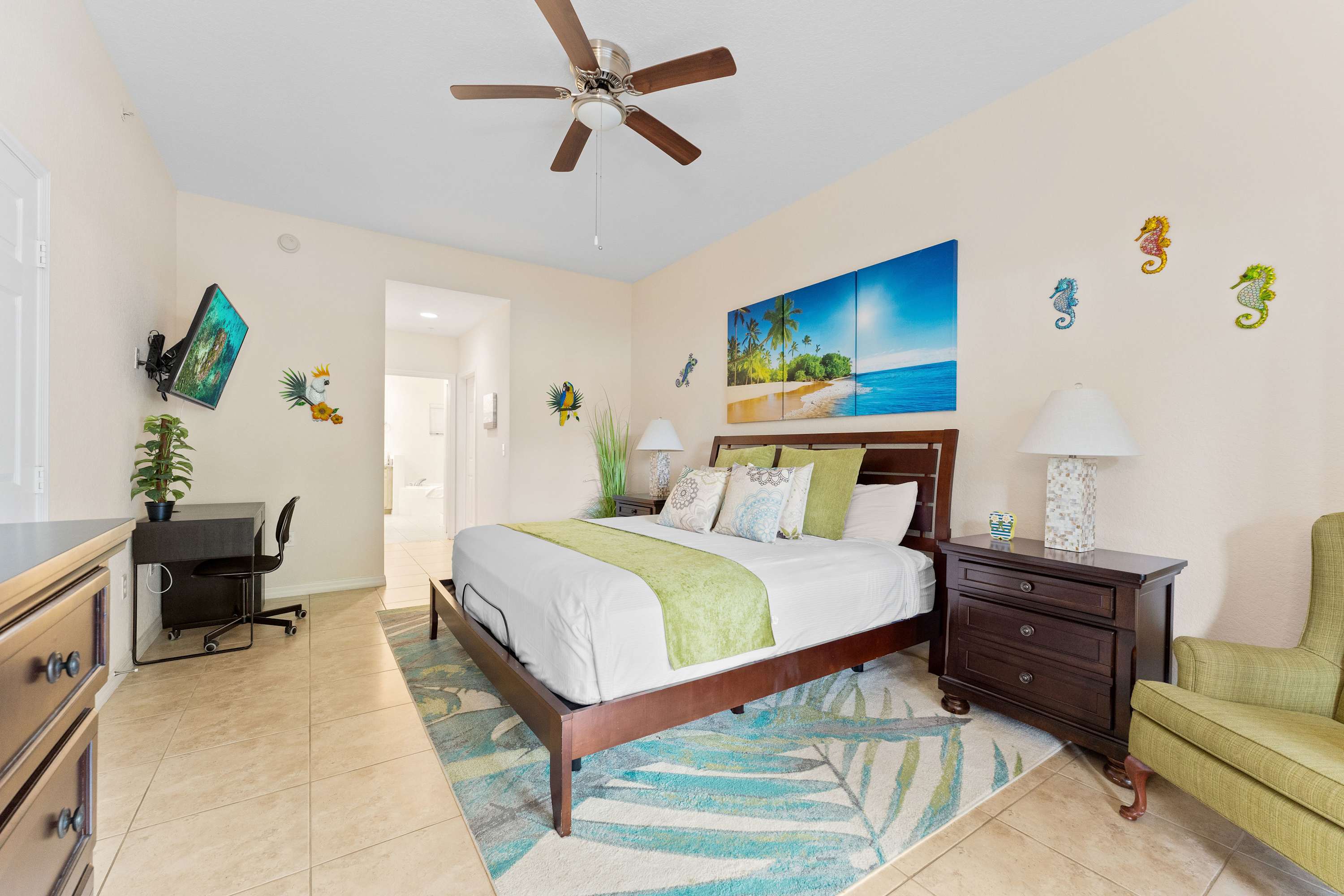 Bedroom #3 includes a brand new king-size bed with controls to raise and lower the head of the bed only, a TV, a dedicated workspace, patio access, and an ensuite bathroom with a dual vanity, soaking tub, and glass walk-in shower.