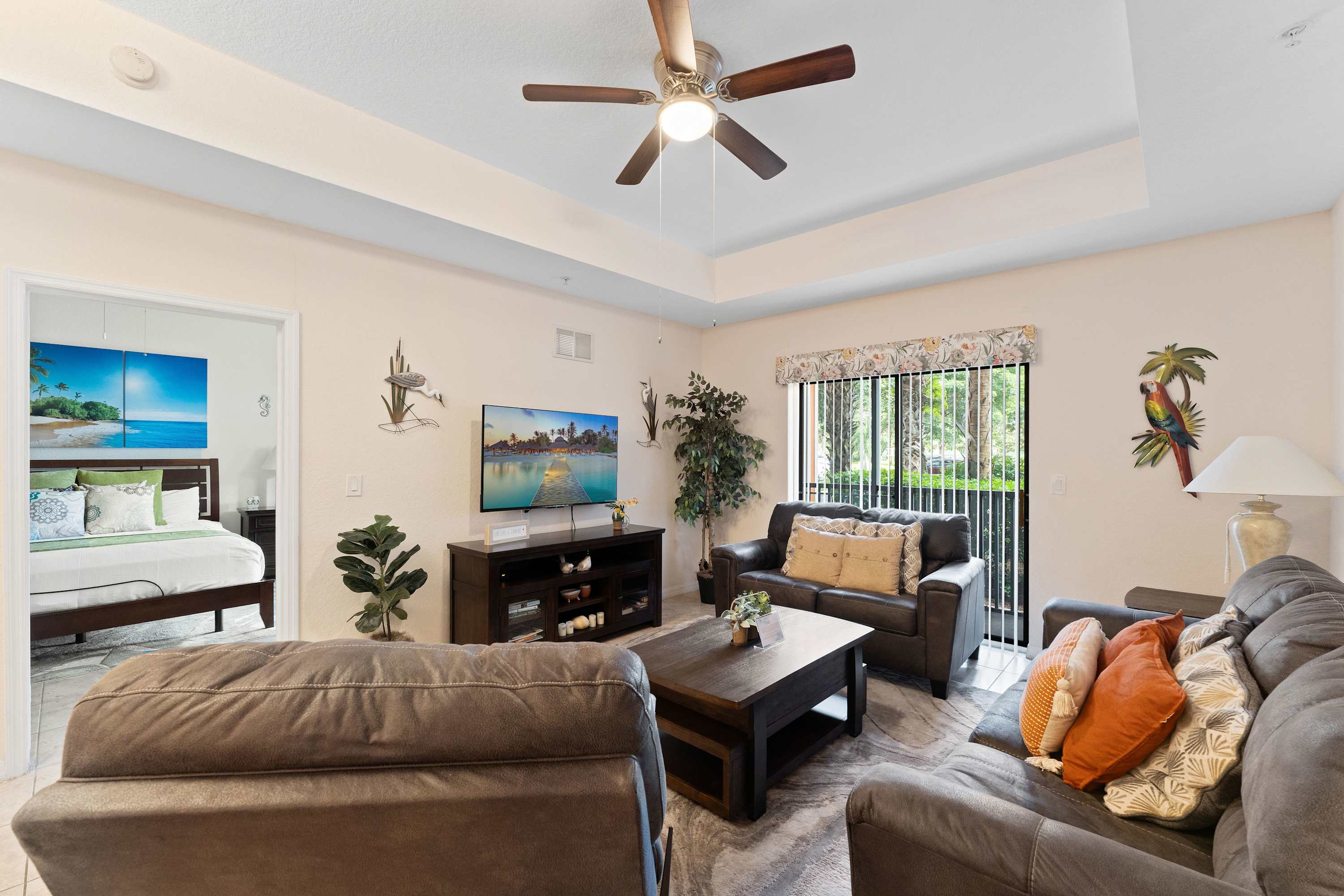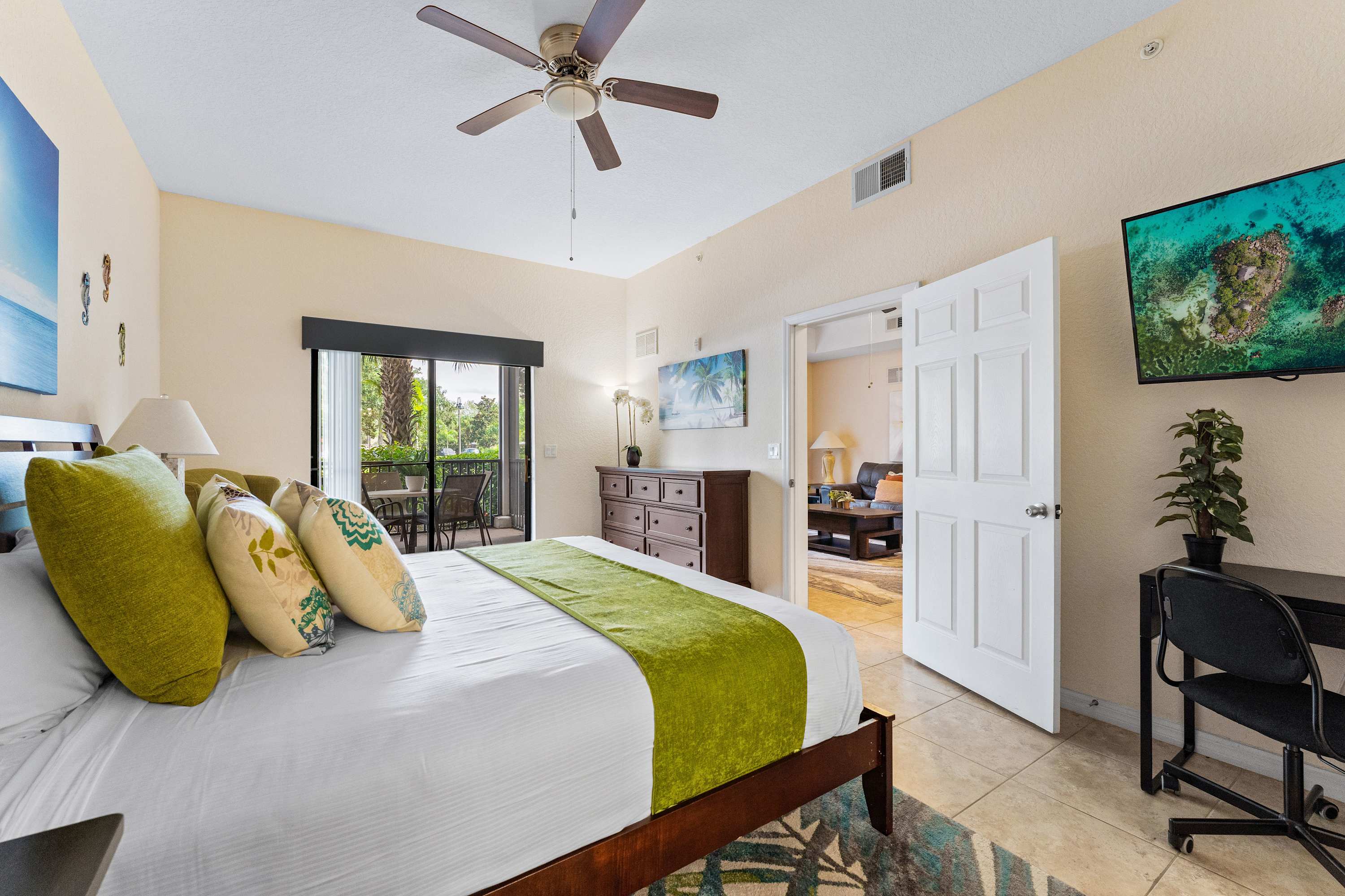 Boasting a sprawling 1,600 square feet of comfort and style, the home’s interior offers plenty of space for you and your guests to spread out in and find your own cozy corner. High ceilings sit atop plush sofa seating in the living room, the perfect spot for gathering with loved ones to surf the channels or queue up a new movie. Enjoy preparing meals together in the fully equipped kitchen, inclusive of all major appliances along with cookware, utensils and glassware. Dining comes easy whether you’re surrounded in good company at the table for 6 or seated up at the counter on high-top stools for 3. Two screened balconies offer the option for al fresco dining or quiet moments spent sipping a fresh cup of coffee or an evening glass of wine.