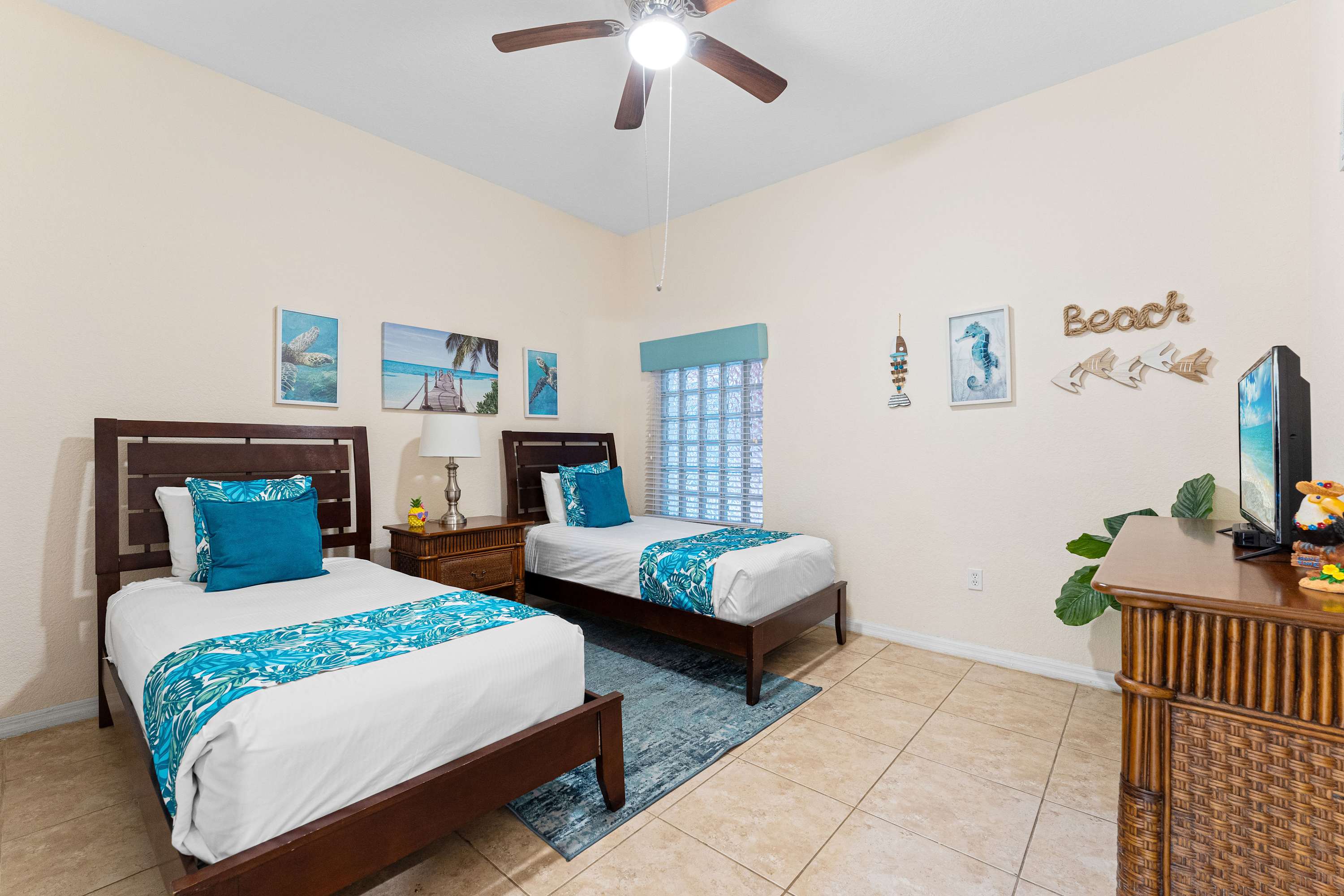 Bedroom #1 includes 2 twin size beds, a ceiling fan, and a TV.