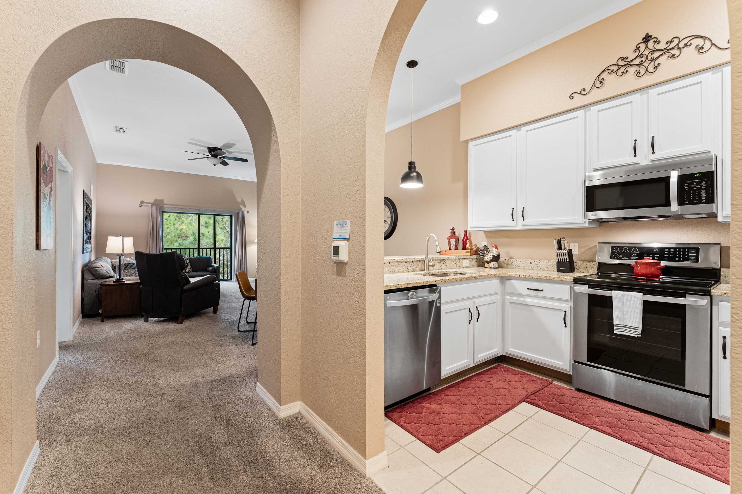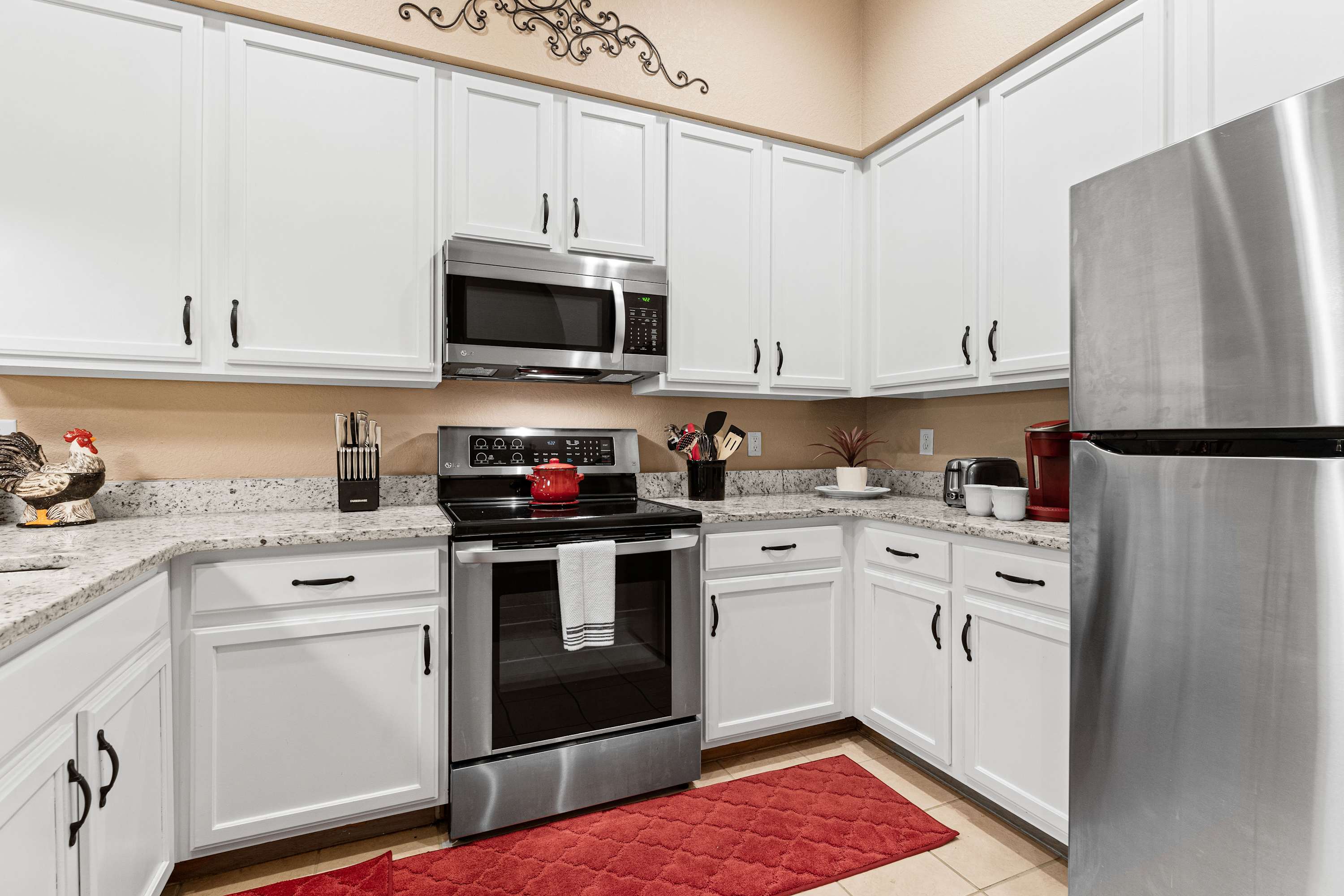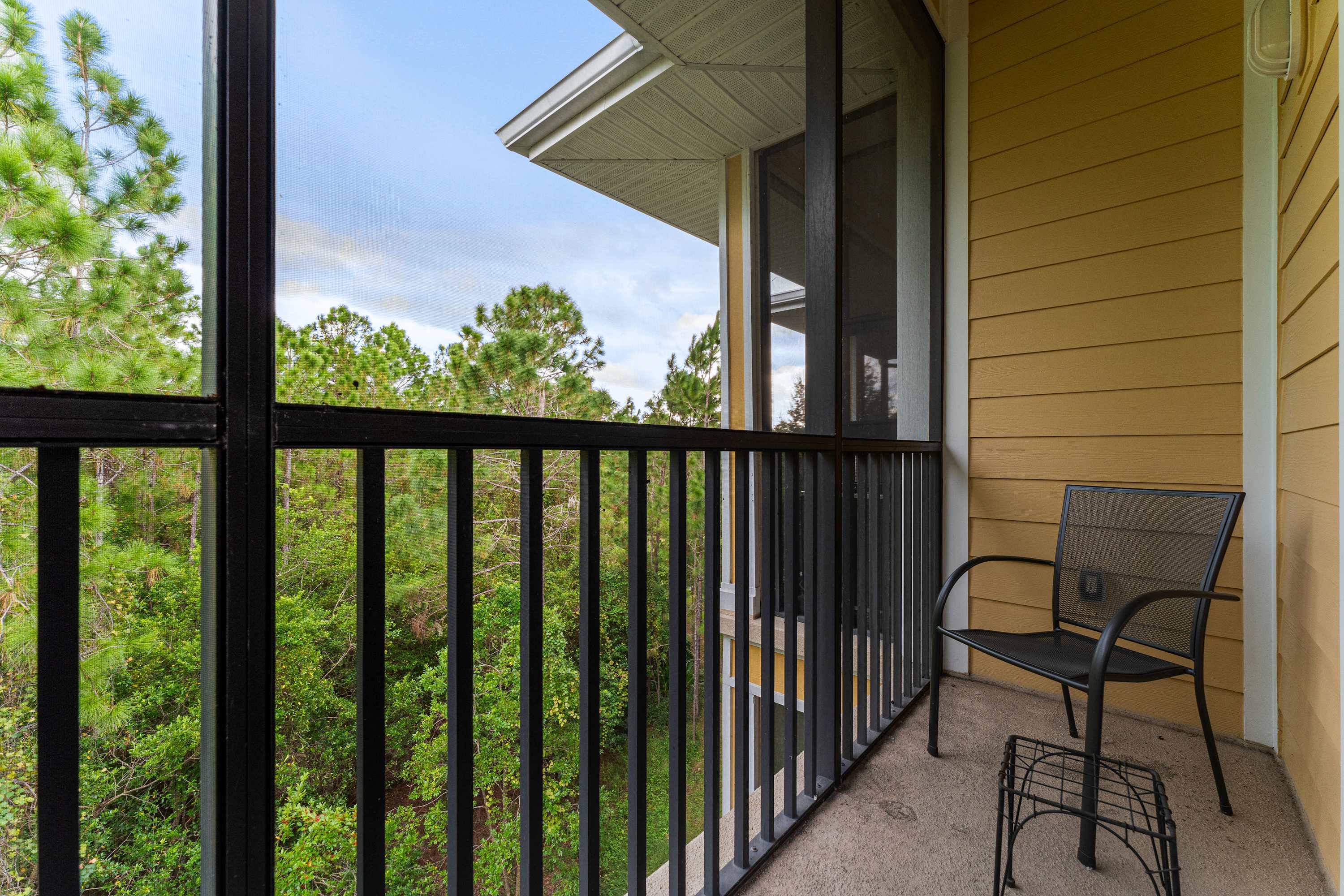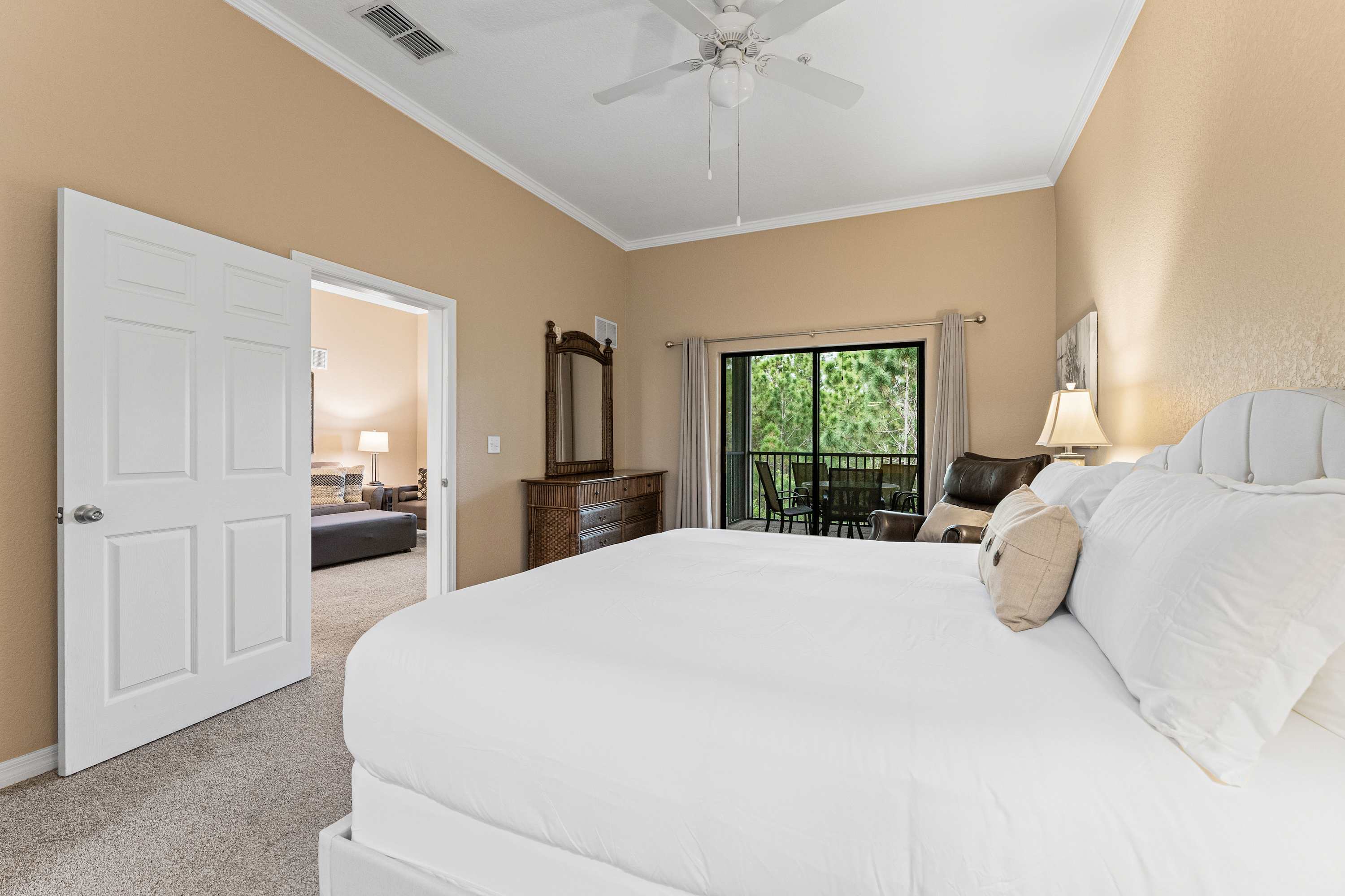 Days begin and end out on the home’s private, screened-in balcony, overlooking the picturesque tree line while you sip on your morning coffee, dine on a meal al fresco, or enjoy a quiet evening cocktail in the fresh country air. Indoors, open spaces come elegantly furnished and styled to maximize your downtime as you unwind and recharge for the exciting days ahead. Tall ceilings sit atop plush sofa seating in the living room, the ideal space for surfing the channels or gathering for a family movie night. The modern kitchen showcases stainless steel appliances, sleek granite countertops, and plentiful cabinetry stocked with all the comforts of home. The chic, round dining table seats the whole crew for shared meals, afterward playing host to an energetic game night.
