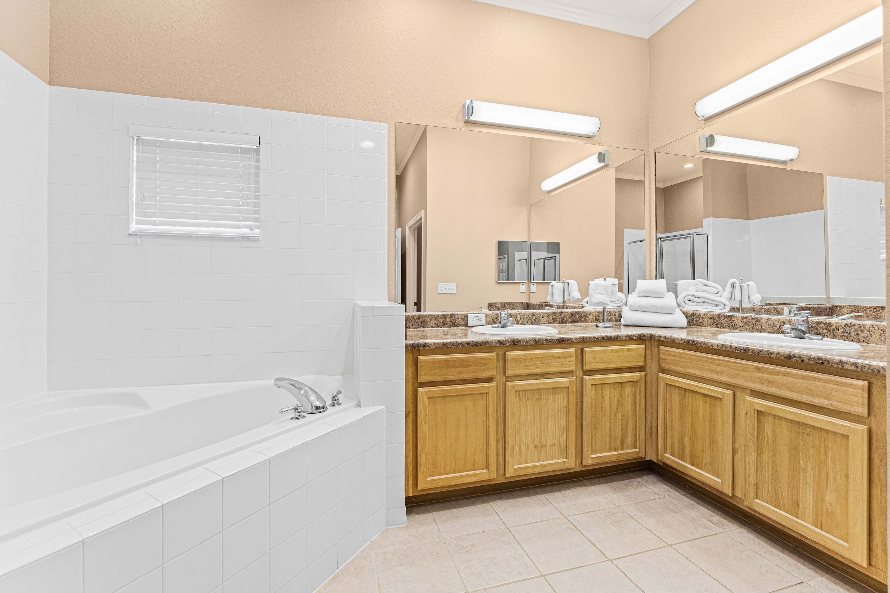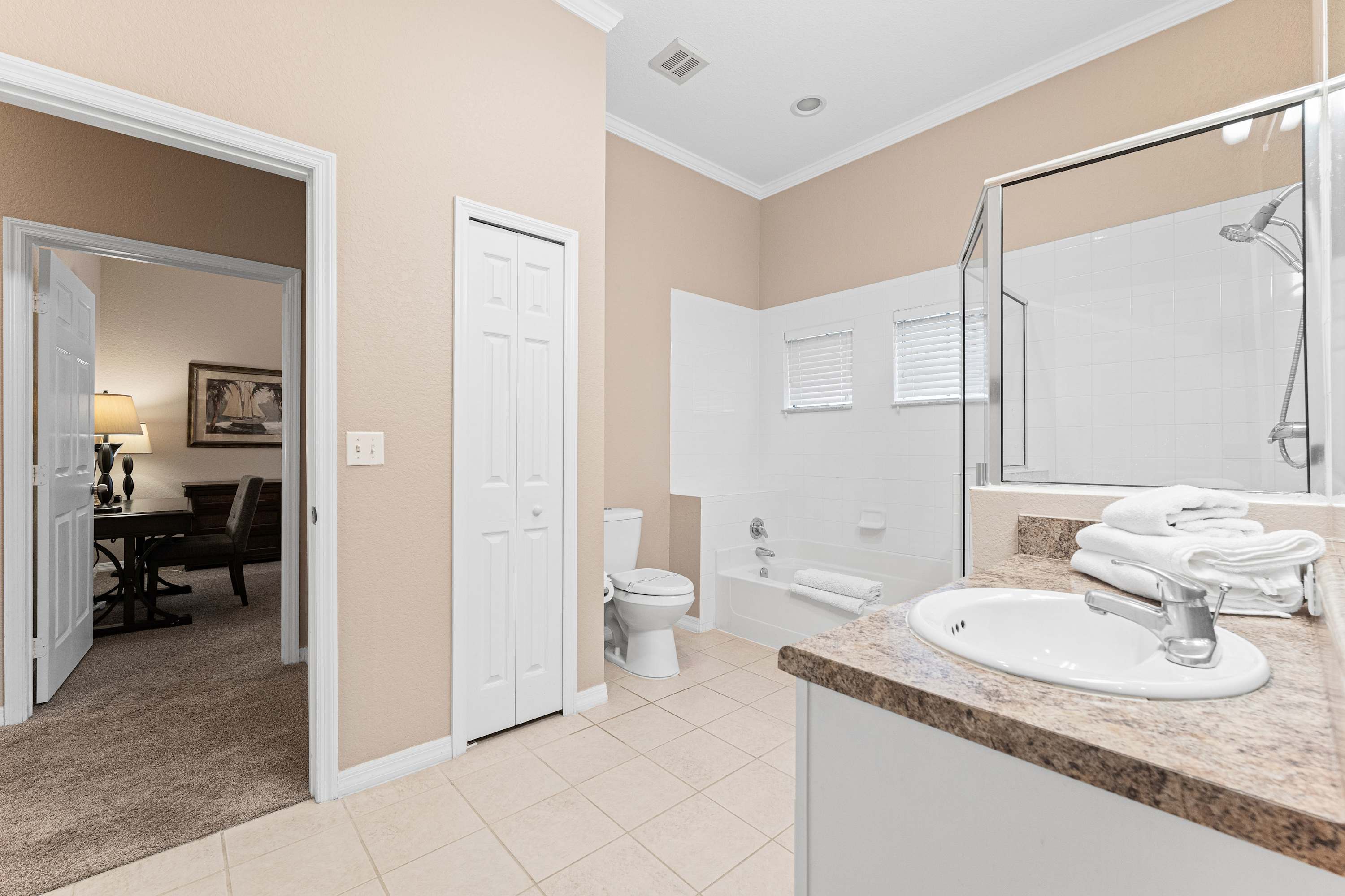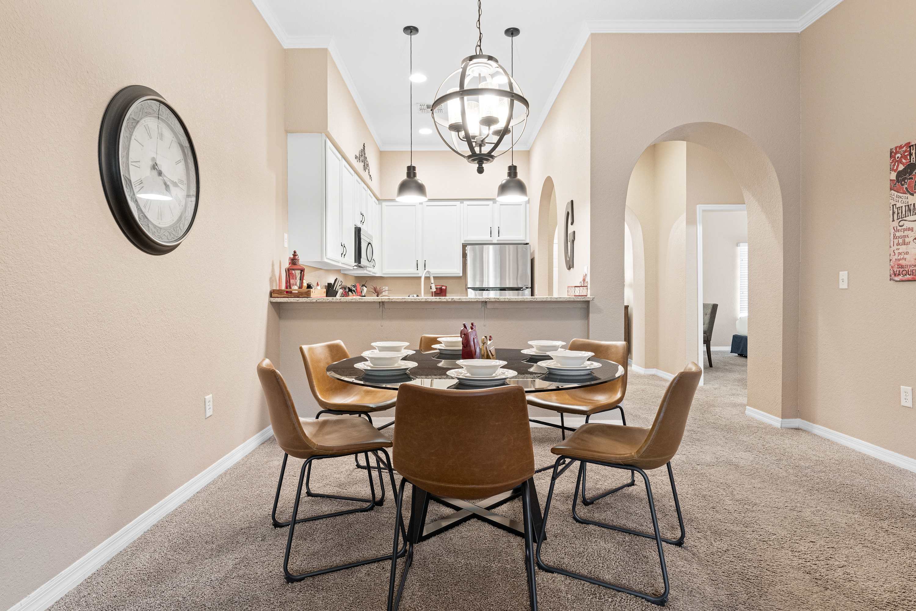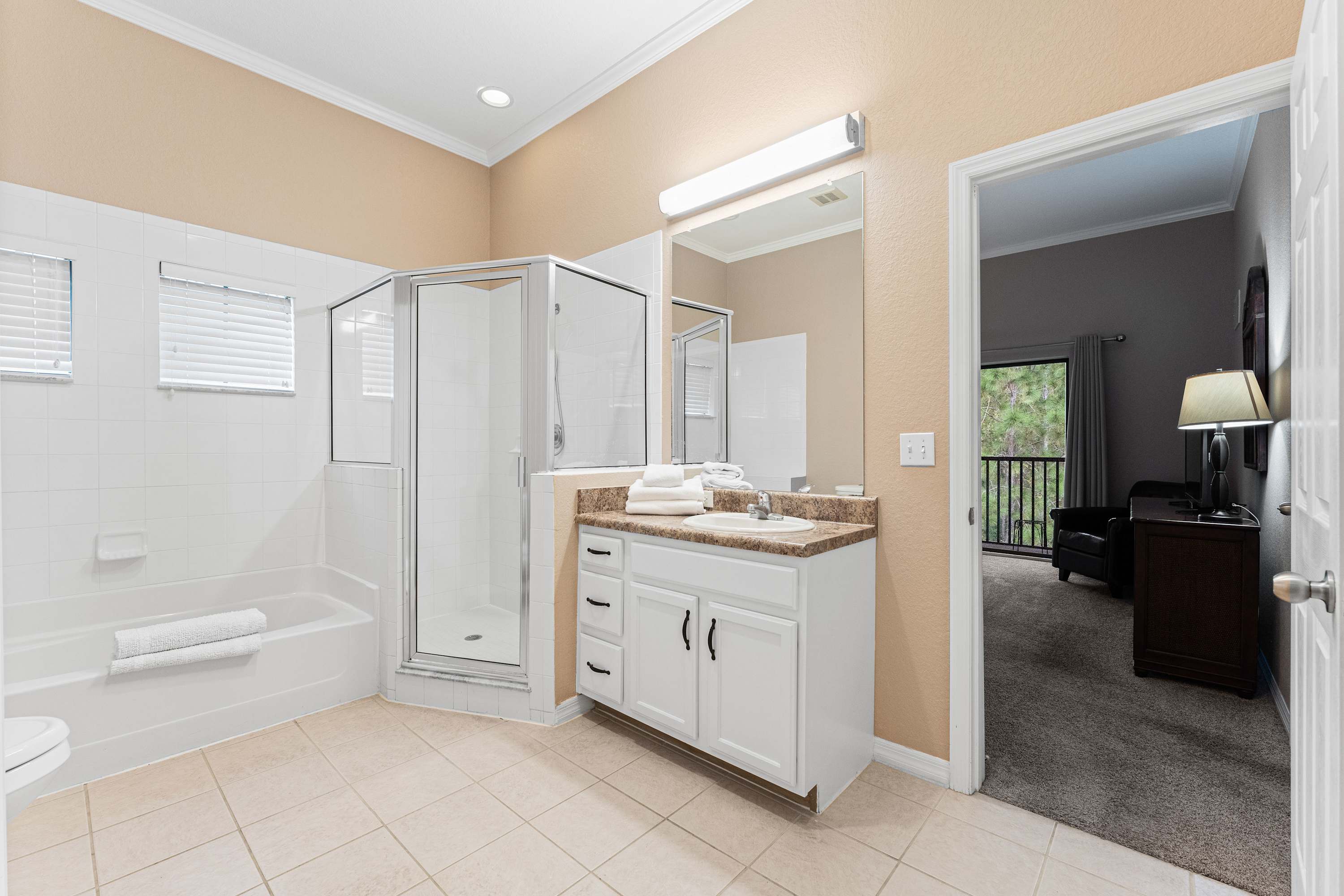 Days begin and end out on the home’s private, screened-in balcony, overlooking the picturesque tree line while you sip on your morning coffee, dine on a meal al fresco, or enjoy a quiet evening cocktail in the fresh country air. Indoors, open spaces come elegantly furnished and styled to maximize your downtime as you unwind and recharge for the exciting days ahead. Tall ceilings sit atop plush sofa seating in the living room, the ideal space for surfing the channels or gathering for a family movie night. The modern kitchen showcases stainless steel appliances, sleek granite countertops, and plentiful cabinetry stocked with all the comforts of home. The chic, round dining table seats the whole crew for shared meals, afterward playing host to an energetic game night.