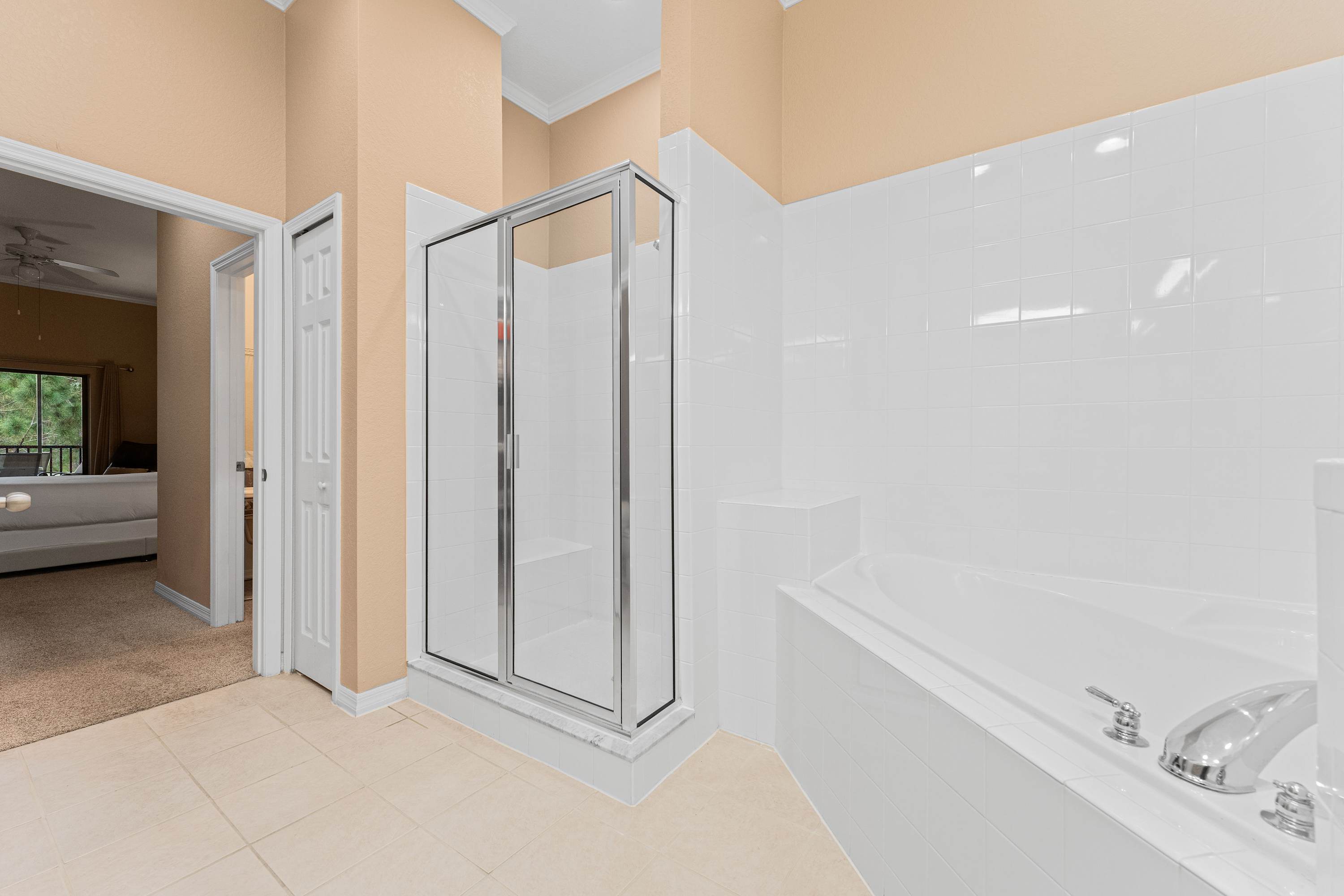 Bedroom #1 includes a king size bed, TV, balcony access, and ensuite bathroom with a dual vanity, soaking tub, and glass walk-in shower.