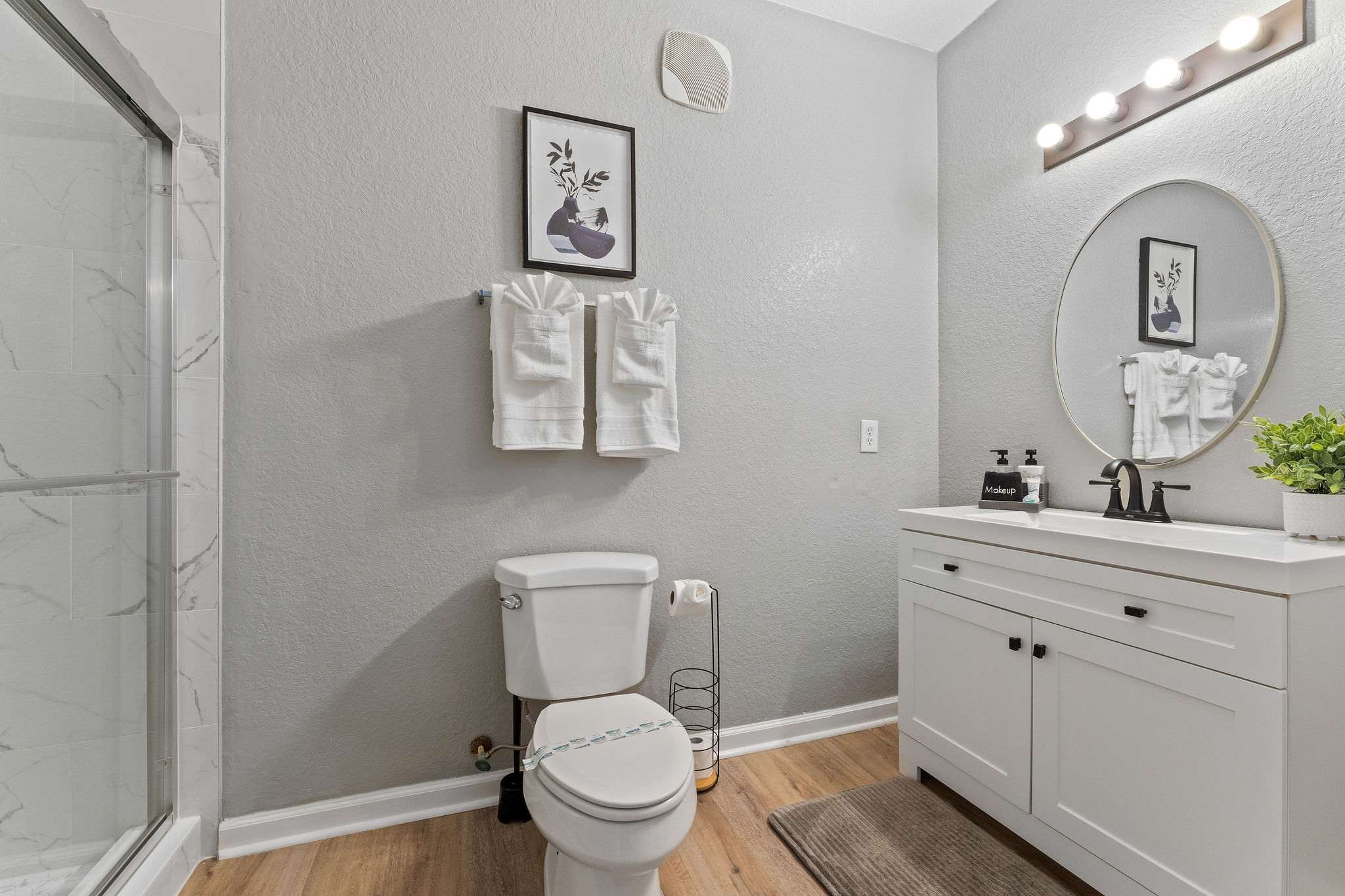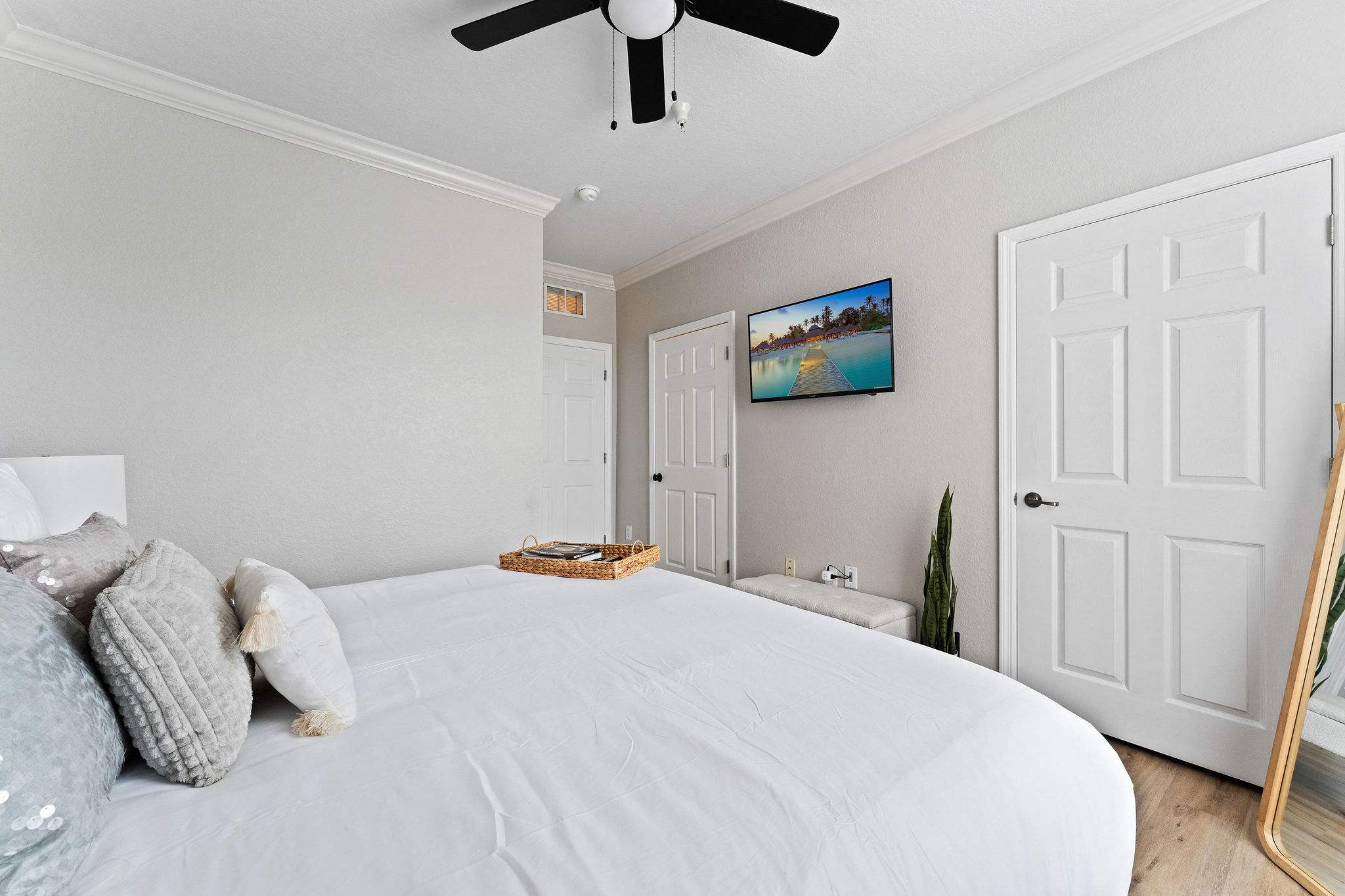 Bedroom #1 includes a king size bed, smart TV, and ensuite bathroom with a single vanity and glass walk-in shower.