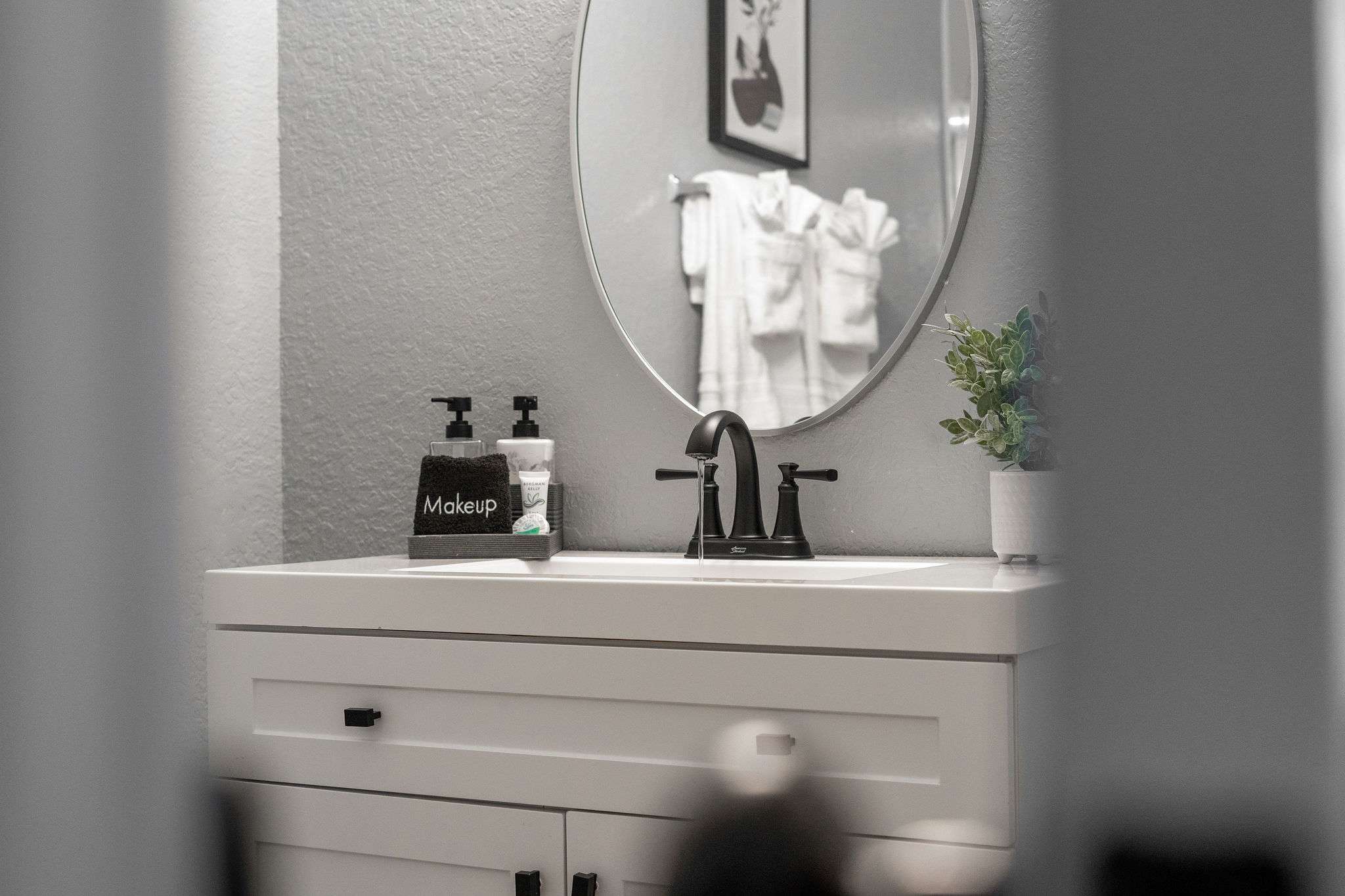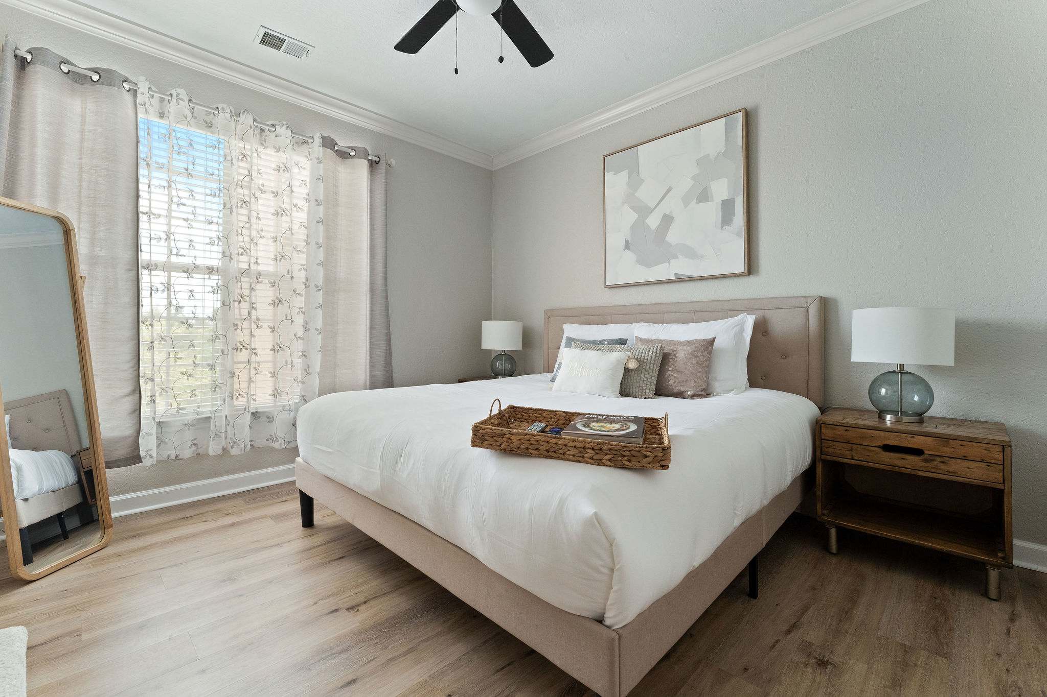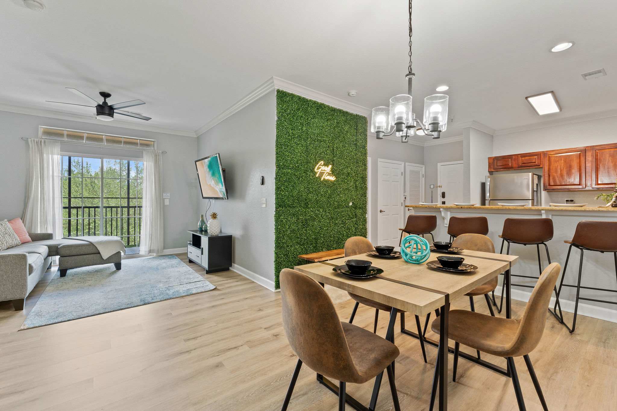 The home’s interior has been newly furnished, showcasing contemporary décor and modern metallic finishes alongside soothing natural wood colors that promote your ultimate relaxation and rejuvenation. Curl up on the plush living room sofa while you stream movies or episodes of your favorite shows on the mounted smart TV. The fully equipped kitchen is ready to host all your meals, with stainless steel appliances, glossy granite countertops, and rich cabinetry stocked with cookware and dining ware. High-top stools at the counter keep things casual as you nosh on a spread of delicious afternoon hors d’oeuvres, while a chic dining table seats 4 for more formal fare.