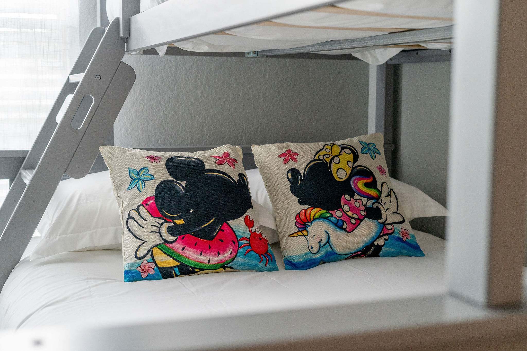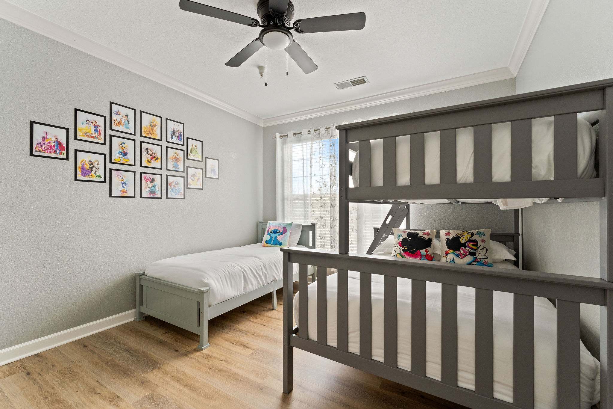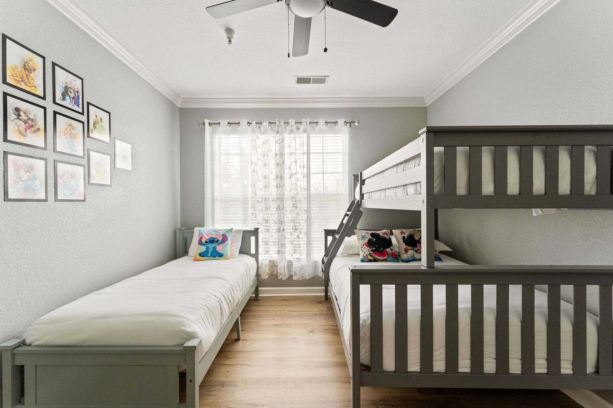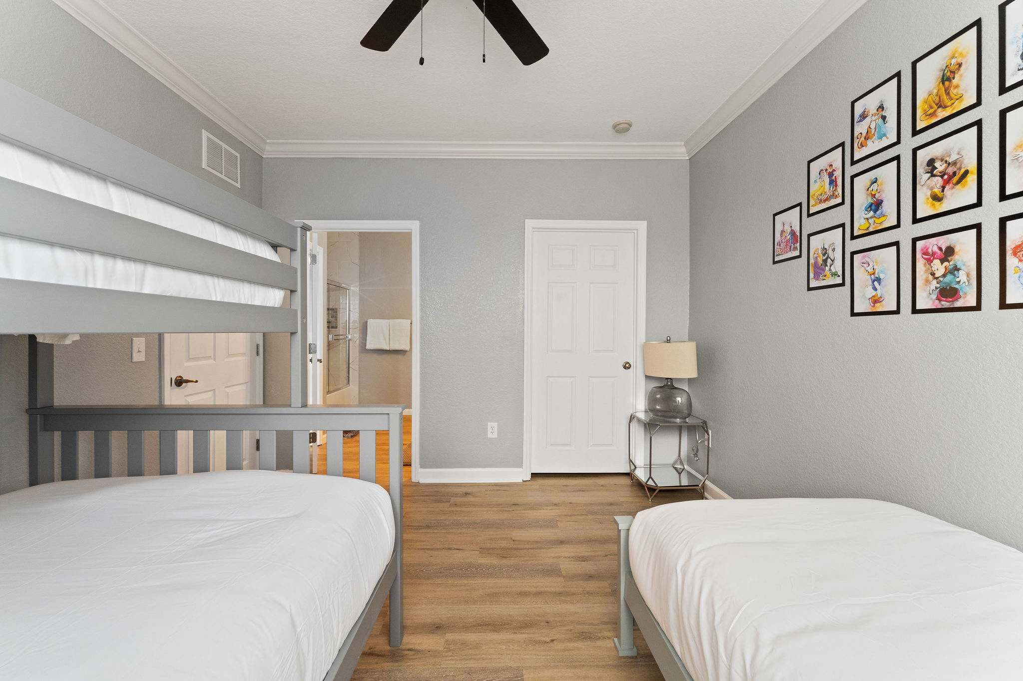 Bedroom #2 includes a twin-over-full bunk bed, a standalone twin size bed, and ensuite bathroom with a dual vanity and shower/tub combo.