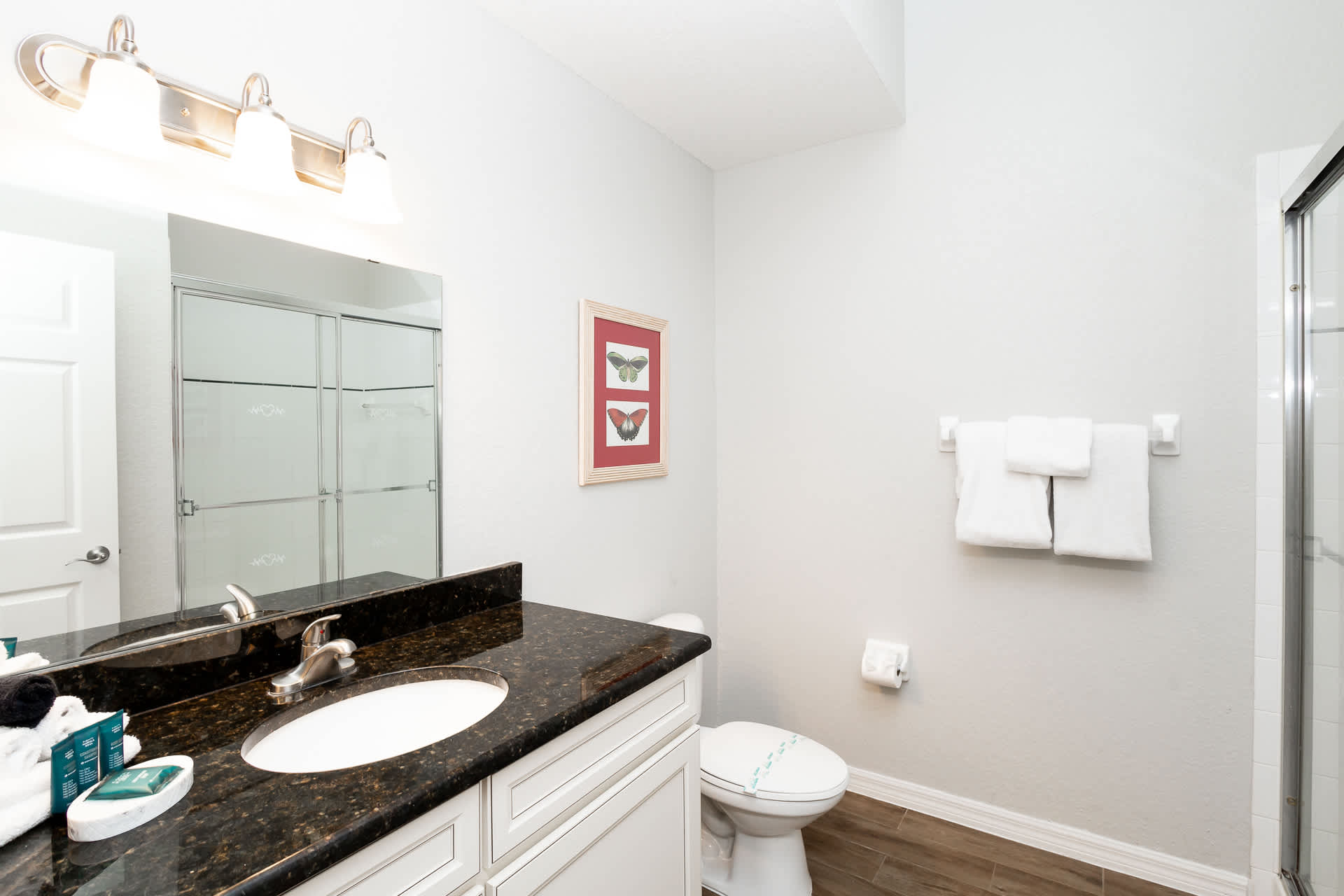The home also includes an additional full guest bathroom with a single vanity and walk-in shower.