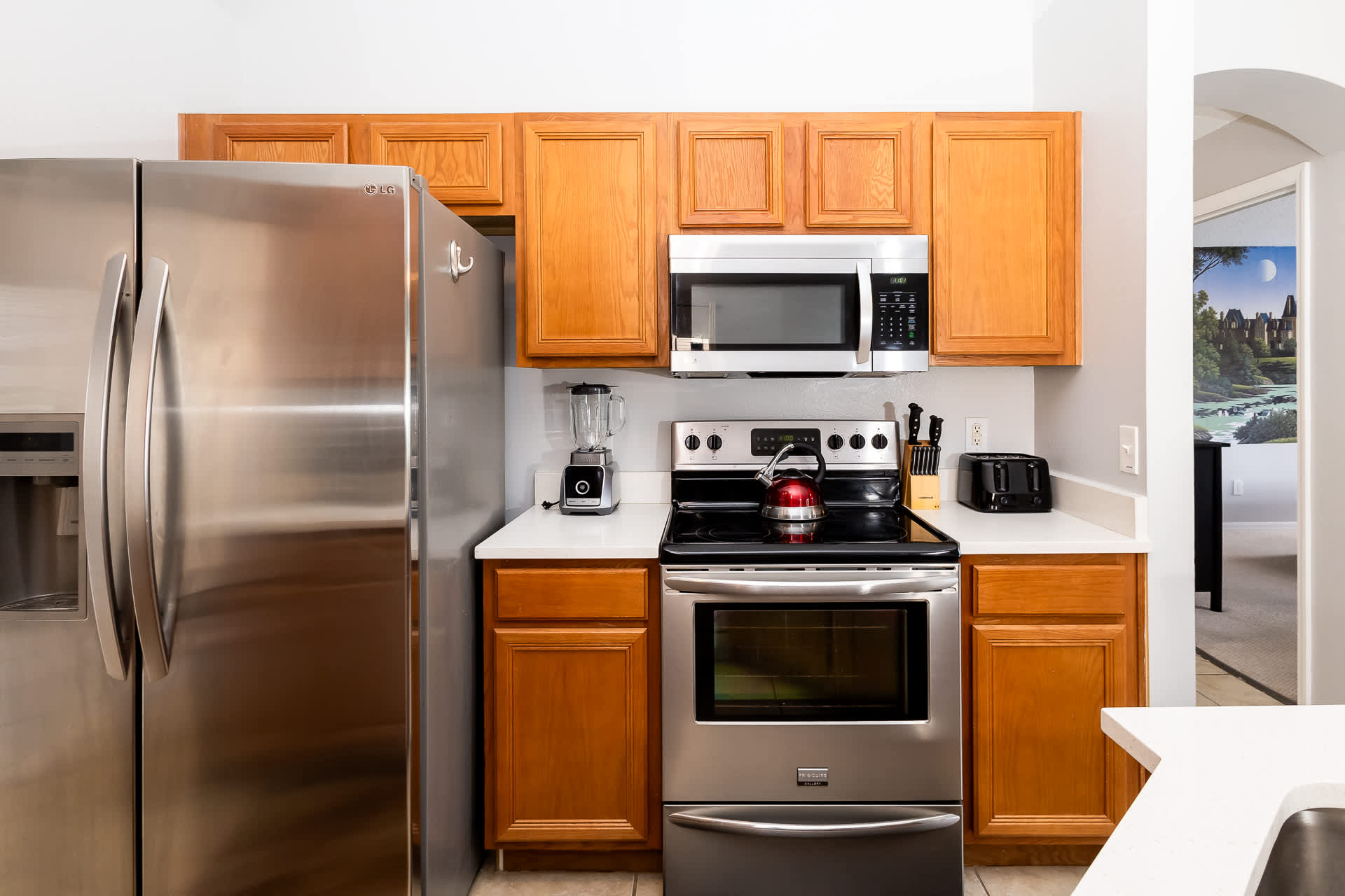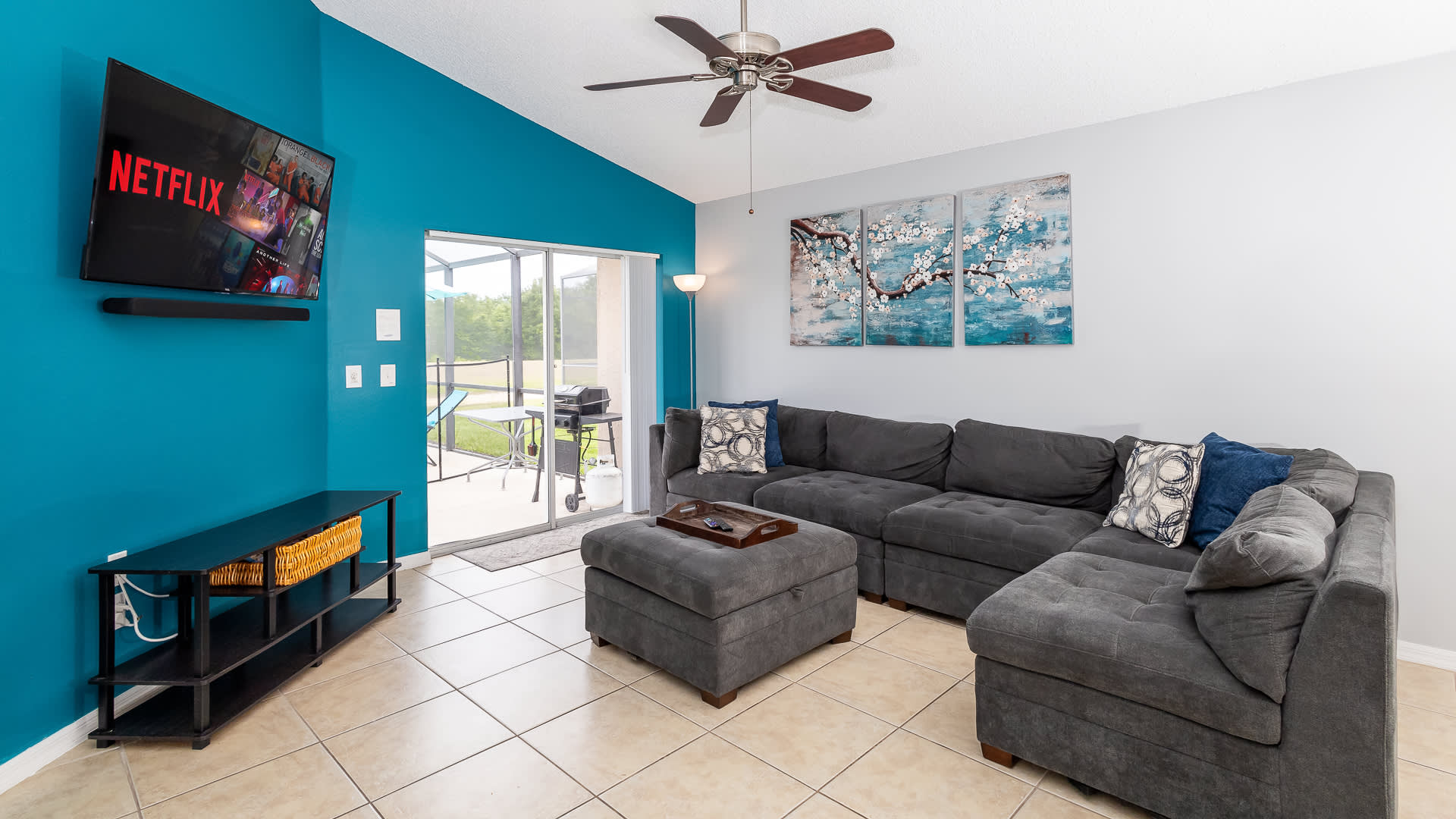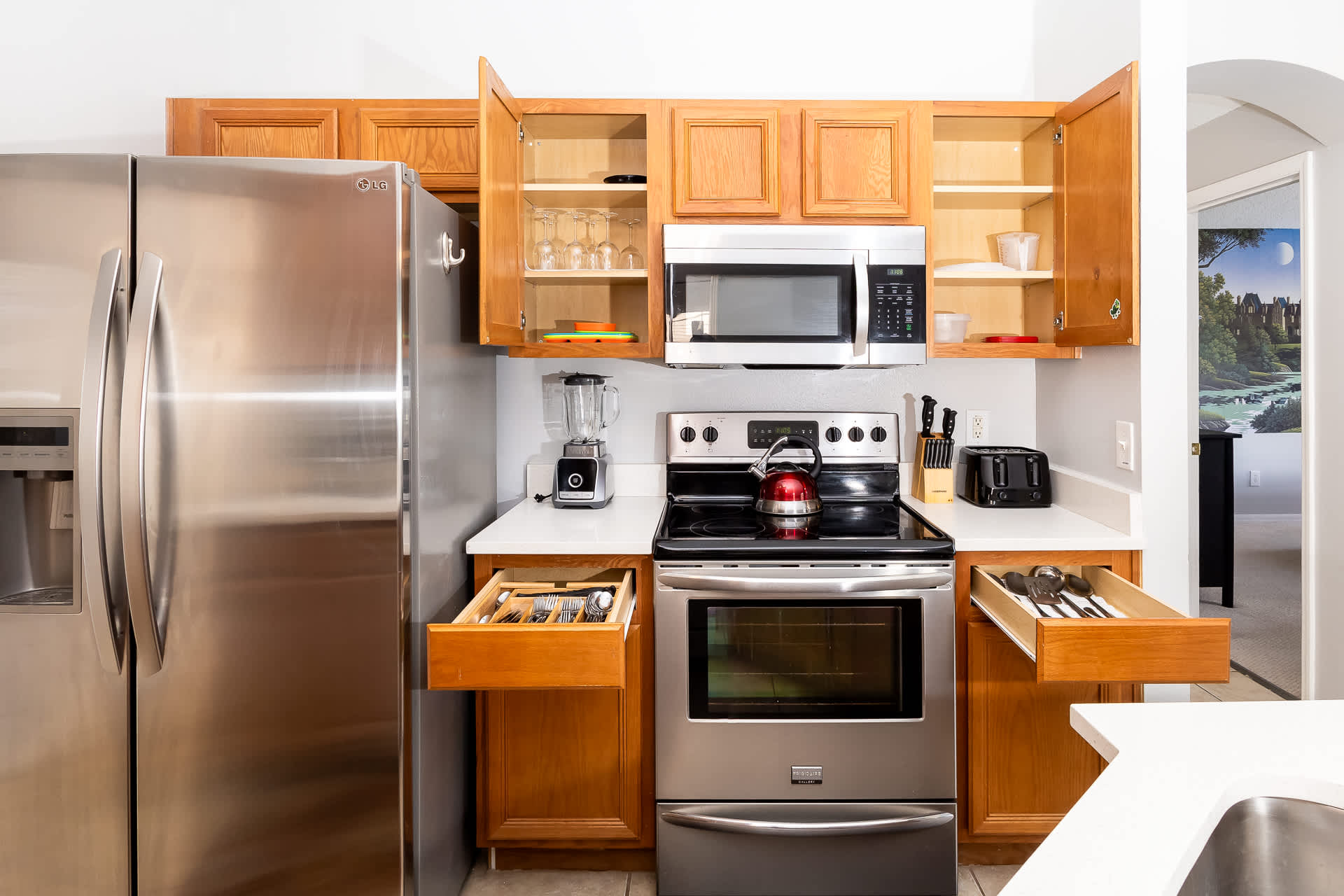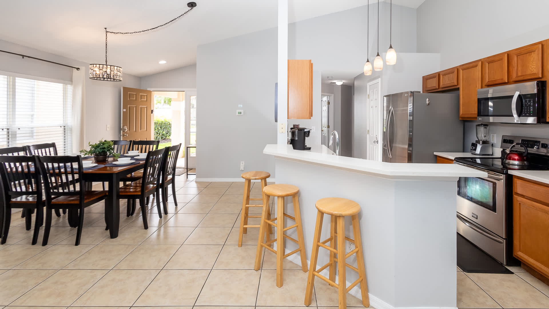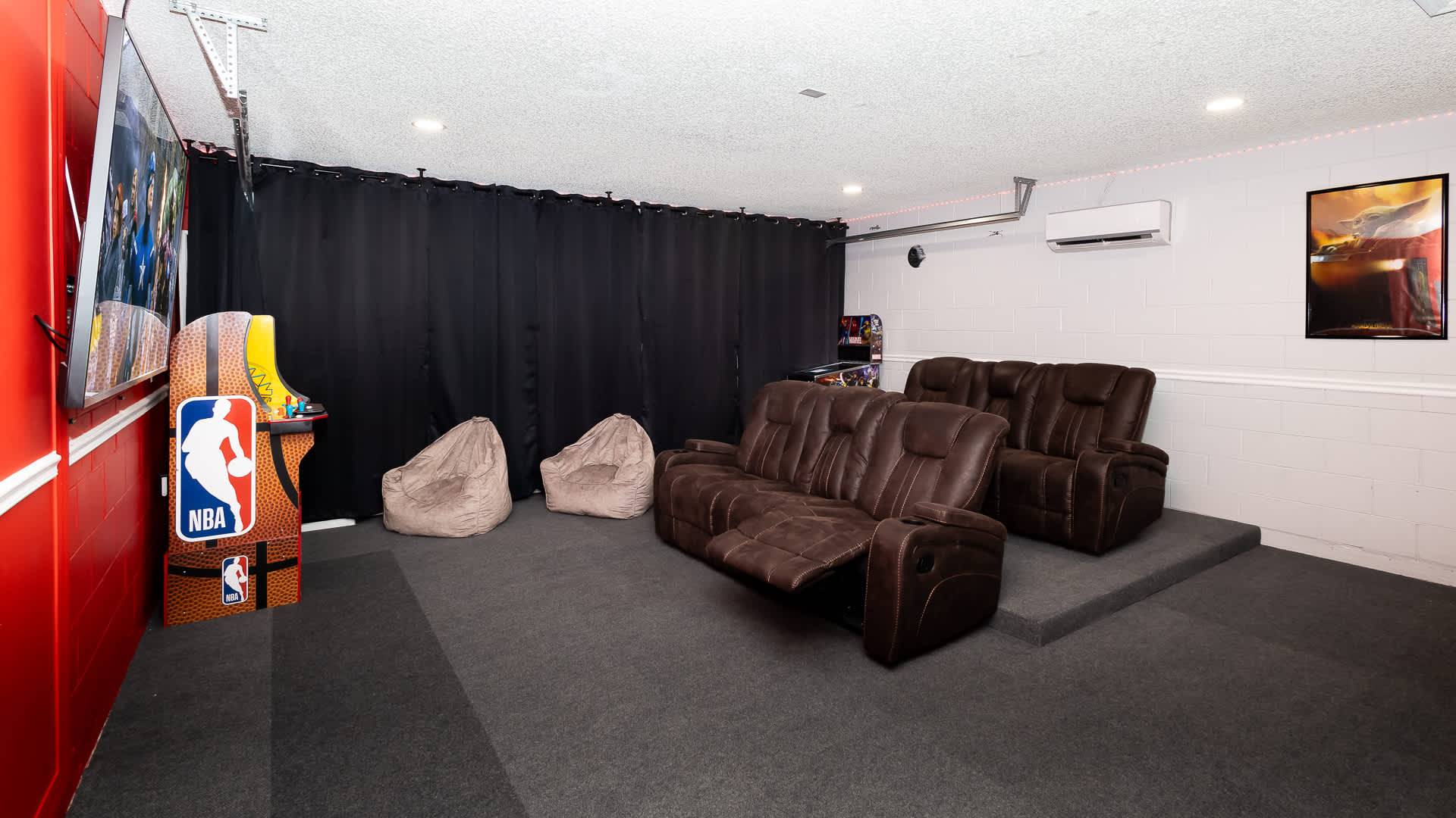 Inside the home, the open floorplan allows enough space for everyone to spread out and find their own private corner while bringing you back together in communal spaces designed for relaxation and connectivity. The cozy living room offers a plush L-shaped sofa to rest your feet while you stream episodes of all your favorite movies on the smart TV. Steps away, the modern kitchen is fully equipped to assist you in preparing meals large or small, with stainless steel appliances, shiny quartz countertops, and ample cabinetry. Dining is made easy between the formal table with seating for 8, high-top stools at the counter for 3, or a smaller dining table with seating for 4. After blissful days filled with adventure, keep the excitement flowing in the garage-converted game room featuring a media room with recliners, arcade games, and a smart TV.
