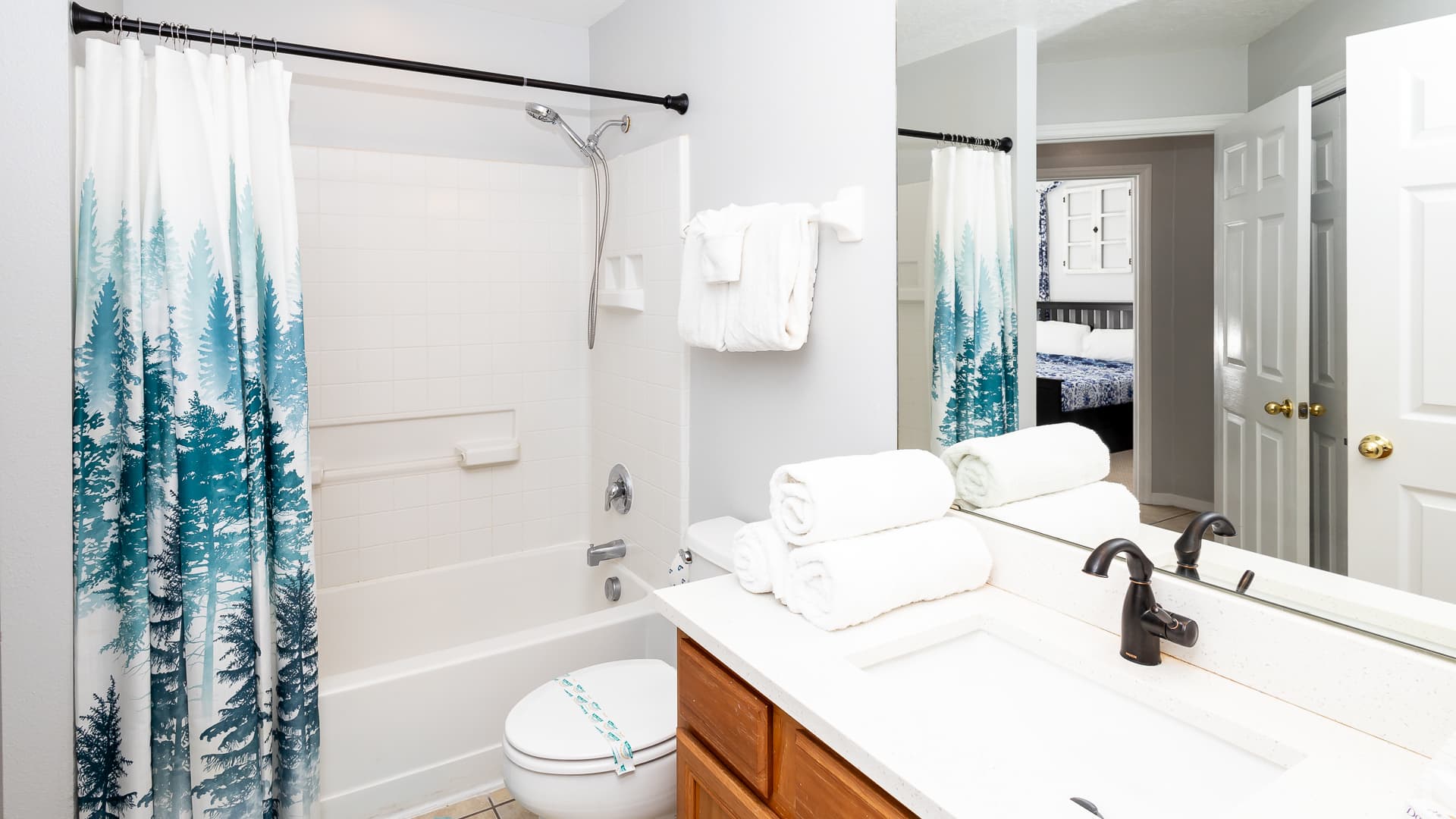 The home also includes an additional full guest bathroom with a single vanity and shower/tub combo.