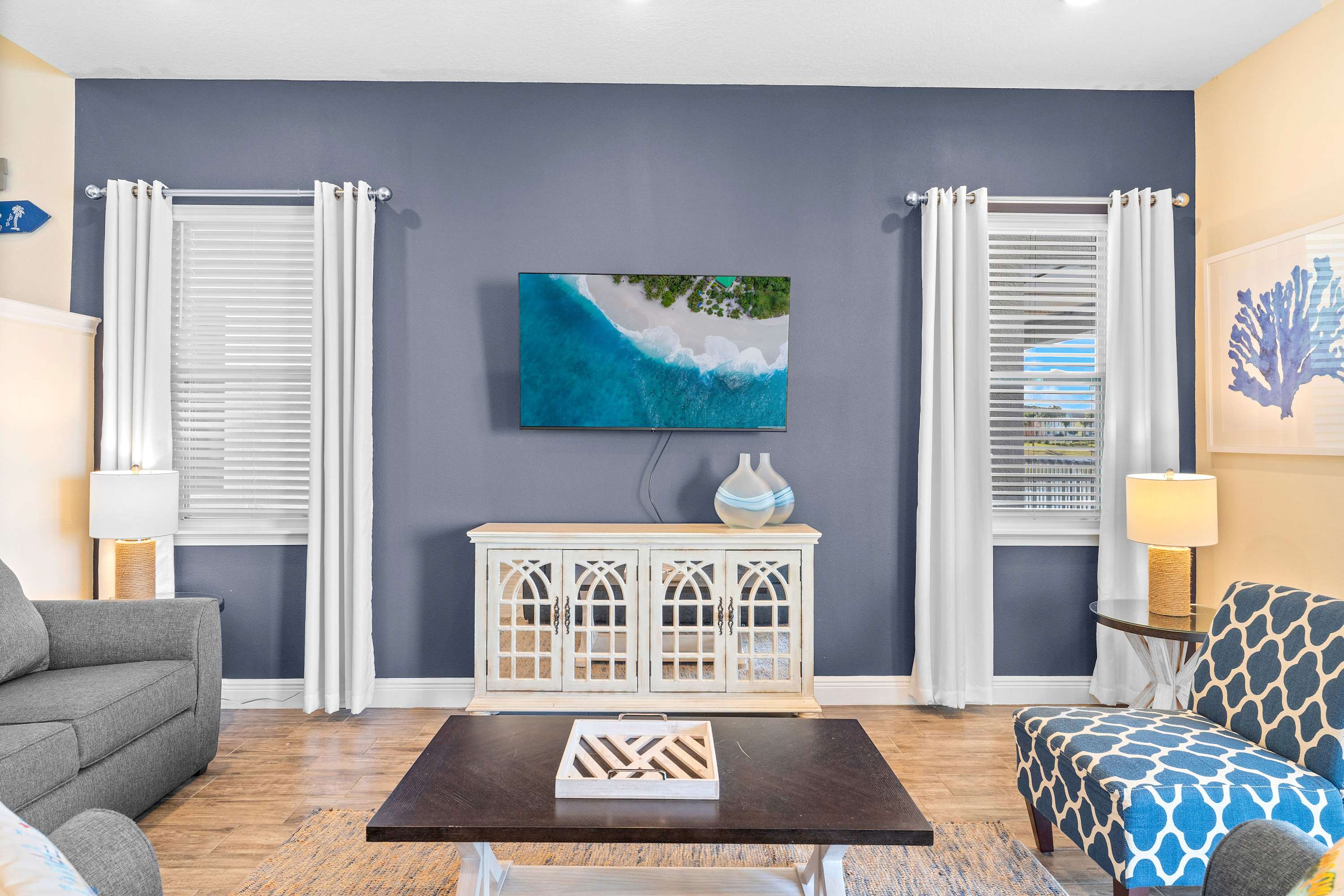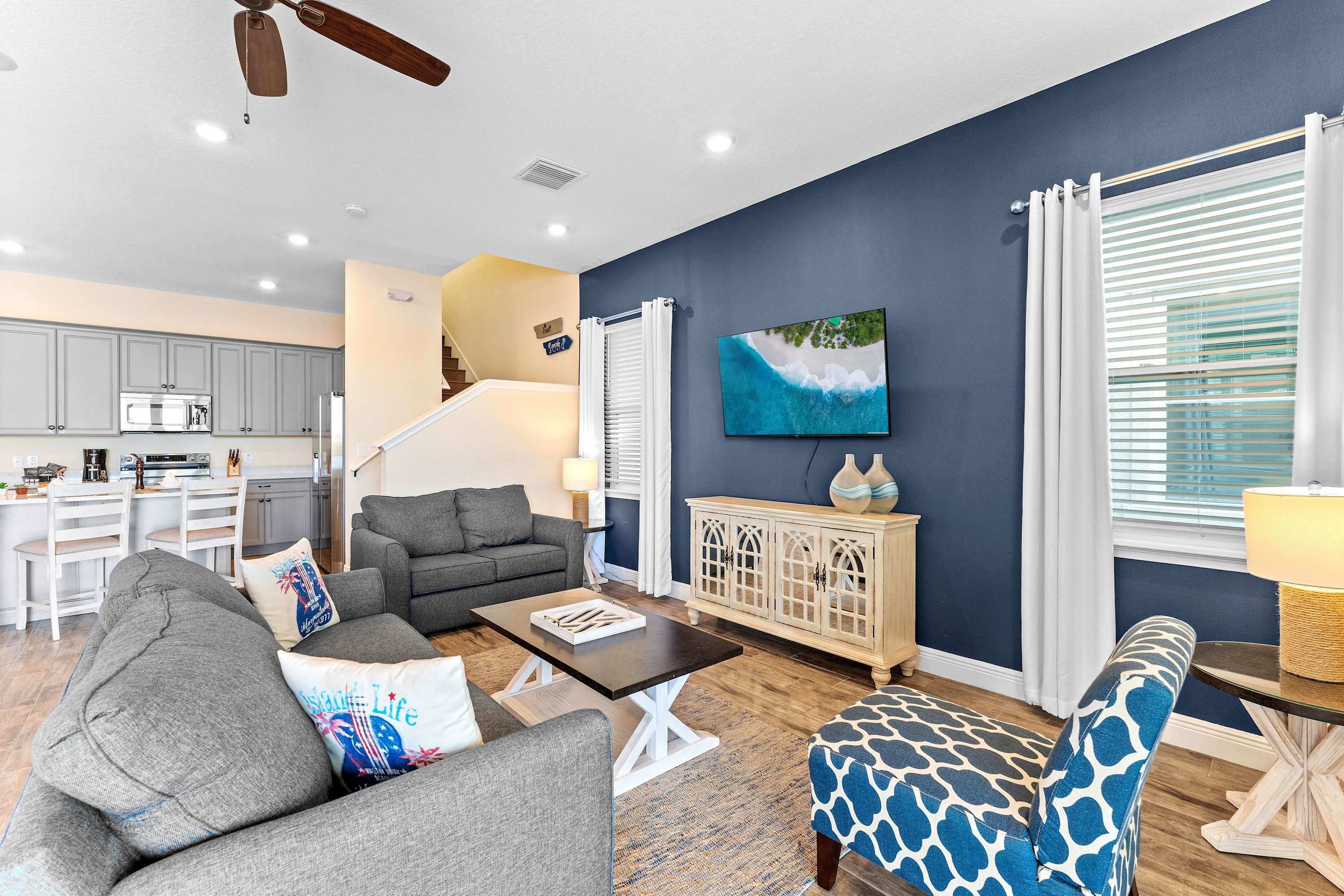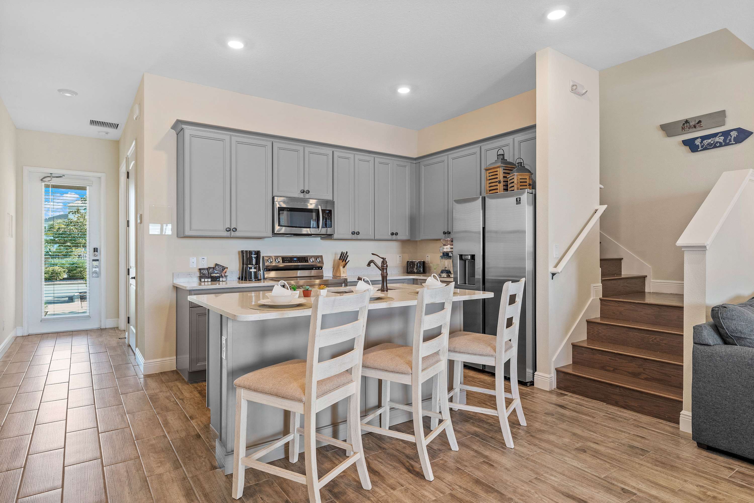 Inside the home, soothing neutral tones blend seamlessly with elegant, coastal-themed décor promoting calm and relaxation. Cool tile flooring runs throughout each room, creating synergy between spaces and keeping the ample Florida heat at bay. Sink into the plush living room sofa or loveseat while you stream a new movie or episodes of your favorite shows on the smart TV. A sophisticated dining room table can seat 5 for formal meals, while 3 high-top stools are just steps away at the kitchen island for quick and casual bites. The kitchen showcases stainless steel appliances, granite countertops, and sleek grey cabinetry stocked with all the cookware and dining ware needed to whip up convenient meals right from home. Traveling with little ones? Take advantage of child friendly amenities such as pack and play and highchair. Indulge in the luxury of a first-floor master suite complete with a seamlessly connected ensuite bath for your convenience. Enjoy the convenience of a first-floor master suite, which includes a Smart TV and private ensuite bath. The patio offers the opportunity for al fresco dining, afterward taking leisurely stroll on the sand encircling the shore. Nestled beyond the fenced-in patio on the first floor of the home, there's a quaint sandy beach area awaiting your arrival, just down the steps closest to the peaceful pond shore.