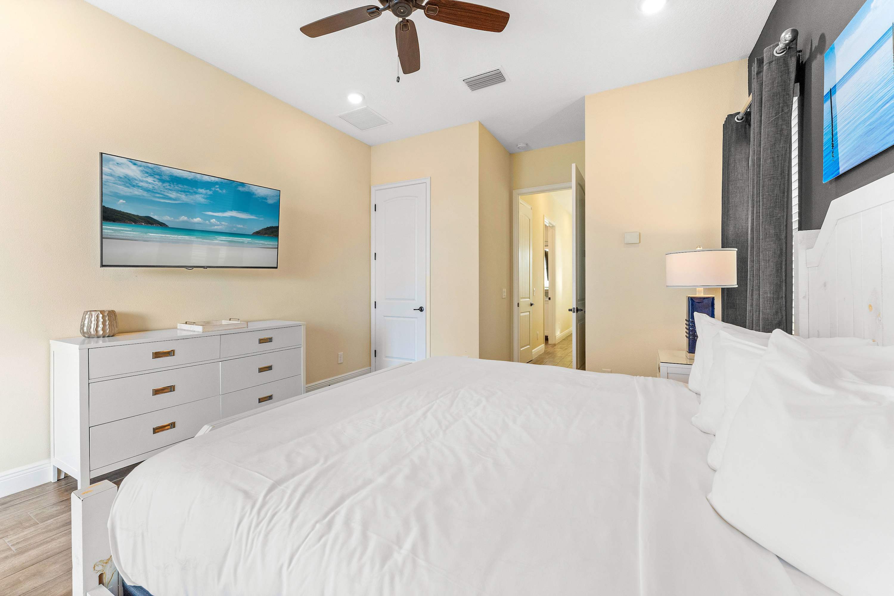 Bedroom #1 includes a king size bed, smart TV, an ensuite bathroom with a single vanity and glass walk-in shower.