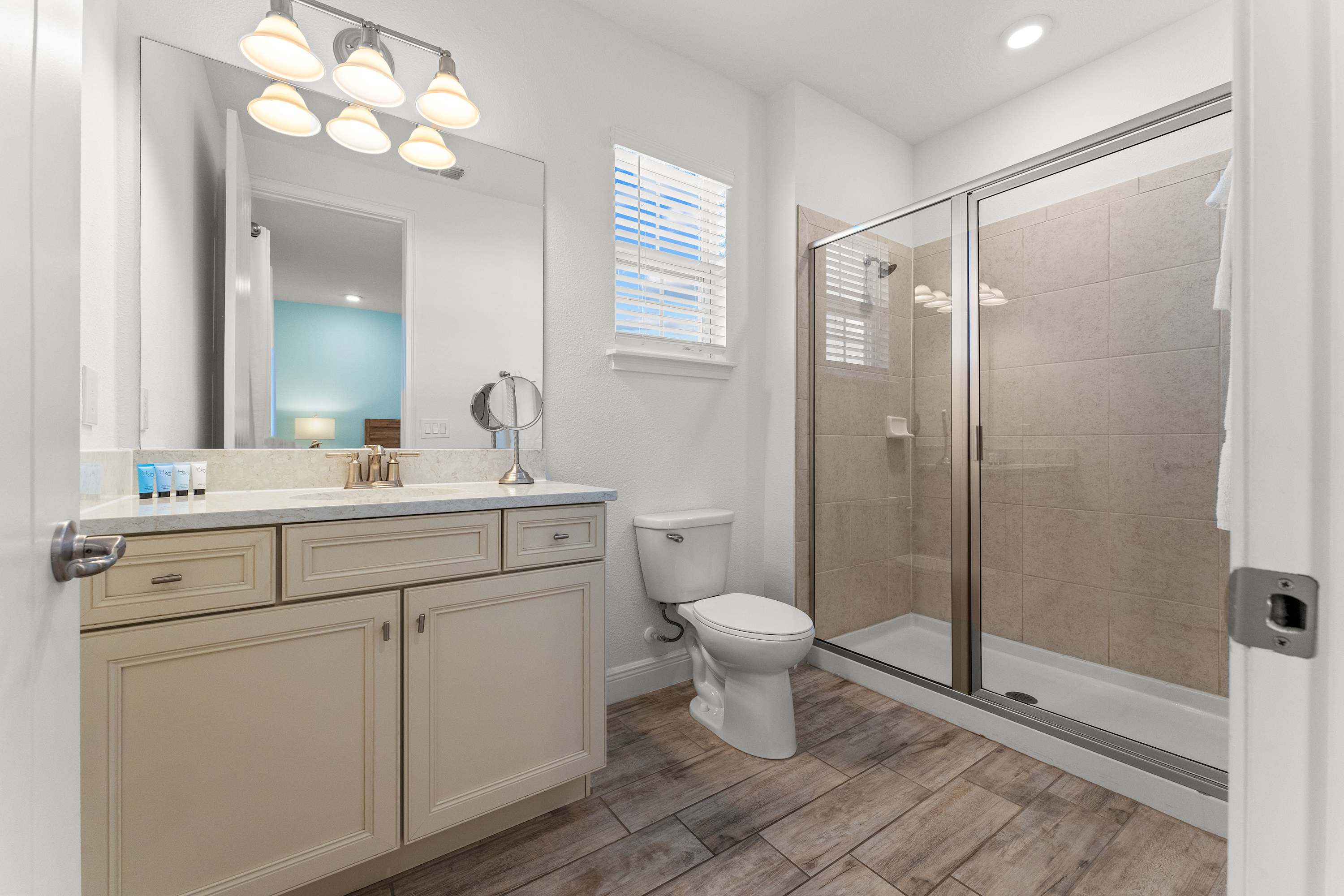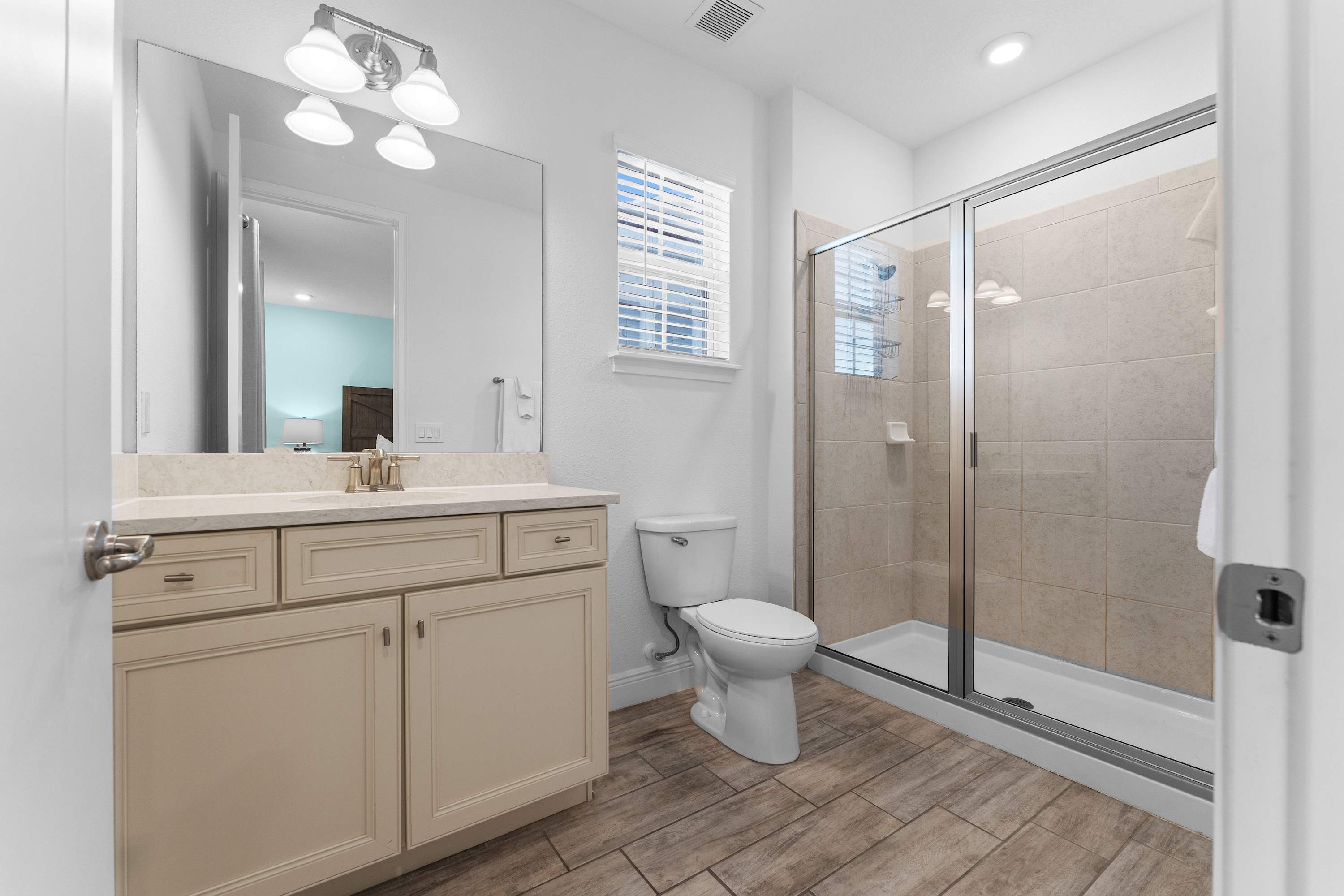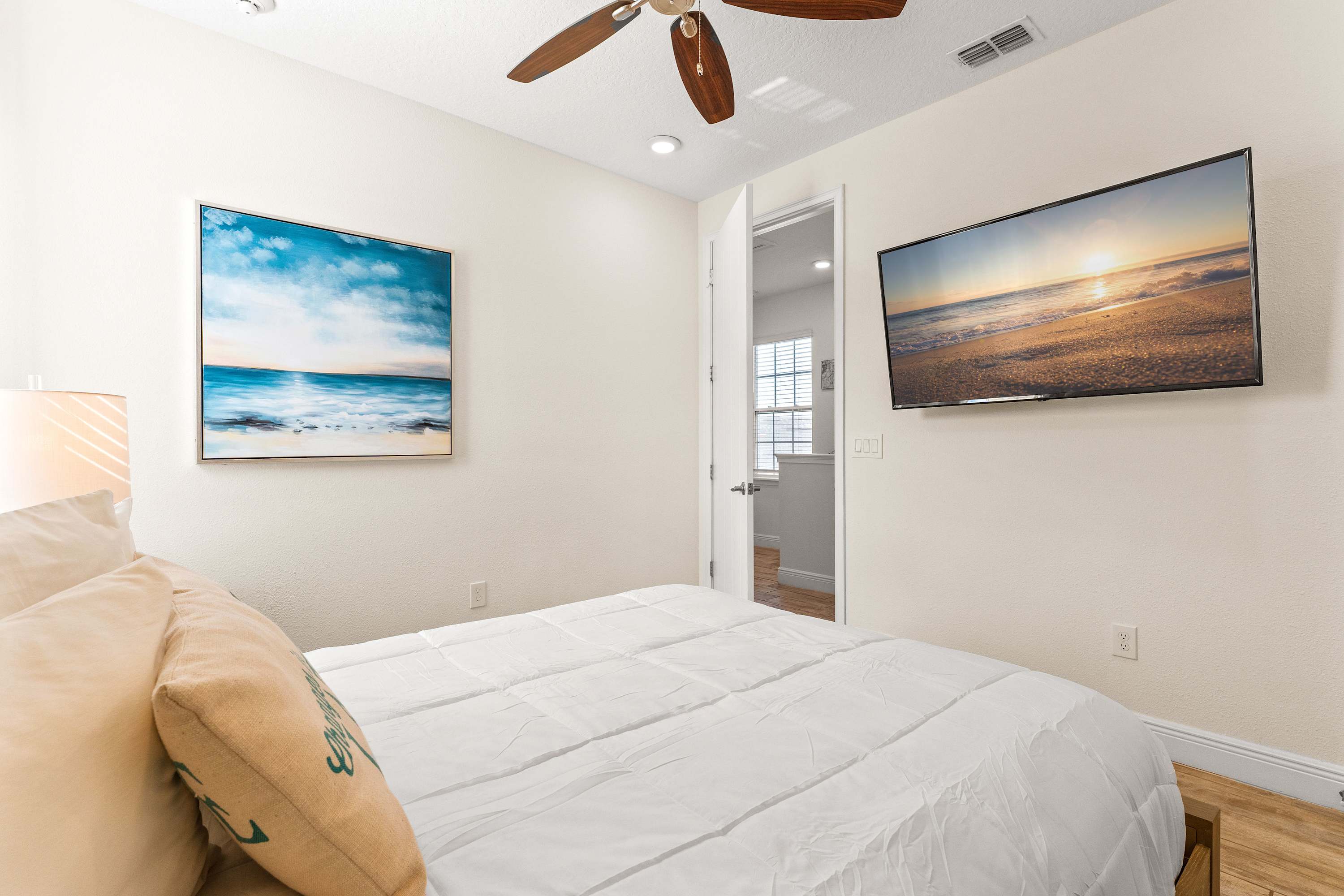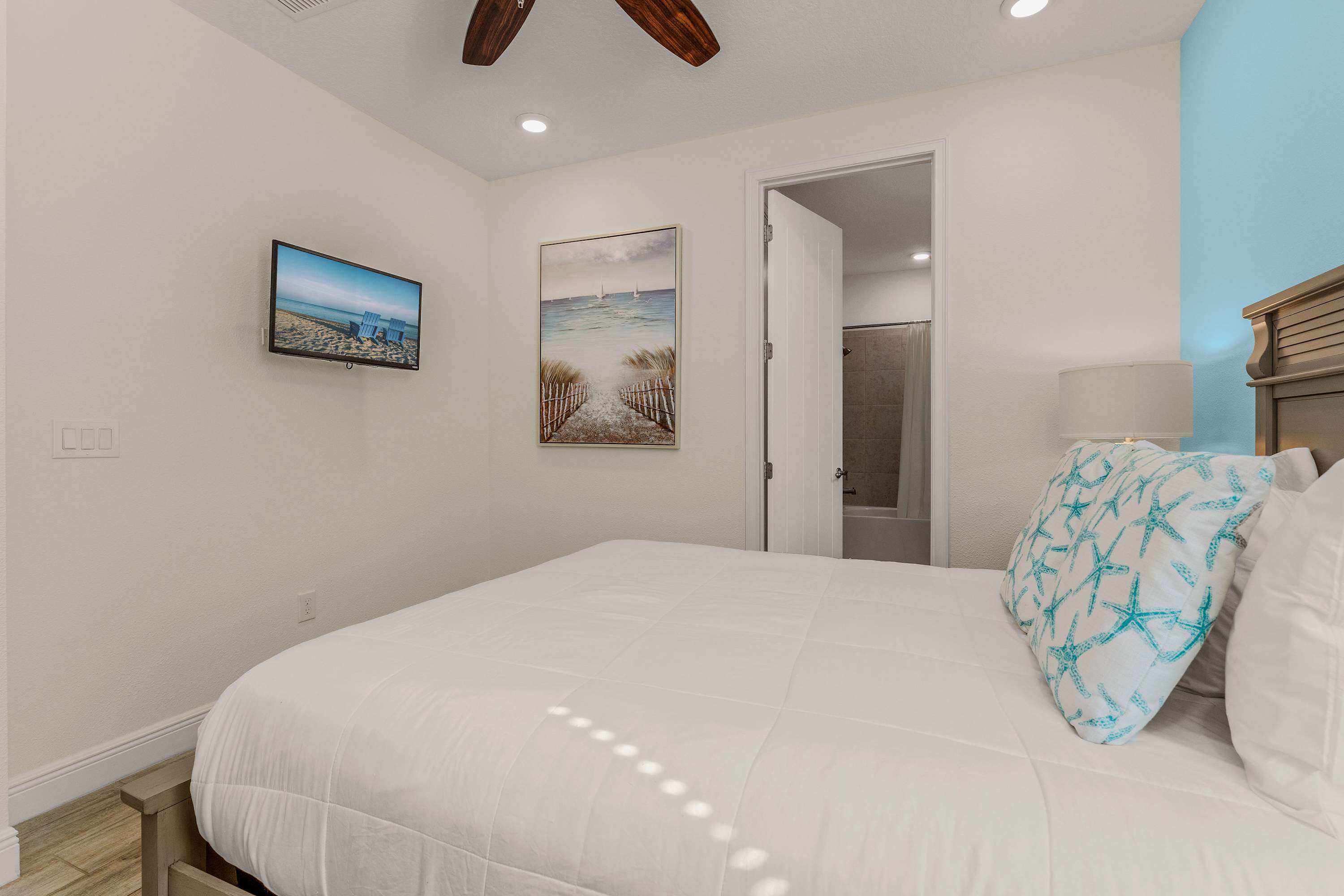 Bedroom #4 includes a queen size bed, smart TV, and ensuite bathroom with a single vanity and glass walk-in shower.