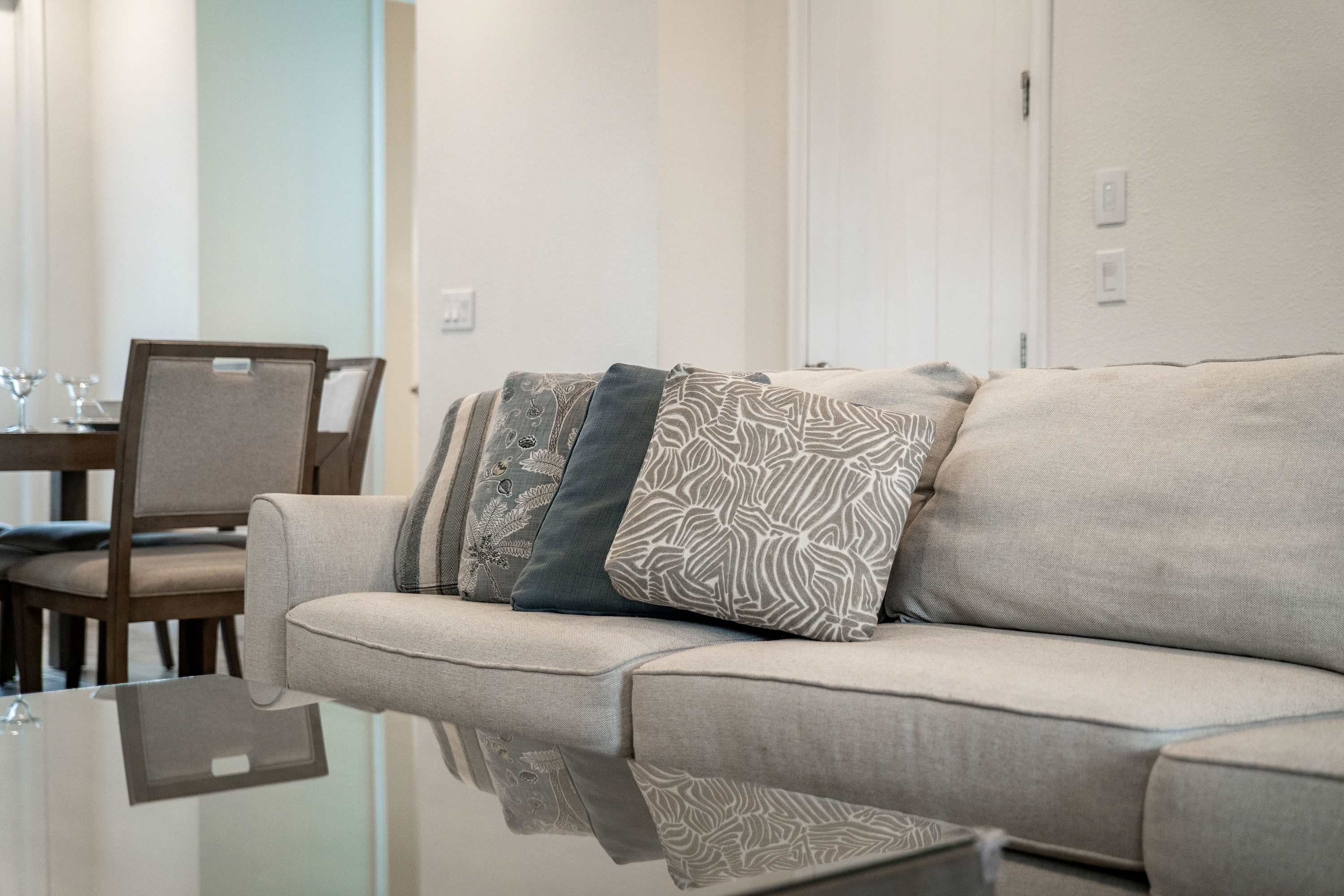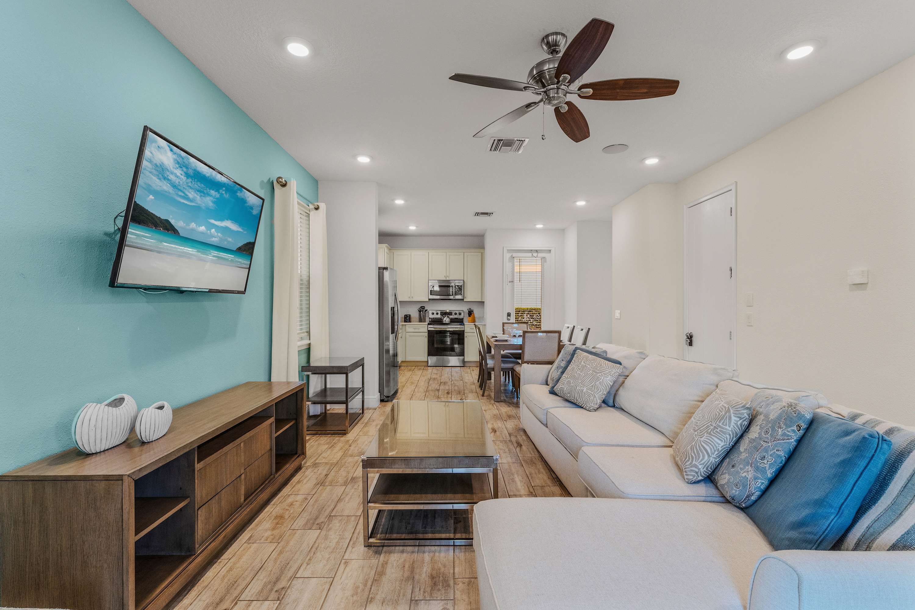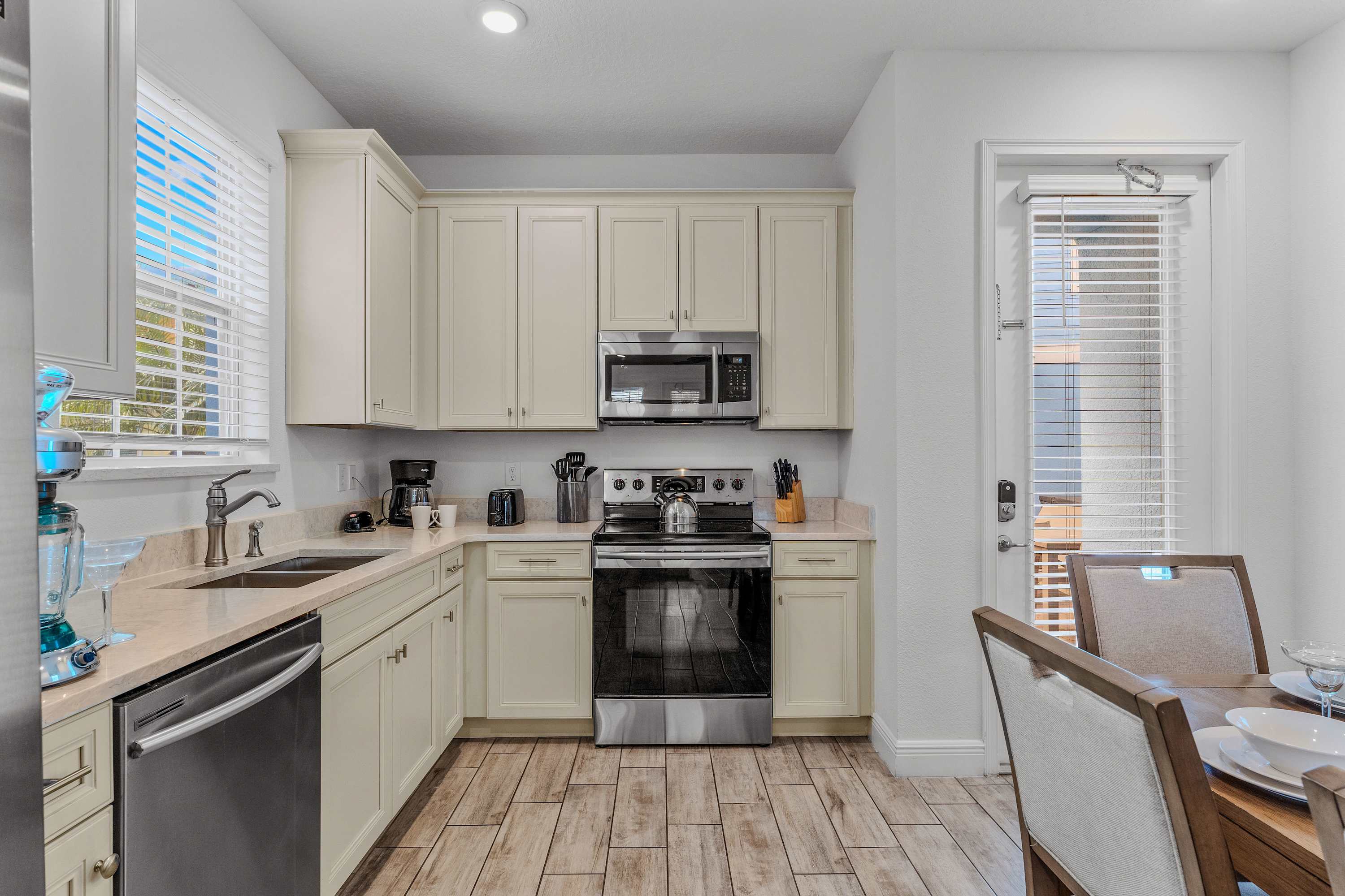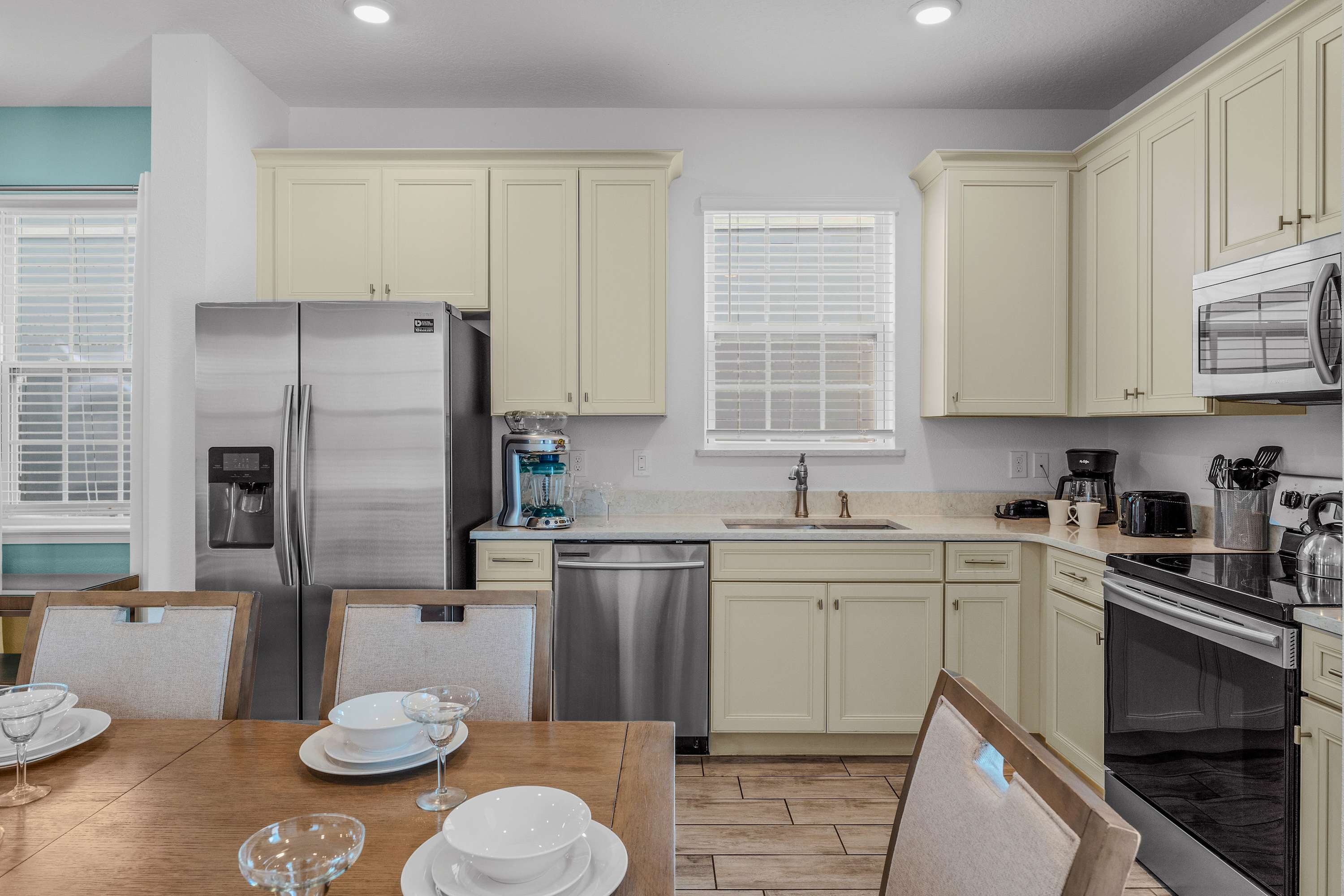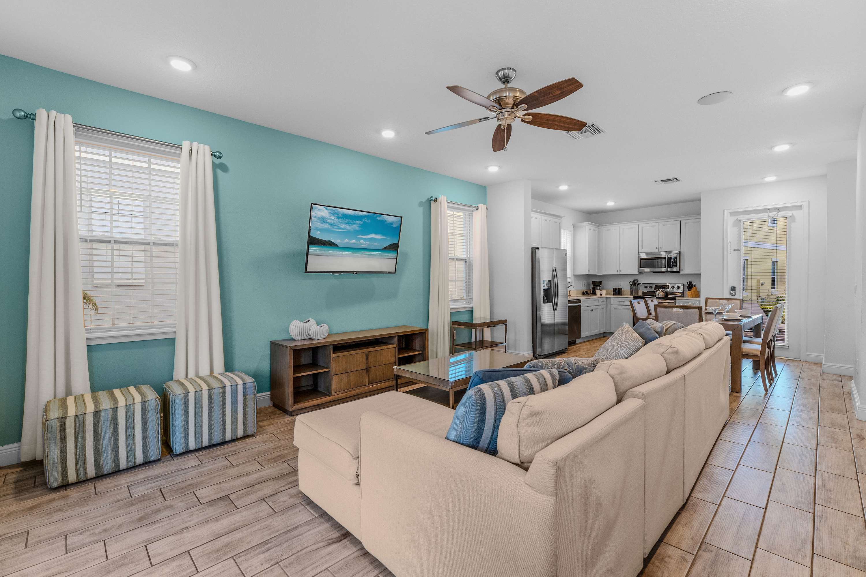 The knockout bright blue exterior blends home and sky together, a cheerful welcome to the adventures to come. Step through the doors to immerse yourself the home’s interior where a tranquil coastal theme is woven in through the color palette, décor, and furnishings. Fall back into plush sofa seating in the living room as you stream a new movie or episodes of your favorite shows on the smart TV, with convenient access to the patio just steps away. The well-appointed kitchen will indulge your inner chef to whip up delicious meals right from home, showcasing stainless steel appliances, stone countertops, and ample cabinetry stocked with all the comforts of home. Gather together for formal meals at the elegant dining table with seating for 6, afterward hosting a competitive family game night. Step onto the enchanting third-floor balcony, providing an unparalleled vantage point to savor the breathtaking spectacle of Epcot and Magic Kingdom fireworks.