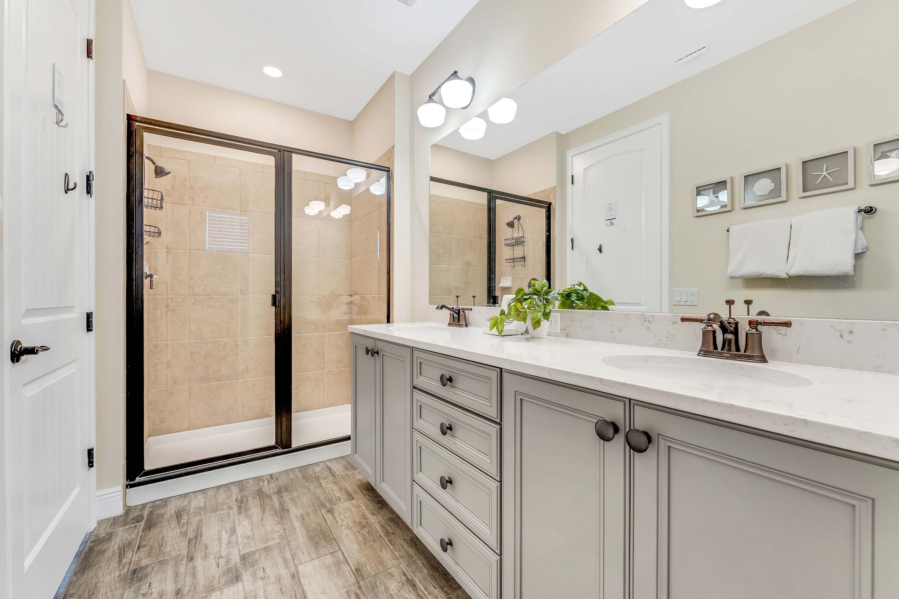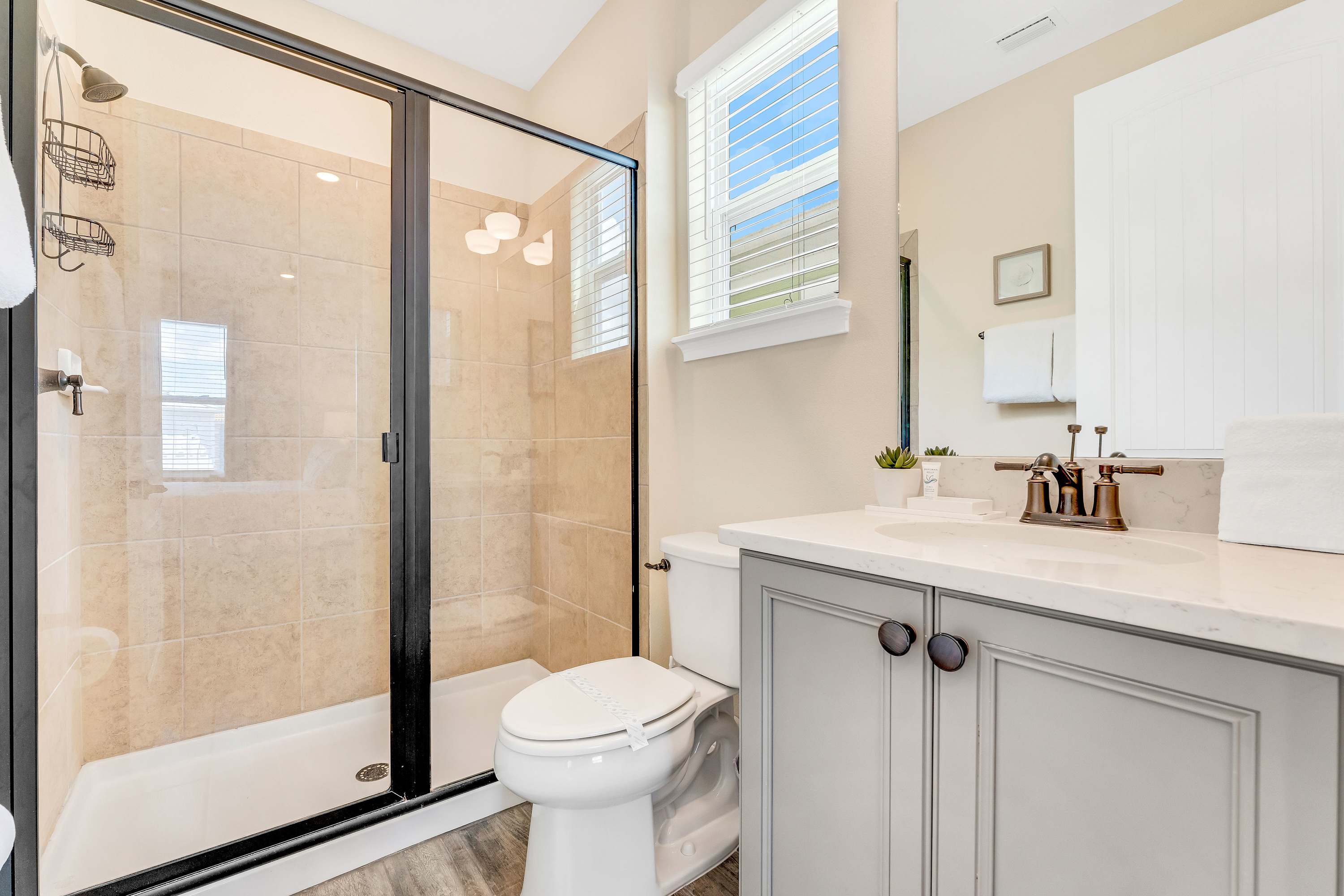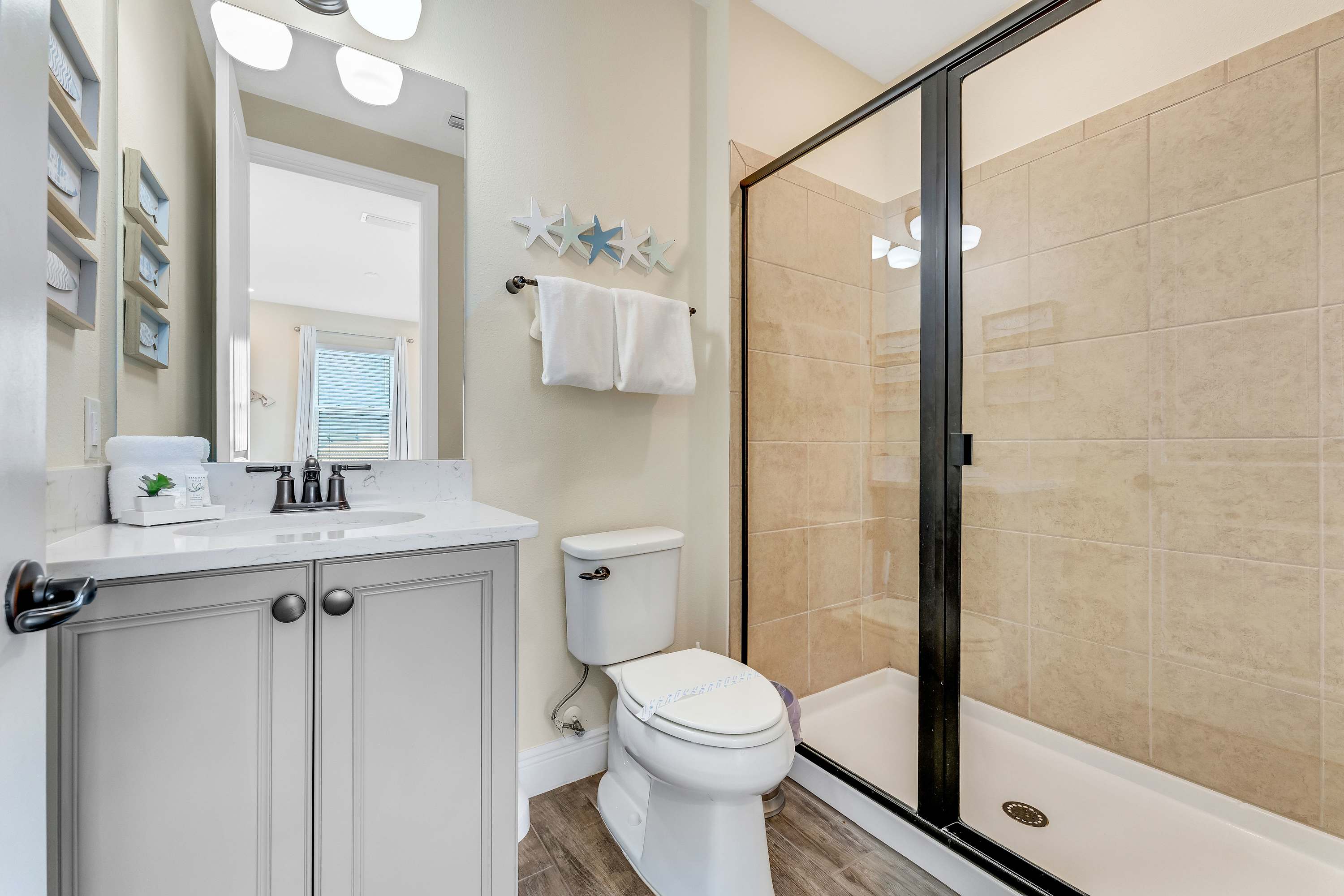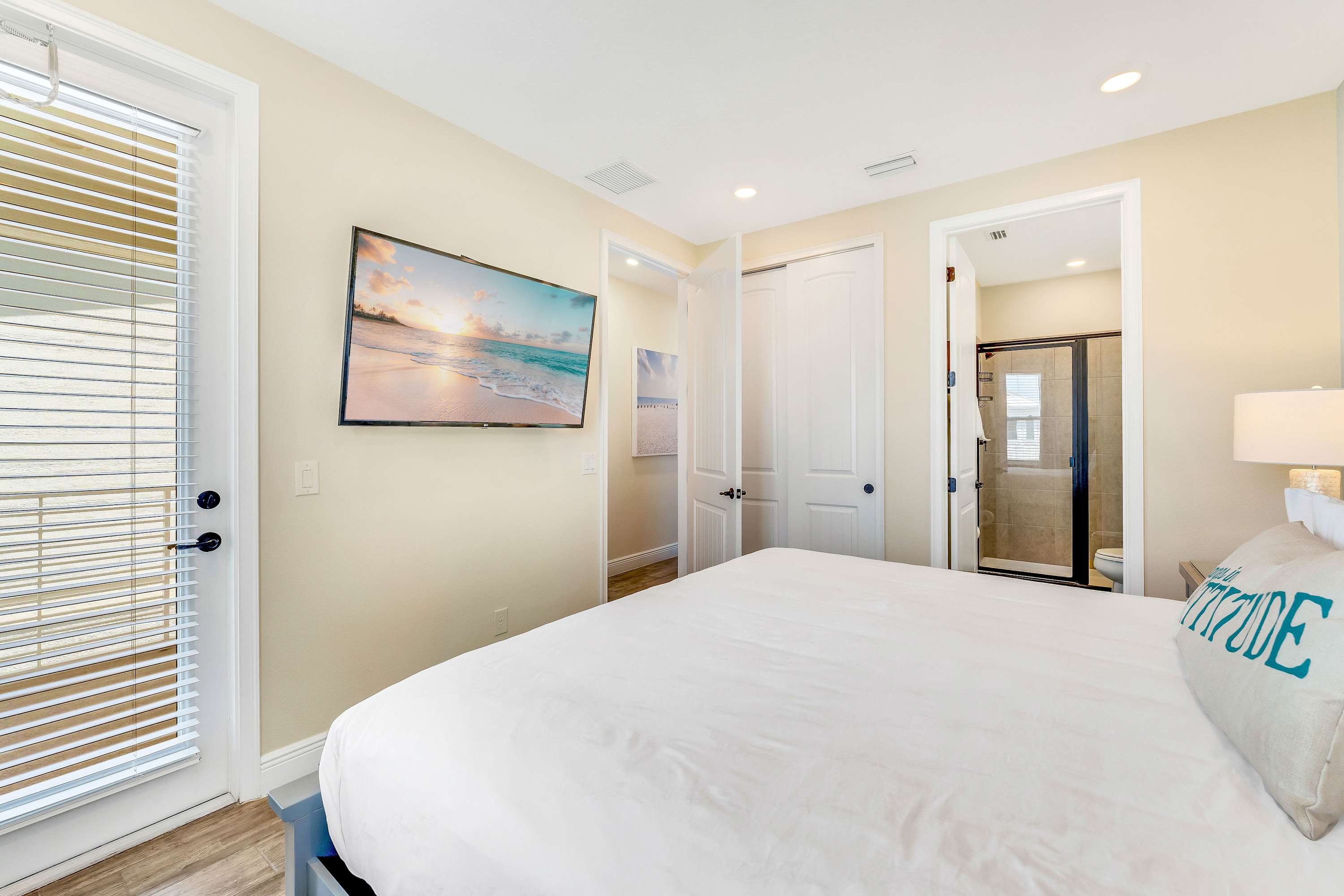 Bedroom #3 includes 2 twin beds, a smart TV, and ensuite bathroom with a single vanity and glass walk-in shower.