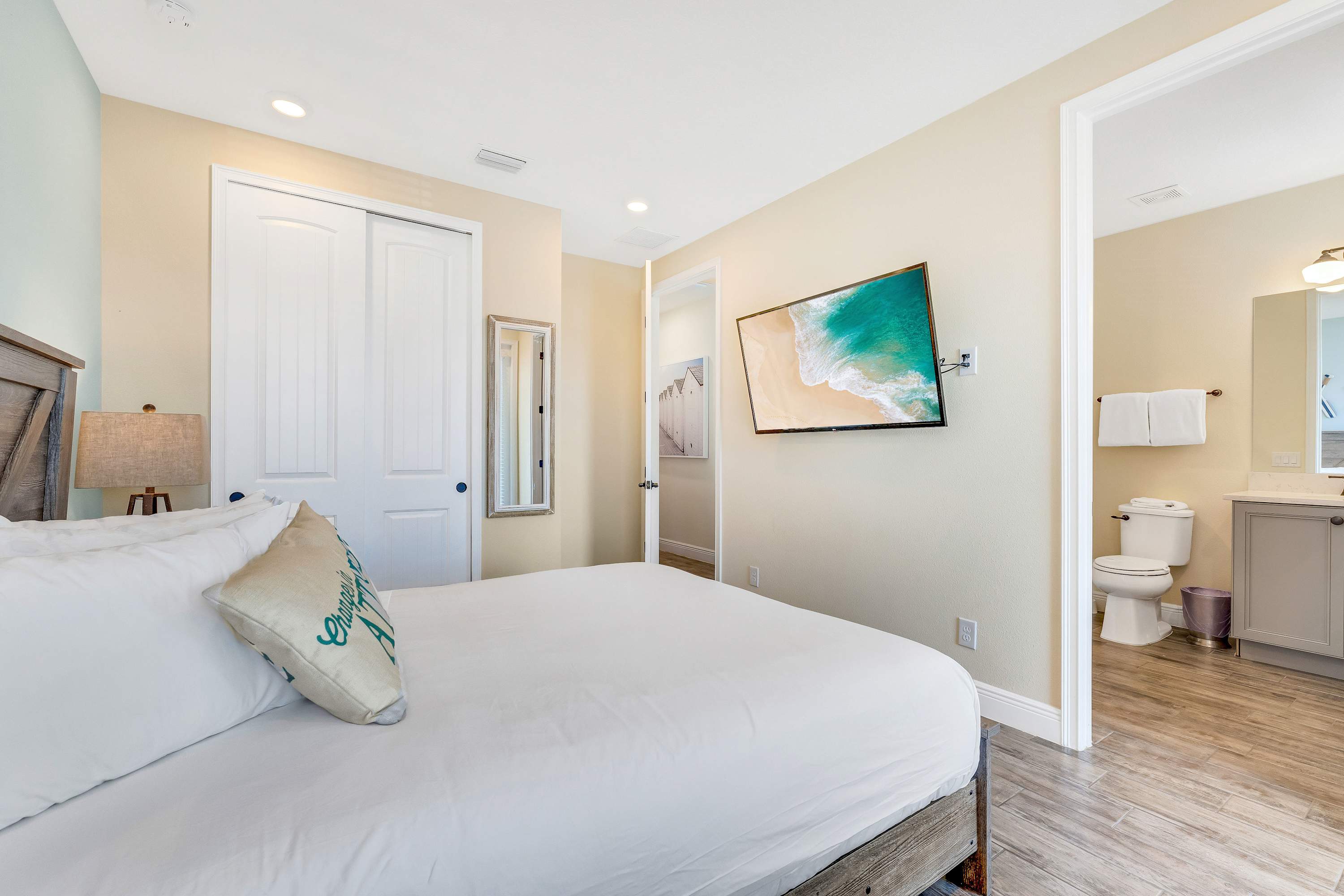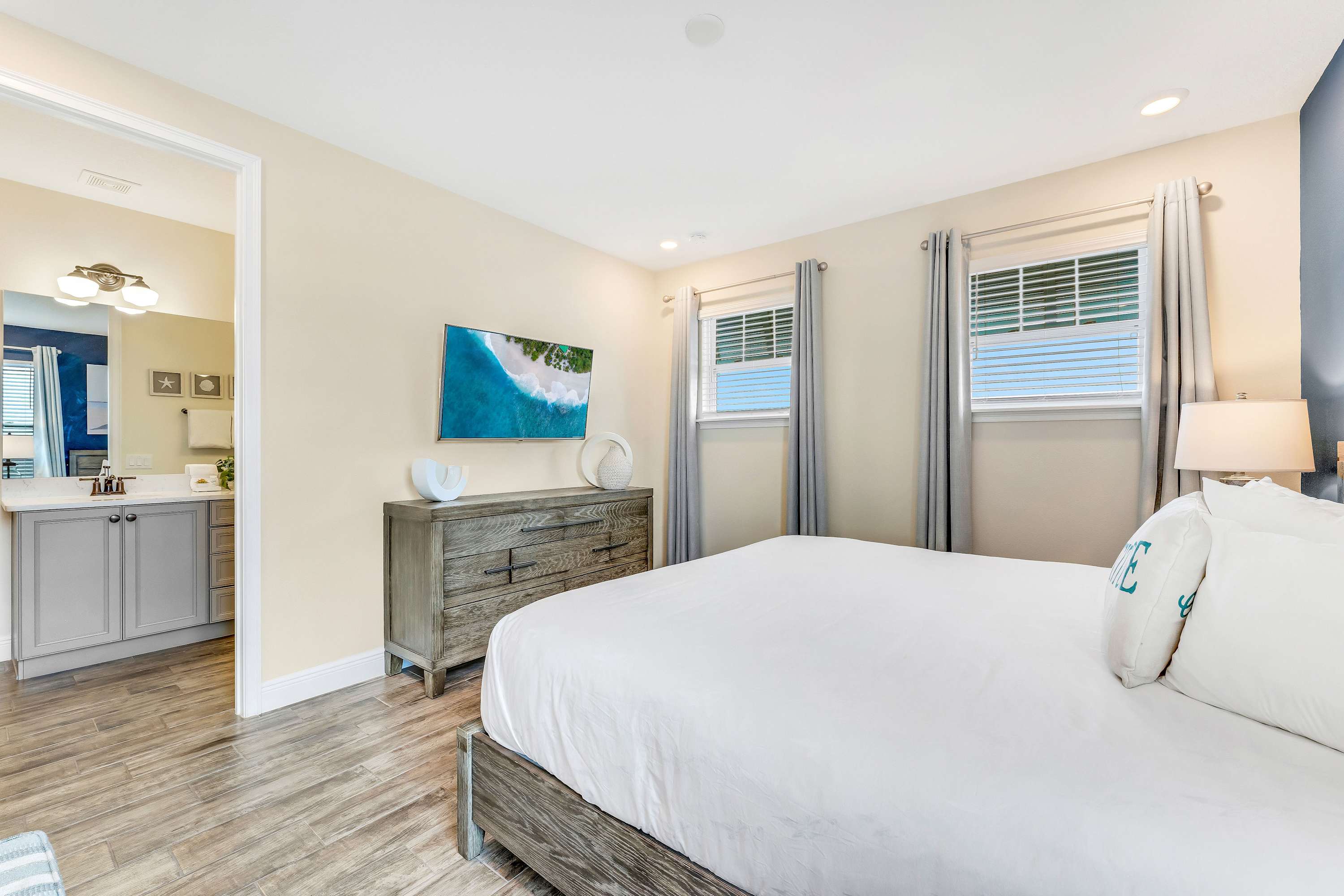 Bedroom #4 includes a king size bed, smart TV, and ensuite bathroom with a dual vanity and glass walk-in shower.
