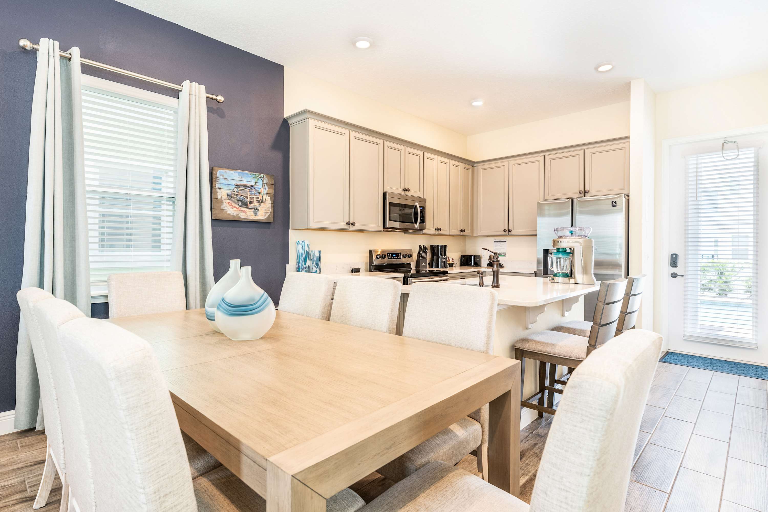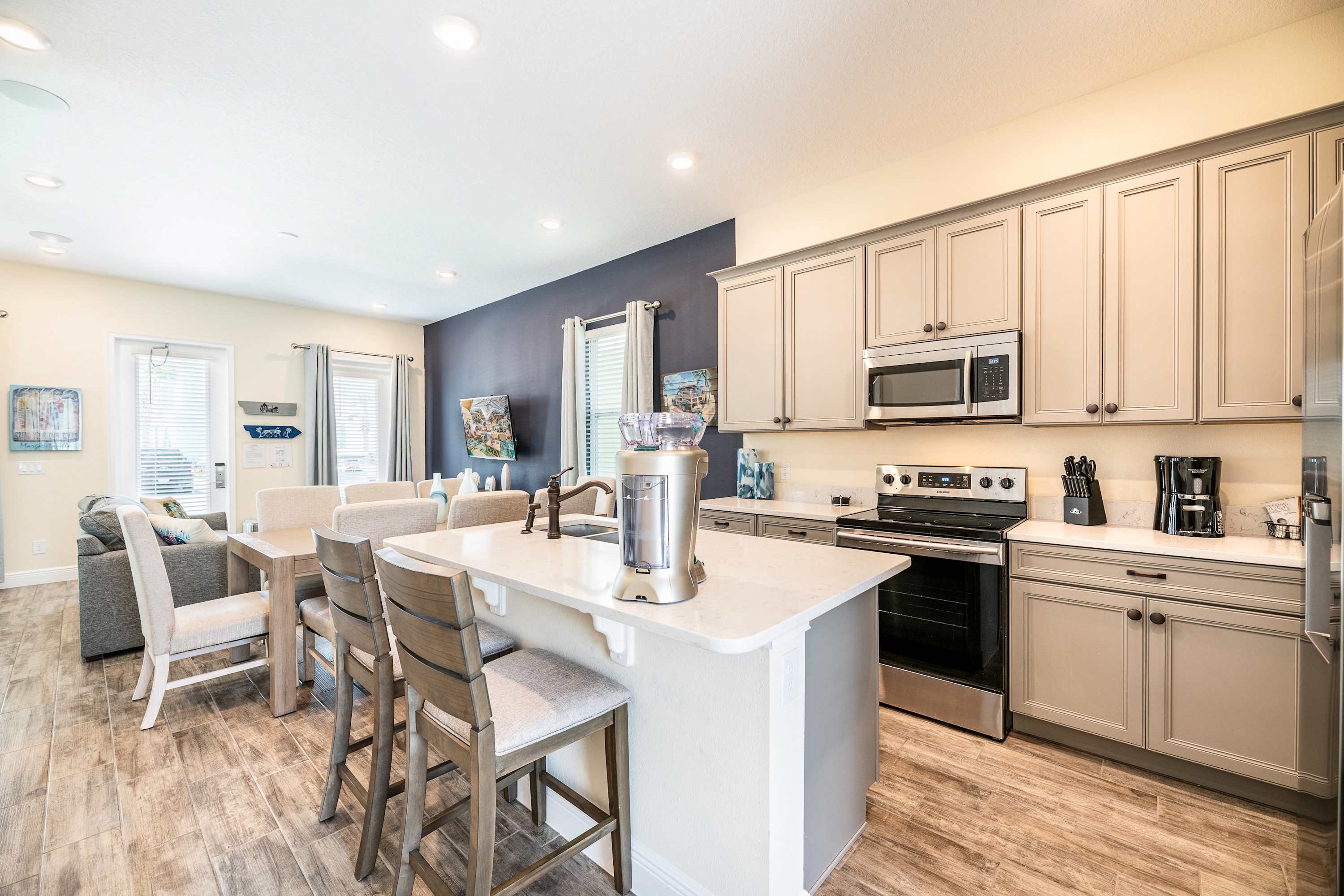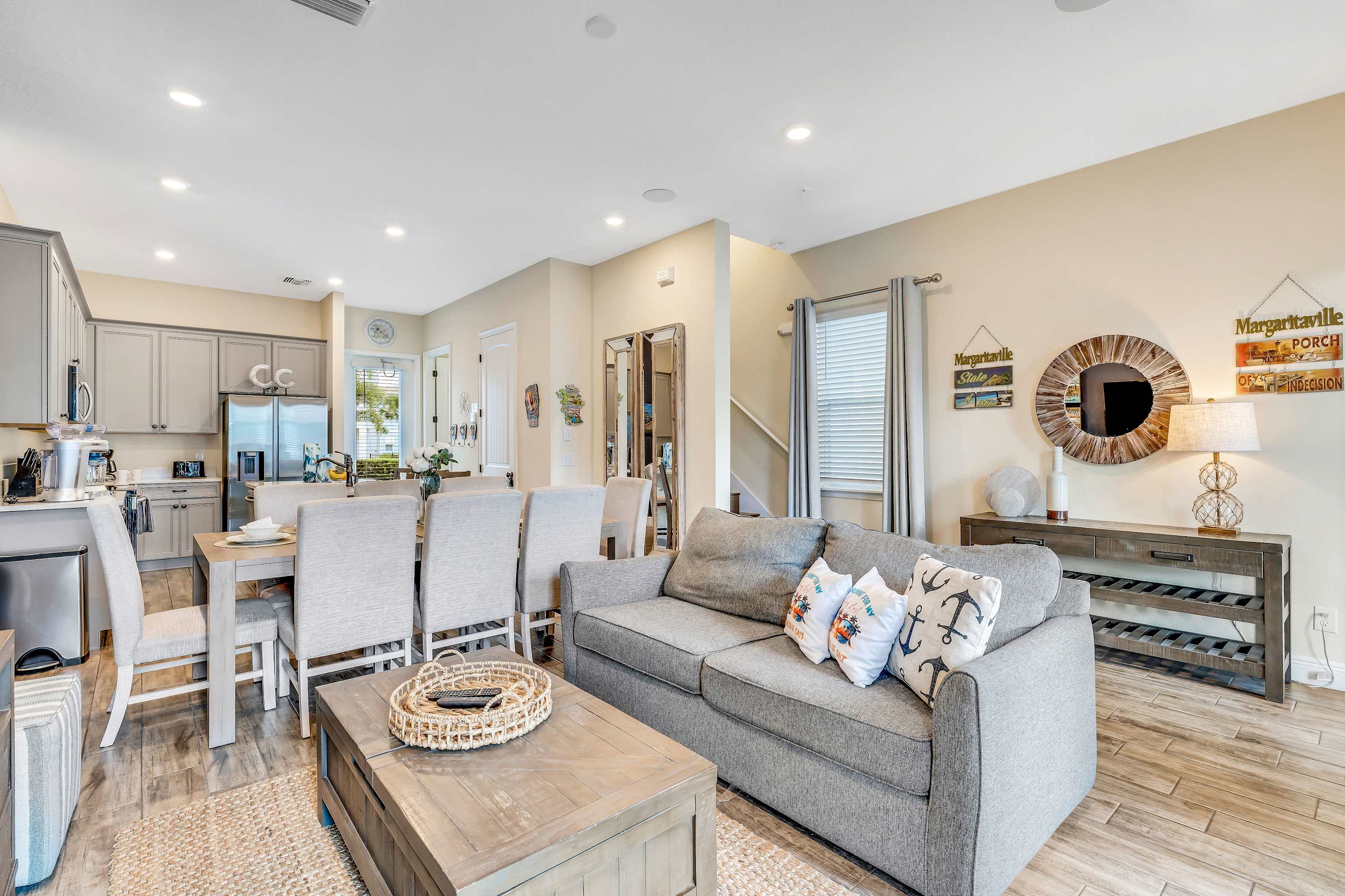 Head indoors to beat the heat by surrounding yourself in the soothing cool tones of the décor and furnishings, promoting peace and calm after energetic days spent out and about. Sink into the plush living room sofa as you stream that new movie you’ve been saving on the smart TV. The open floor plan seamlessly blends spaces together, so even steps away in the kitchen you’ll remain connected to the conversation. Fully equipped with stainless steel appliances, glossy granite countertops, and cabinetry stocked with cookware and dining ware, all your mealtime needs will be well met. Gather together for formal fare at the sophisticated dining room table with seating for 8 or snag a stool up at the island for more casual bites. Of course, no trip to Margaritaville would be complete without a cocktail or two to commemorate, and the provided margarita machine will ensure you make the very most out of your stay.