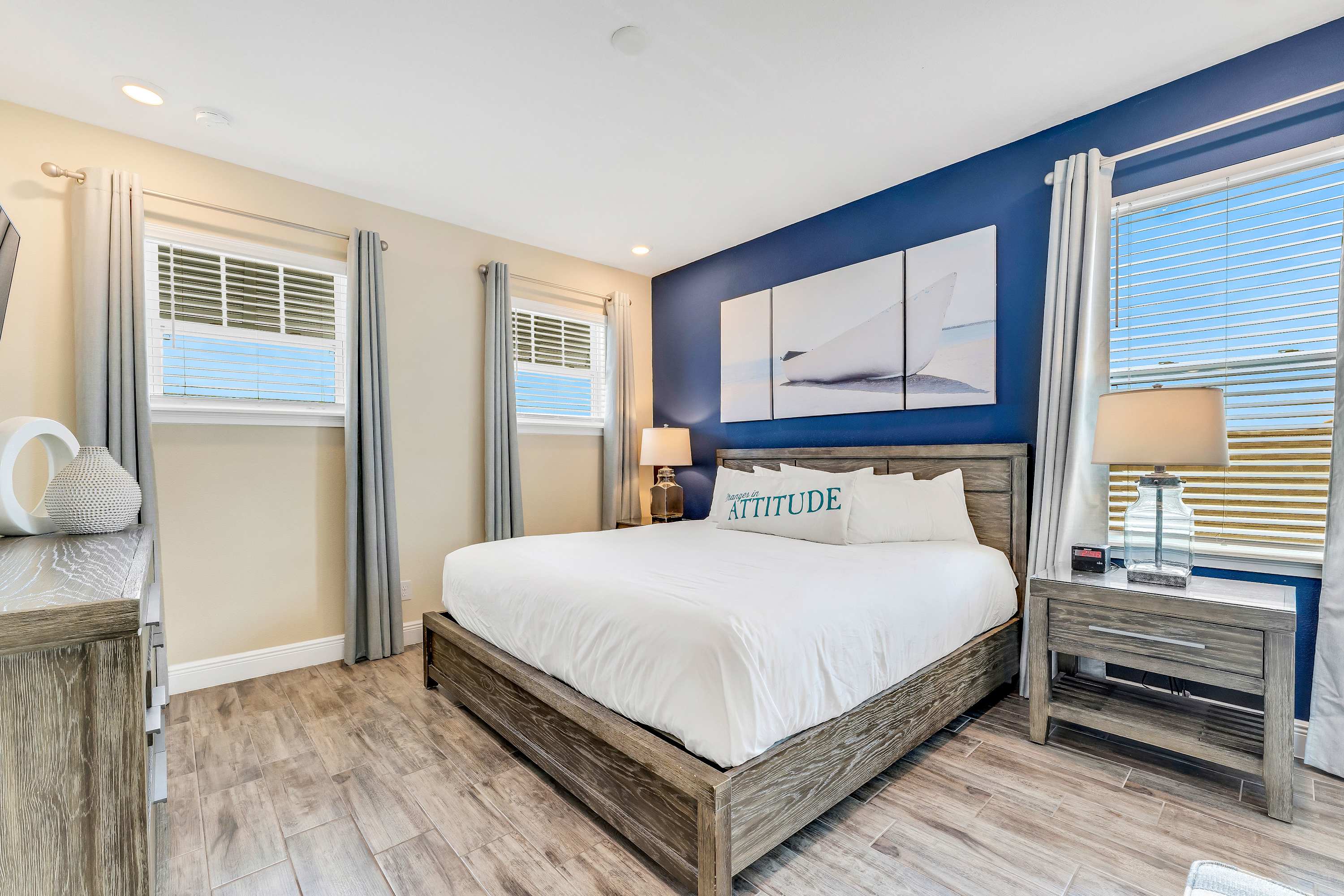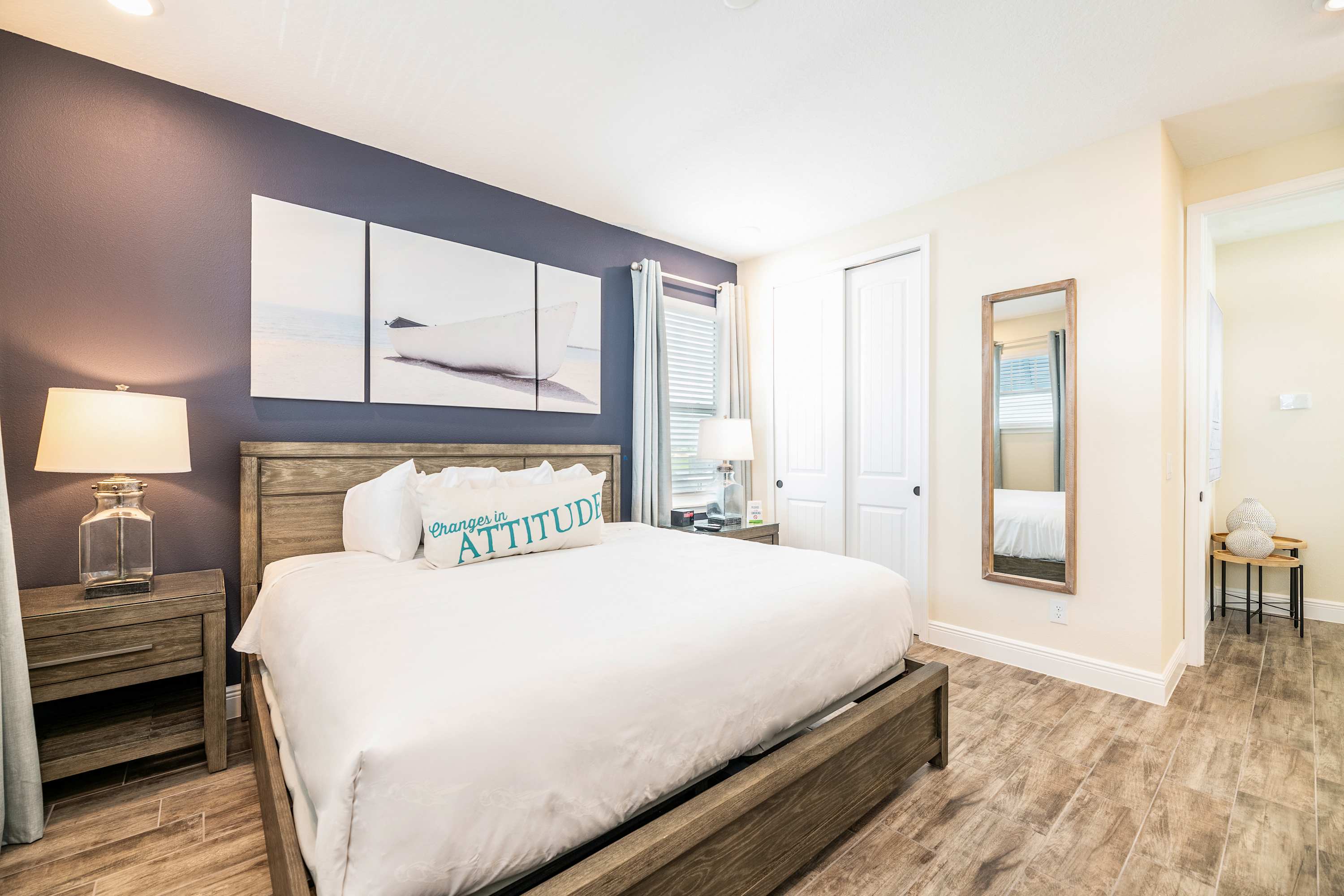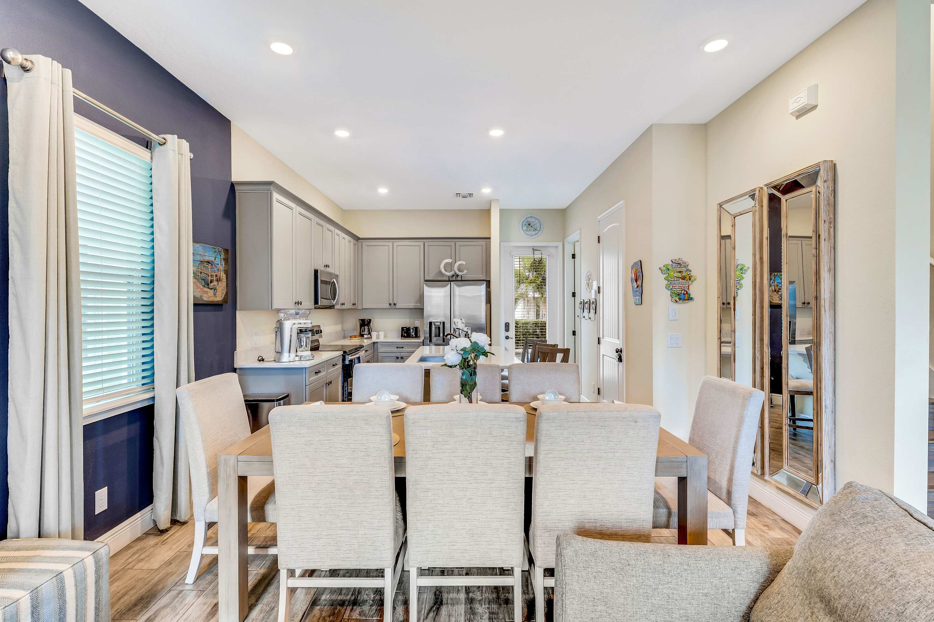 Head indoors to beat the heat by surrounding yourself in the soothing cool tones of the décor and furnishings, promoting peace and calm after energetic days spent out and about. Sink into the plush living room sofa as you stream that new movie you’ve been saving on the smart TV. The open floor plan seamlessly blends spaces together, so even steps away in the kitchen you’ll remain connected to the conversation. Fully equipped with stainless steel appliances, glossy granite countertops, and cabinetry stocked with cookware and dining ware, all your mealtime needs will be well met. Gather together for formal fare at the sophisticated dining room table with seating for 8 or snag a stool up at the island for more casual bites. Of course, no trip to Margaritaville would be complete without a cocktail or two to commemorate, and the provided margarita machine will ensure you make the very most out of your stay.