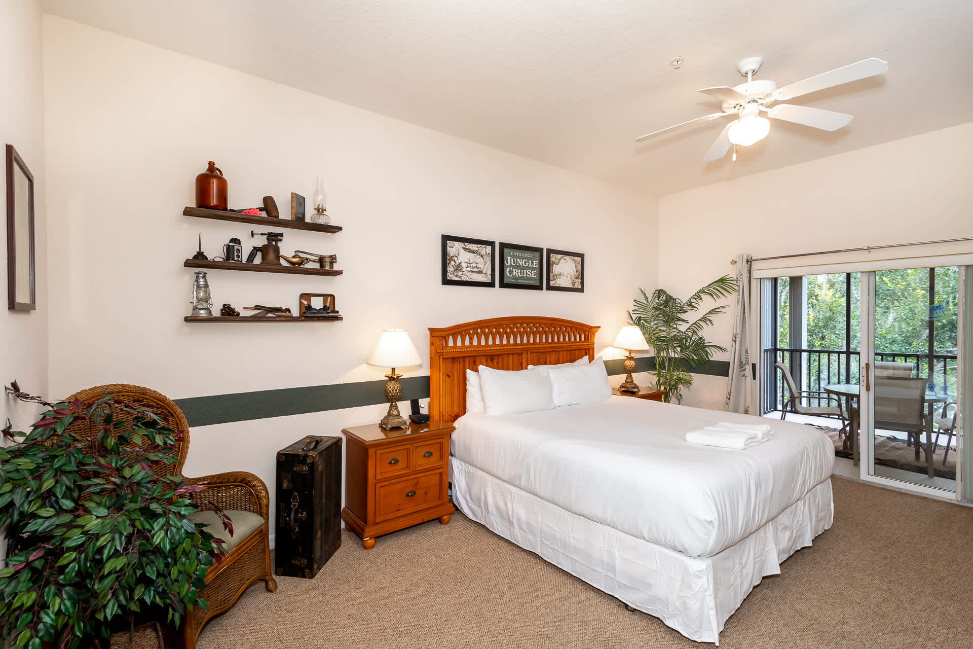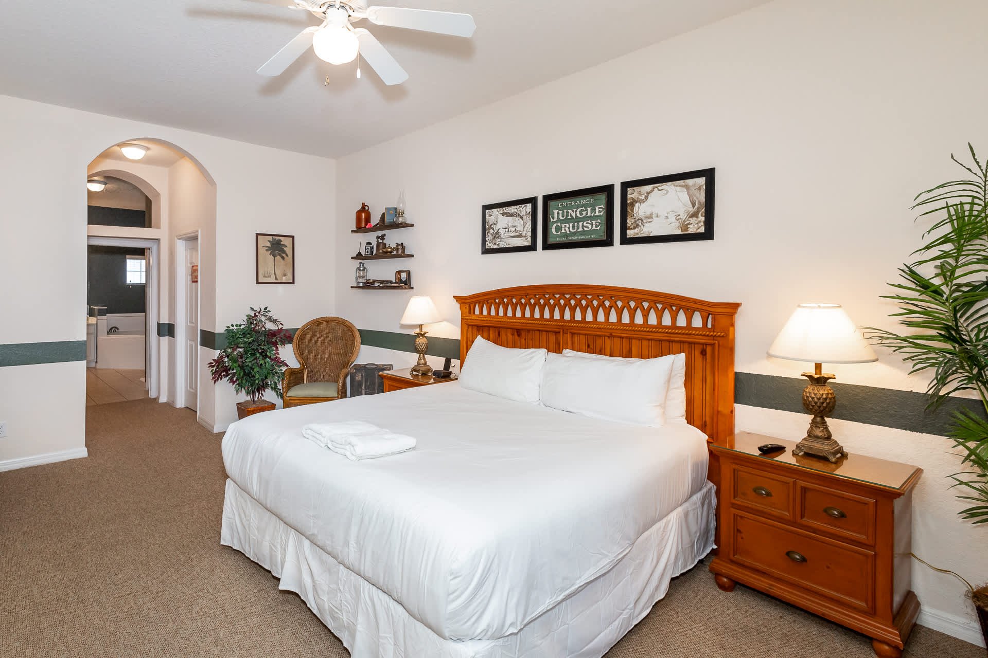Bedroom #3 includes a king size bed, smart TV, main balcony access, desk, and ensuite bathroom with a dual vanity, soaking tub, and walk-in shower. The room has been styled in a Jungle Cruise theme.