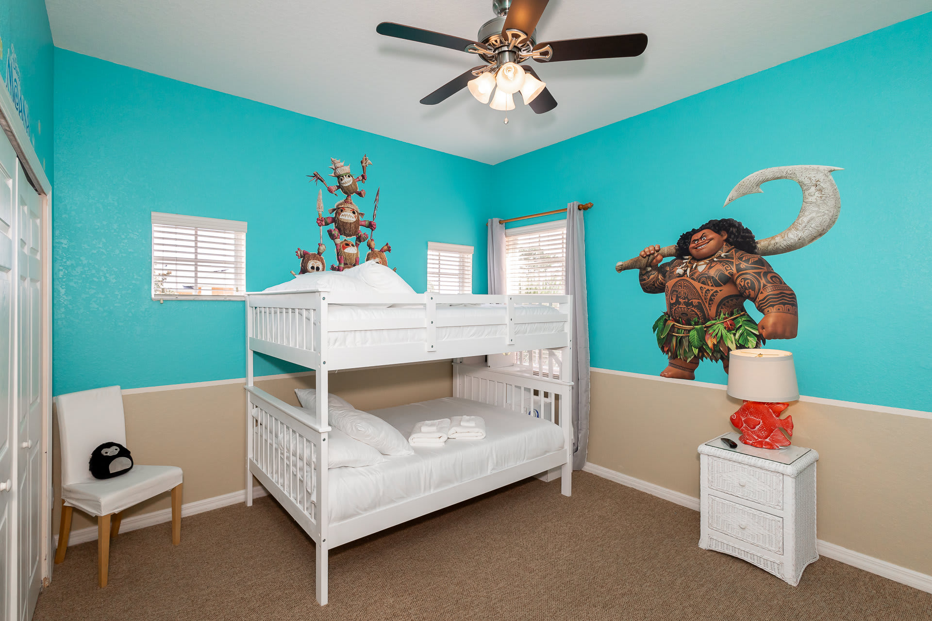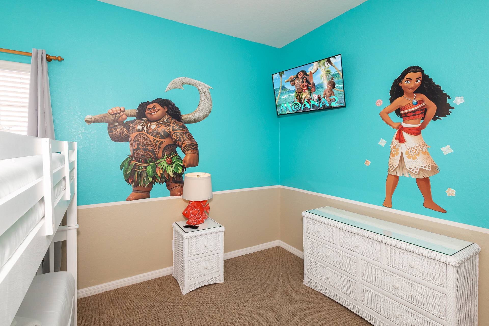 Bedroom #1 includes a full over full bunk bed and smart TV in a Moana-themed room.