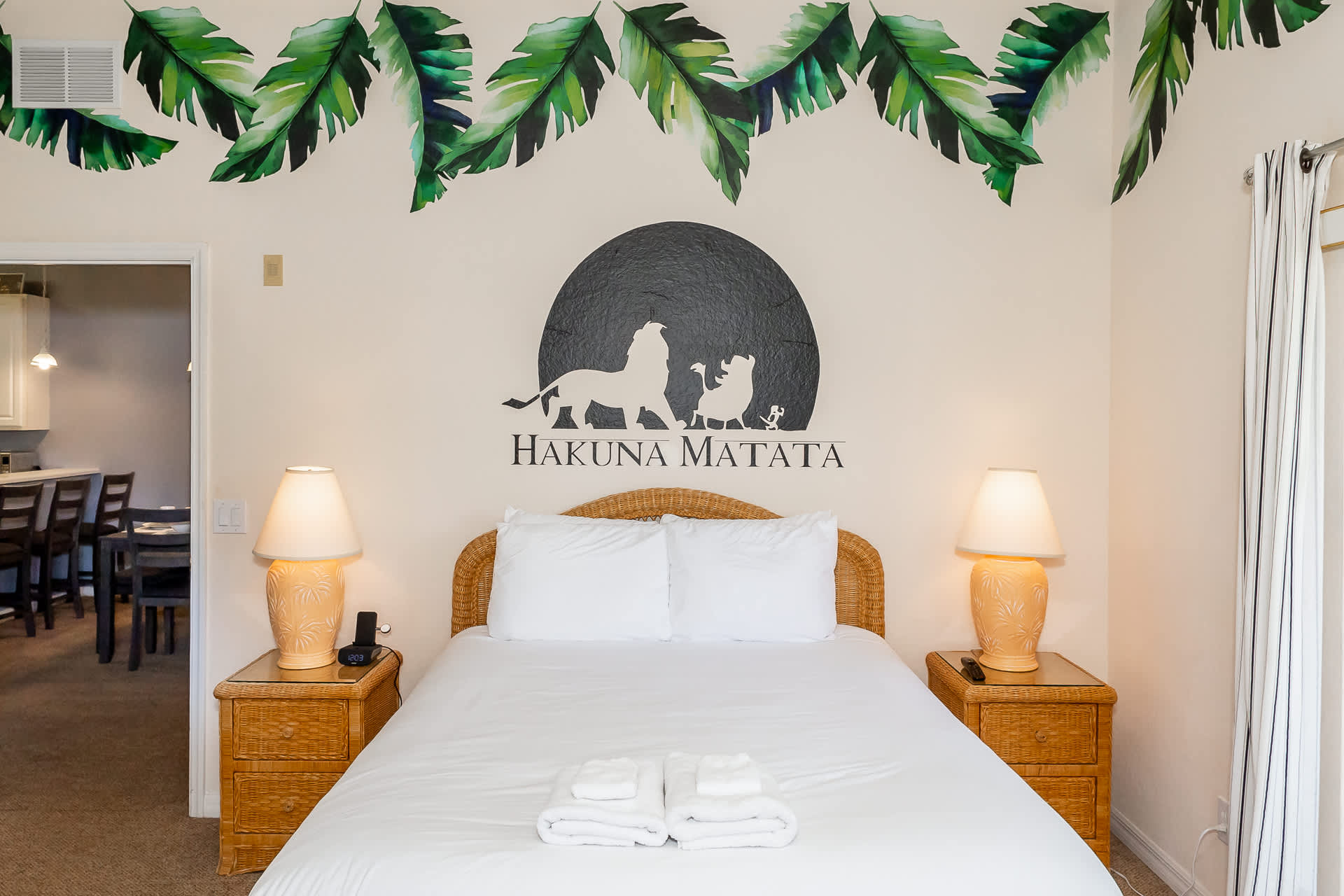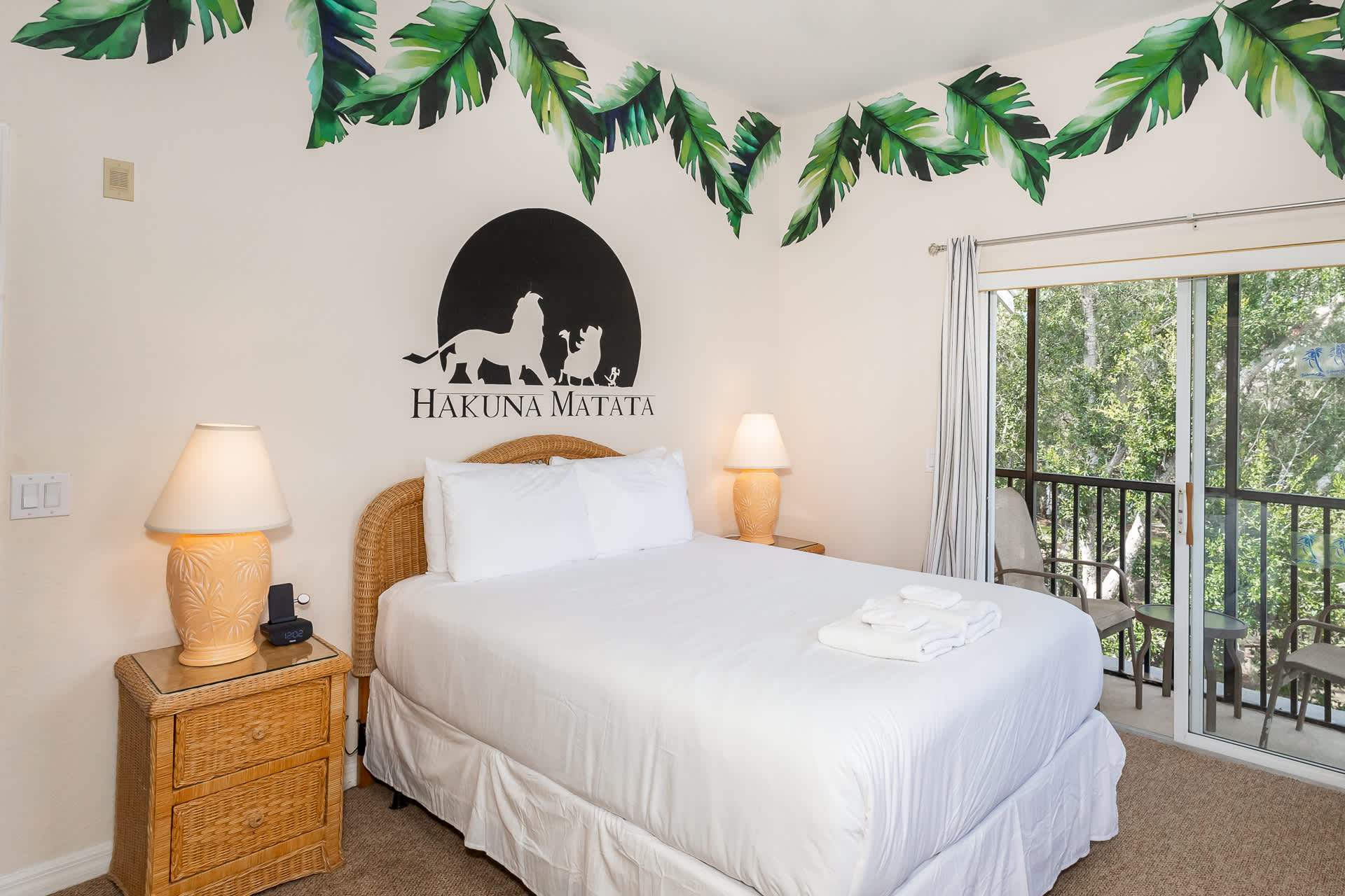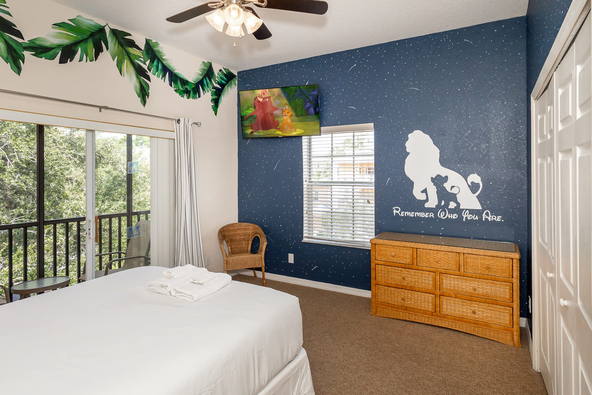 Bedroom #2 includes a queen size bed, smart TV, private balcony with table and chairs, and ensuite bathroom with a dual vanity, soaking tub, and walk-in shower. The room has been styled in a Lion King theme.