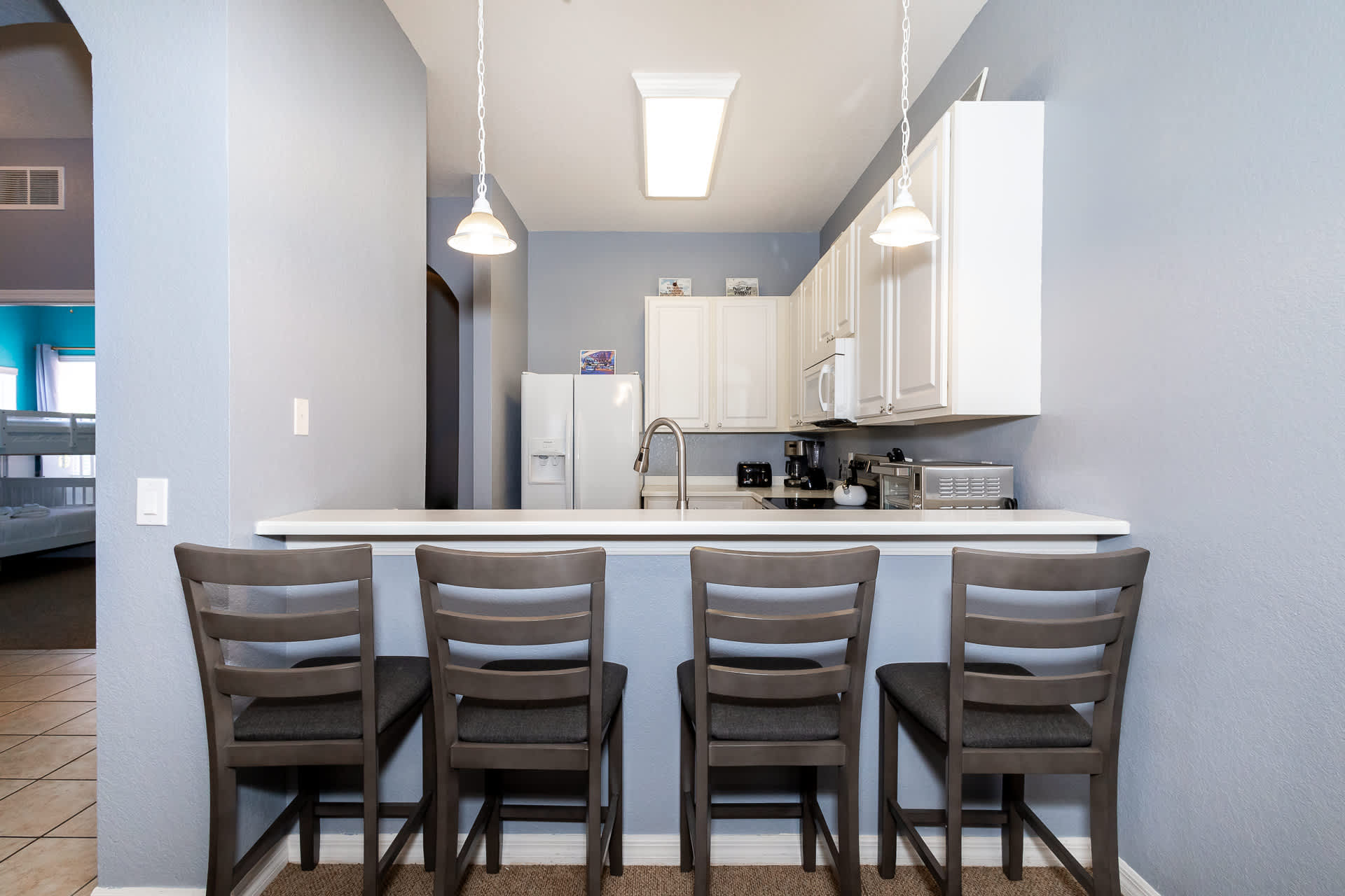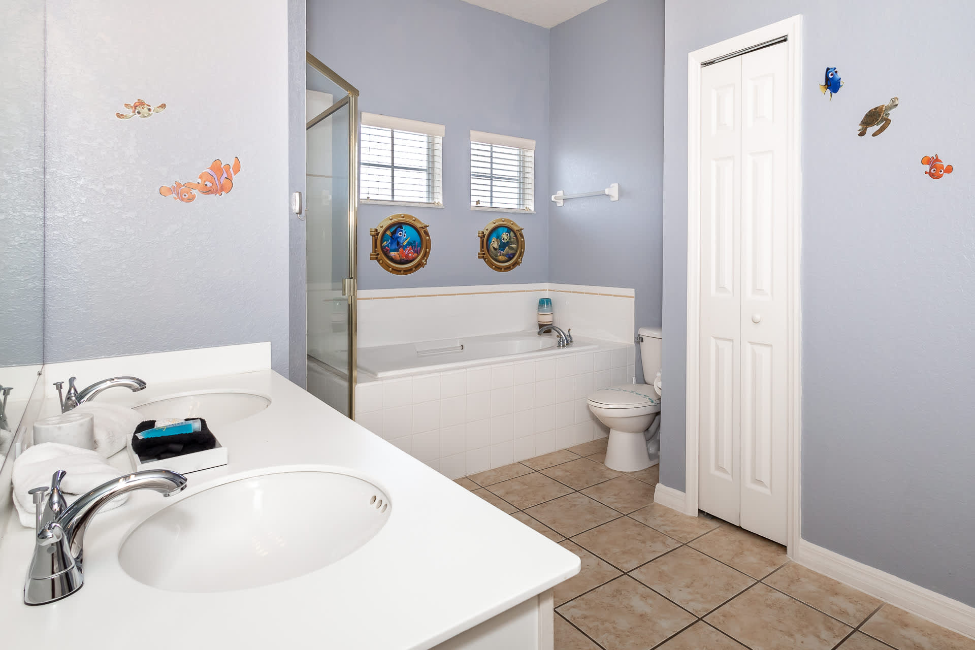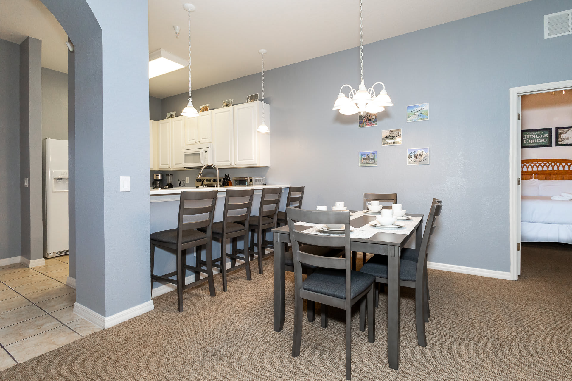 Inside the home, you and your family will delight in the Disney-themed décor, changing from room to room. The owners have even designed a secret Disney scavenger hunt for you to complete once you’re settled in! Sorry – no spoilers here. A cozy living room provides ample sofa seating and a large, mounted smart TV for streaming your favorite movies and shows. Step out onto the screened-in balcony to take in some fresh air and lovely views of the surrounding complex. A table and chairs for 6 also offer an attractive option for al fresco dining. Back inside you’ll find a well-equipped kitchen with all major appliances, drip coffee maker, toaster, a toaster oven, and a full suite of cookware and dining ware for when the group requests a home cooked meal. You can seat all of your guests between the kitchen counter high-top stools for 4 and gather around the formal dining room table with room for 8.