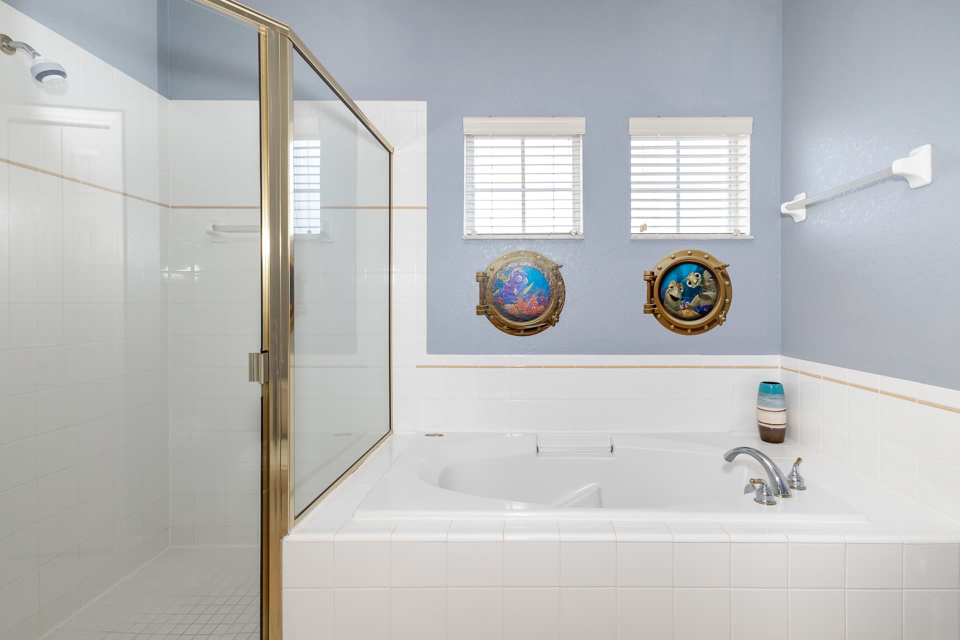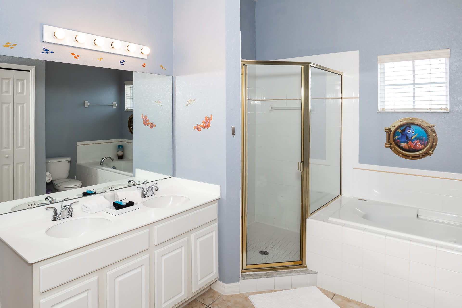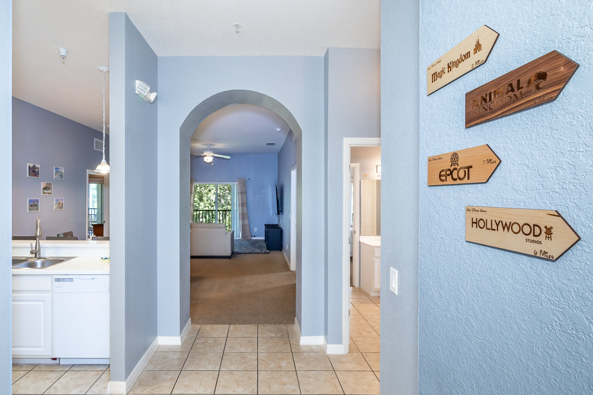 Inside the home, you and your family will delight in the Disney-themed décor, changing from room to room. The owners have even designed a secret Disney scavenger hunt for you to complete once you’re settled in! Sorry – no spoilers here. A cozy living room provides ample sofa seating and a large, mounted smart TV for streaming your favorite movies and shows. Step out onto the screened-in balcony to take in some fresh air and lovely views of the surrounding complex. A table and chairs for 6 also offer an attractive option for al fresco dining. Back inside you’ll find a well-equipped kitchen with all major appliances, drip coffee maker, toaster, a toaster oven, and a full suite of cookware and dining ware for when the group requests a home cooked meal. You can seat all of your guests between the kitchen counter high-top stools for 4 and gather around the formal dining room table with room for 8.