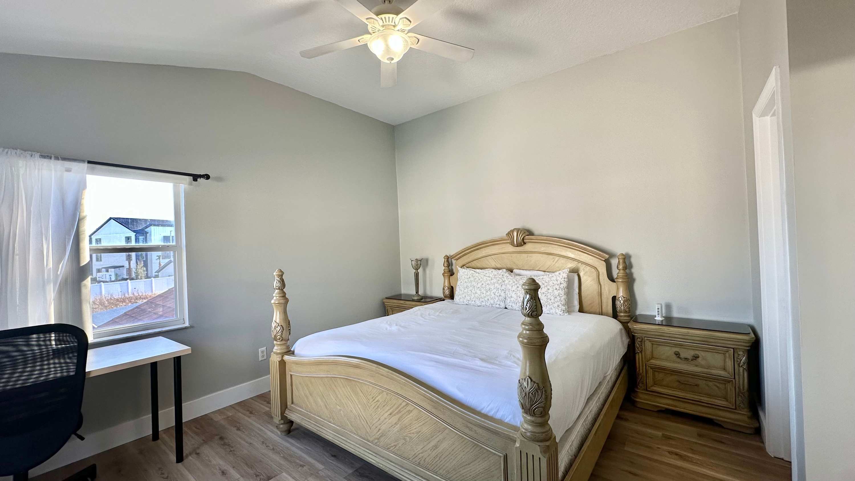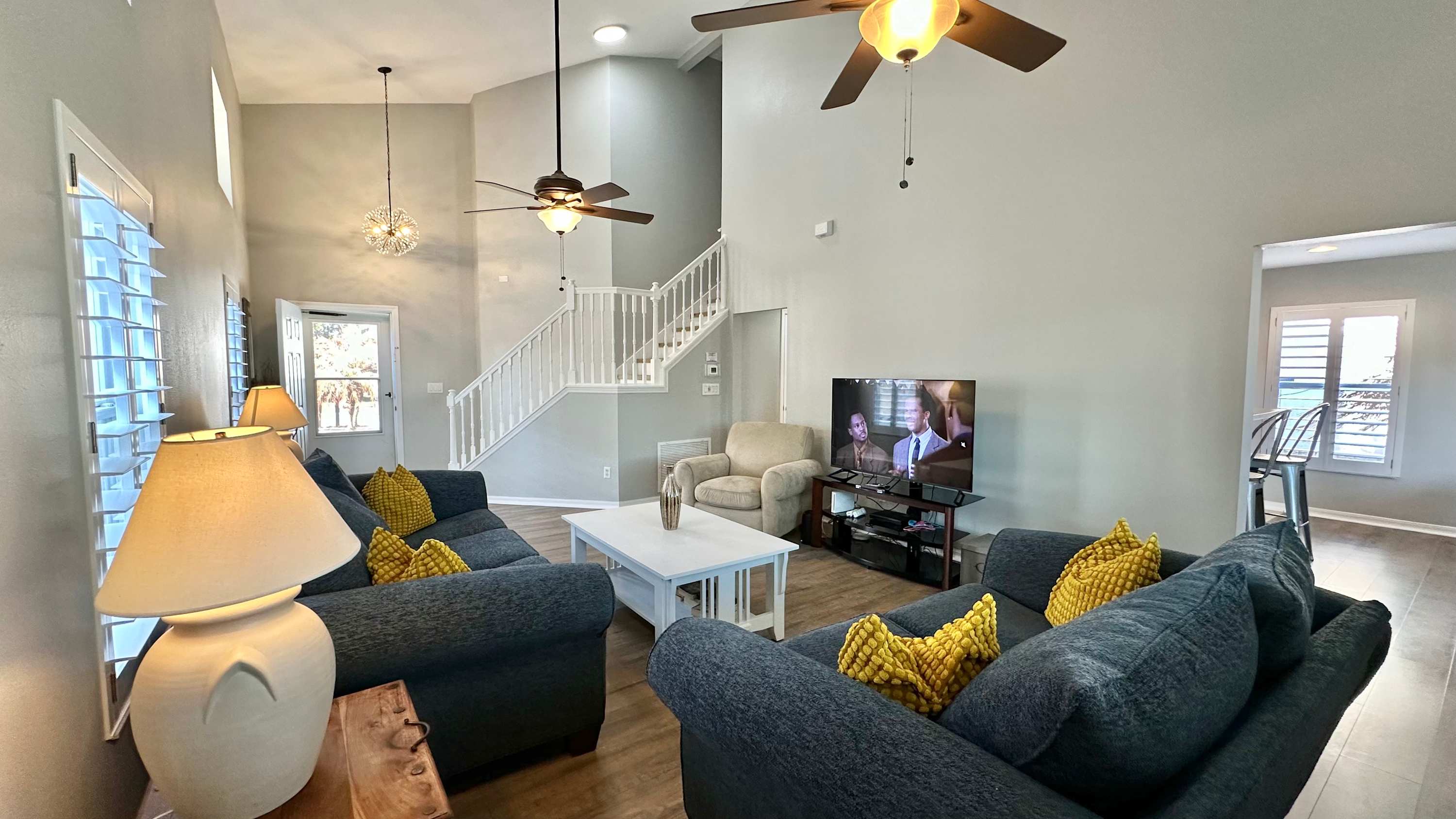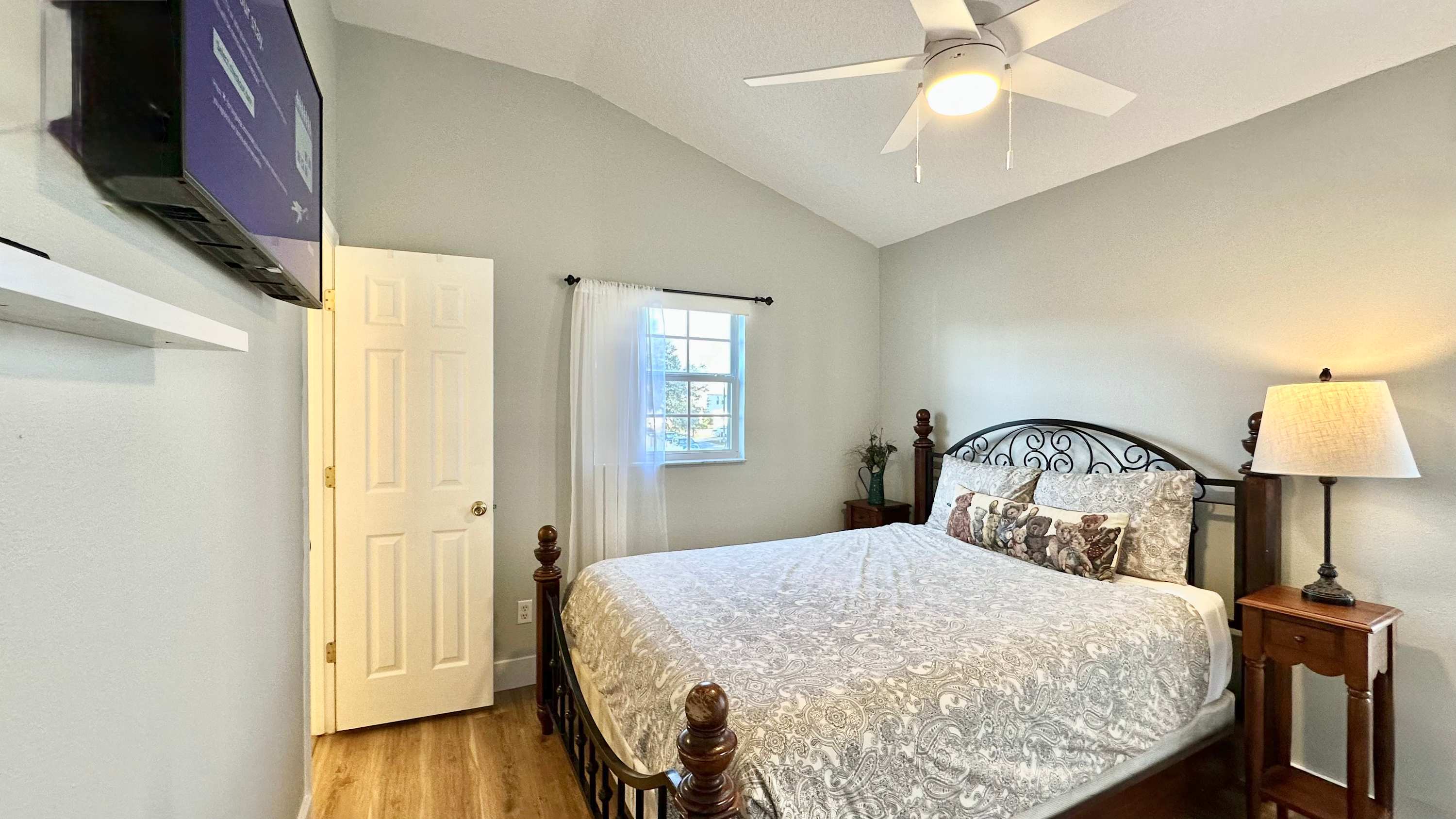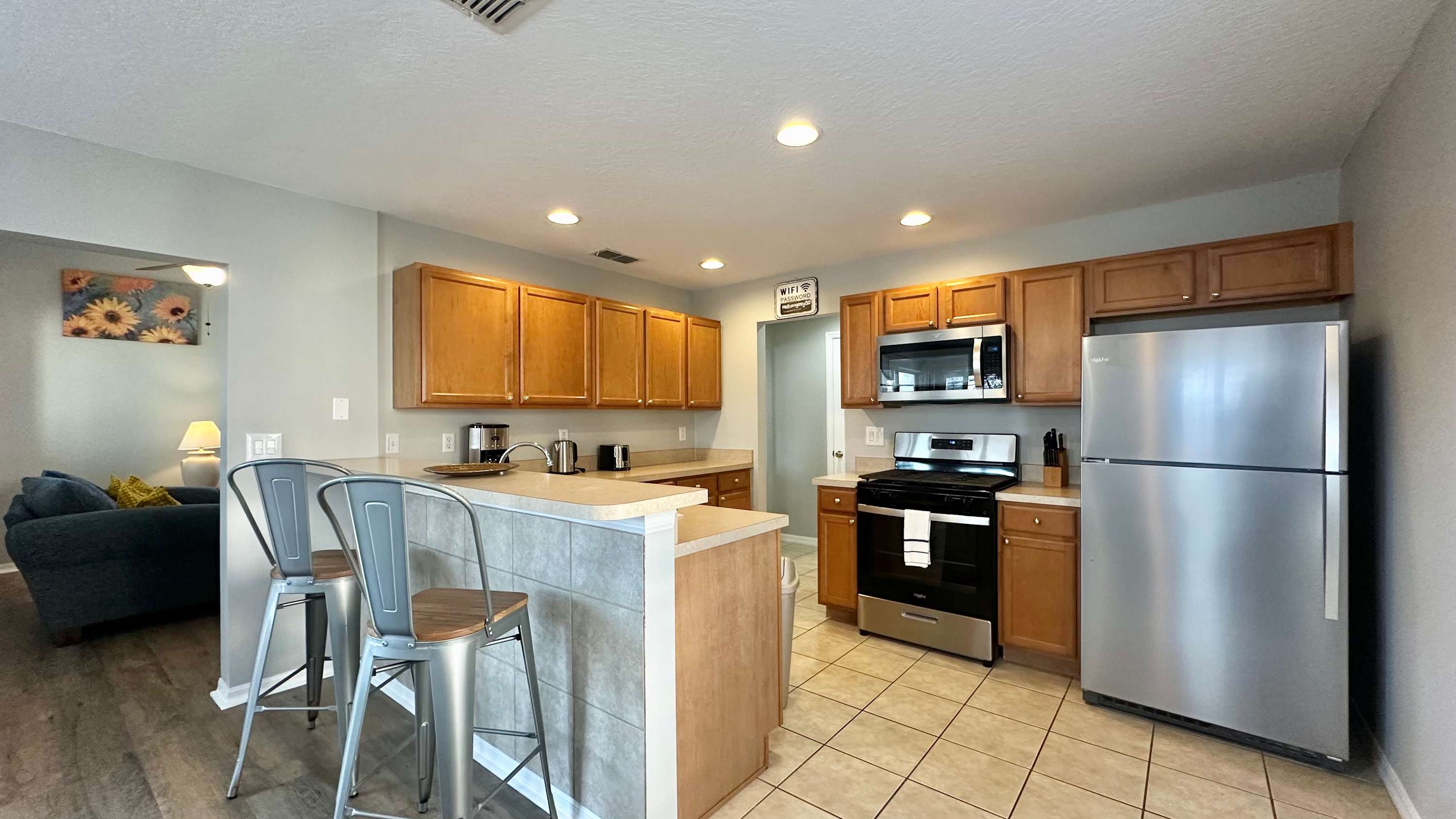 The home has been adorned with lots of homey touches to help you settle in quickly. The living room is bathed in plentiful natural light and offers comfortable sofa and armchair seating, as well as 2 overhead fans to keep the cool air moving. A smart TV allows you to stream all your favorite shows without missing a single episode or host a family movie night while you wind down for bed. Just around the corner, the bright and airy kitchen is fully equipped with stainless steel appliances, a toaster, a kettle, and a drip coffee maker. Prepare full-sized family meals or quick appetizers here, served up at the counter with two high-top barstools for an informal seating option. For a more formal meal setting, a dining room table just steps away can accommodate your entire crew for whatever type of fare you have in mind.
