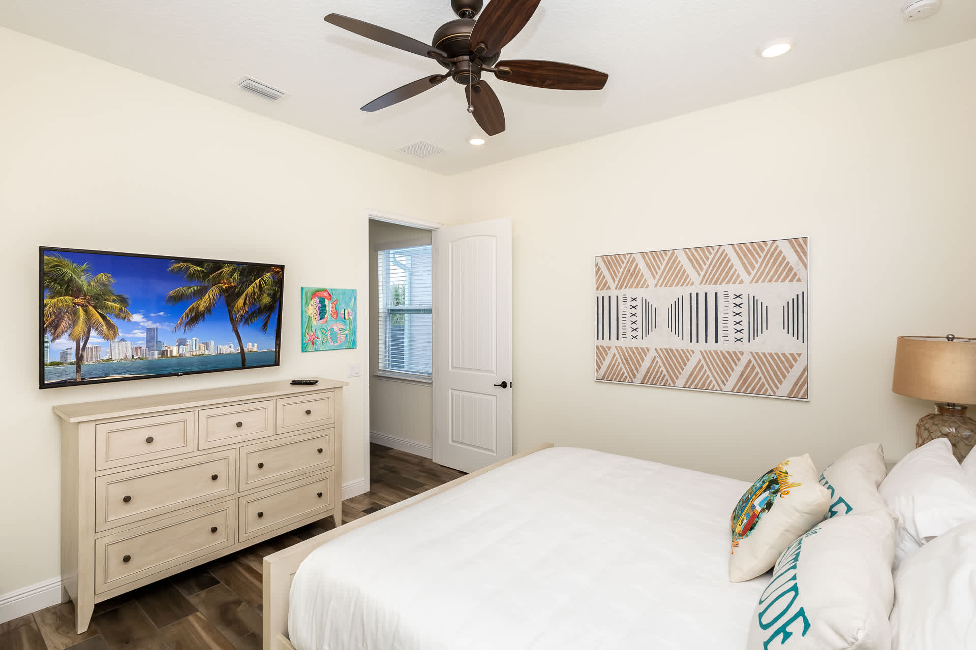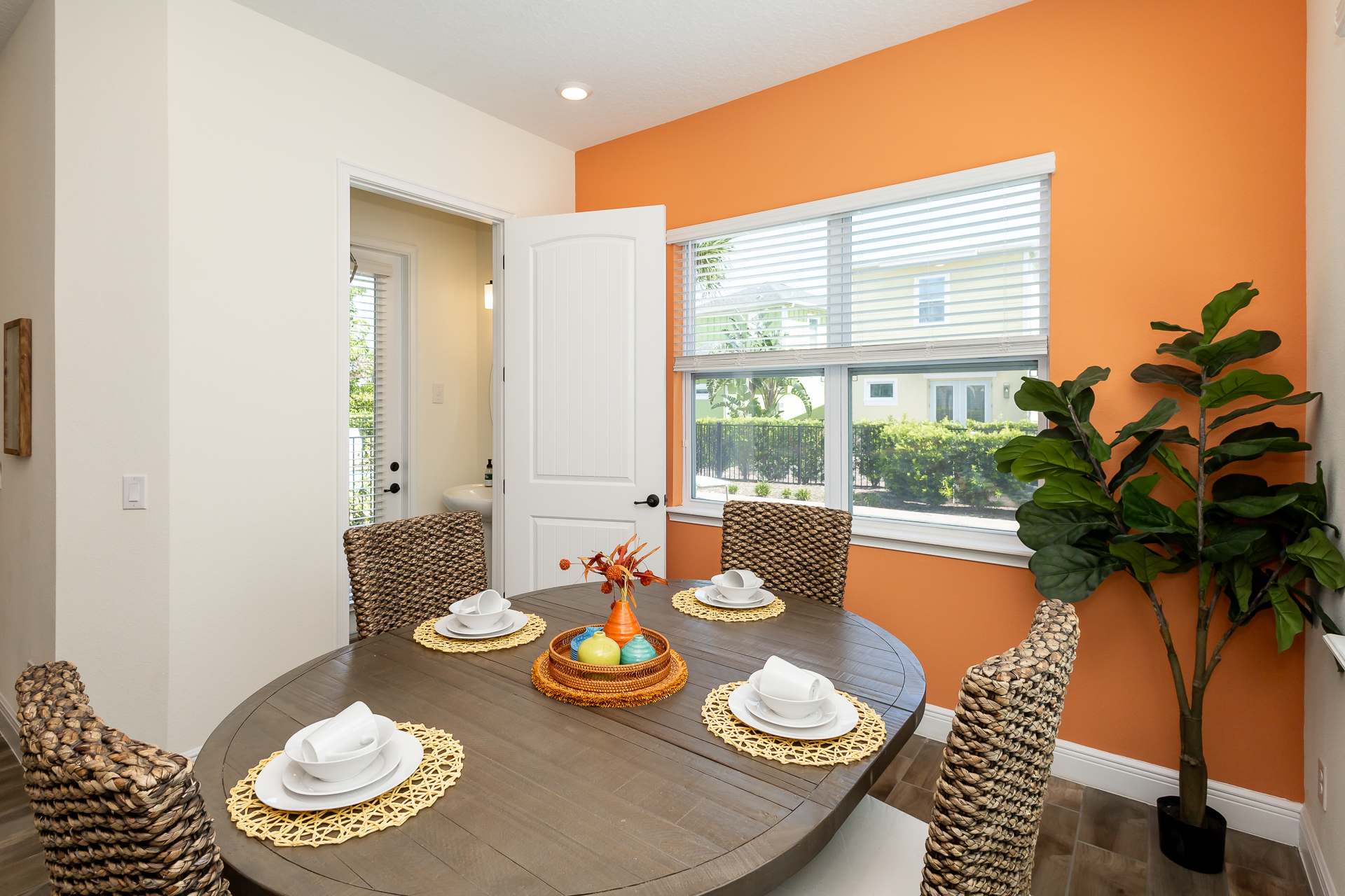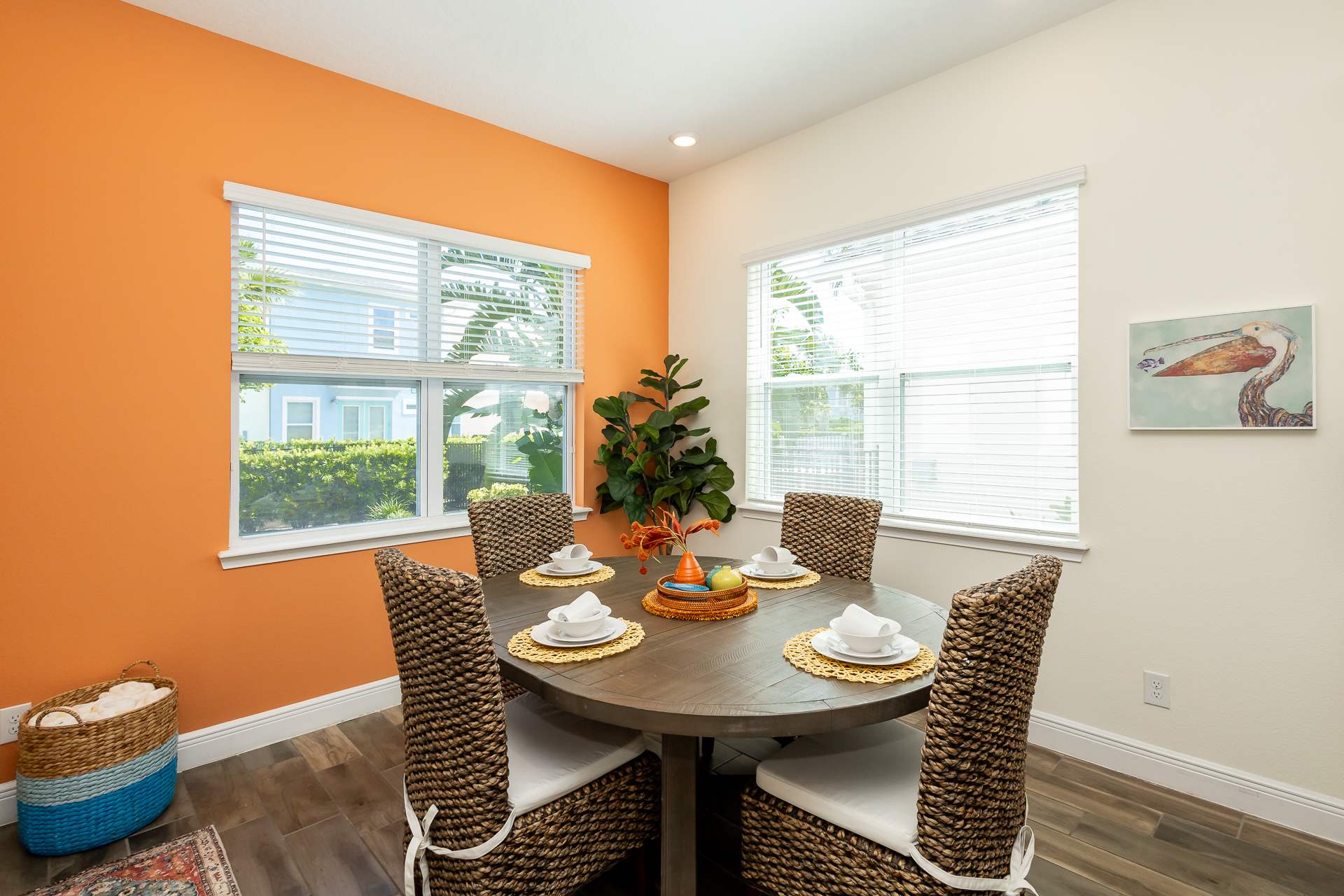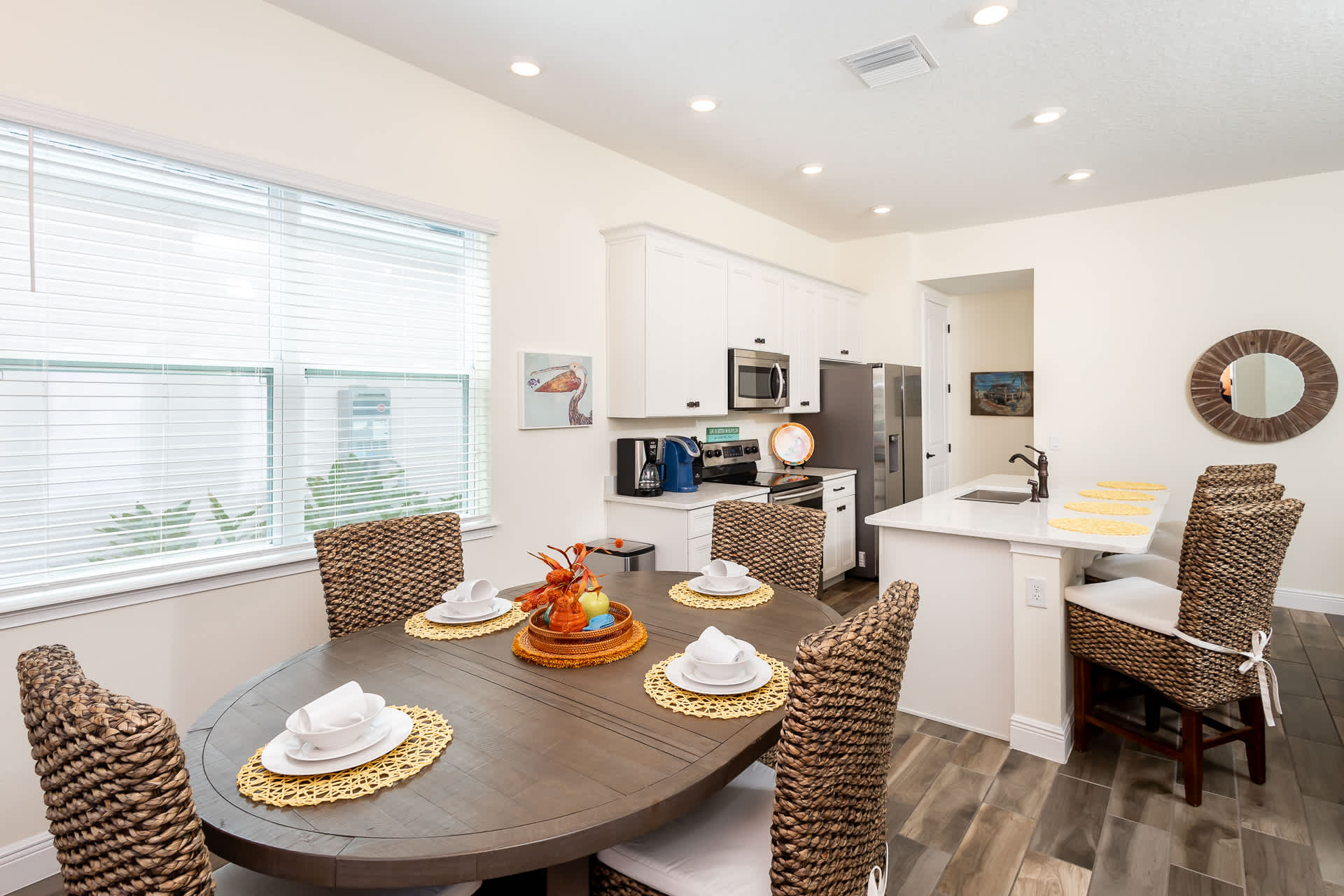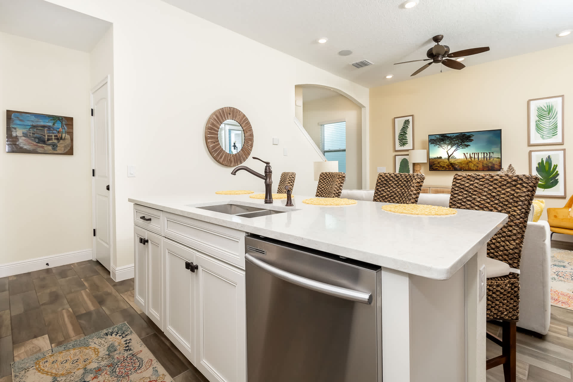 Cool off indoors in the blissful air conditioning amongst comfortable furnishings and décor, paired with soothing neutral tones accented with bright pops of color to bring the sunshine inside. The main floor living area will be a center for entertainment with comfortable sofa seating, smart TV, and access to the patio. Turn on your favorite Disney movie and let the songs flow through the home courtesy of the open floor plan keeping everyone well-connected. The kitchen and dining room are ready to host all of your meals with counter and table seating for 8. Stainless steel appliances are paired with creamy stone countertops and bright white cabinets, appealing to even the most reluctant of cooks. Keurig and drip coffee makers can also be found here along with, you guessed it, your very own margarita blender! Spiked for adults or a virgin version for kids, you can let your flavor imagination run wild and serve up icy treats any time of day.