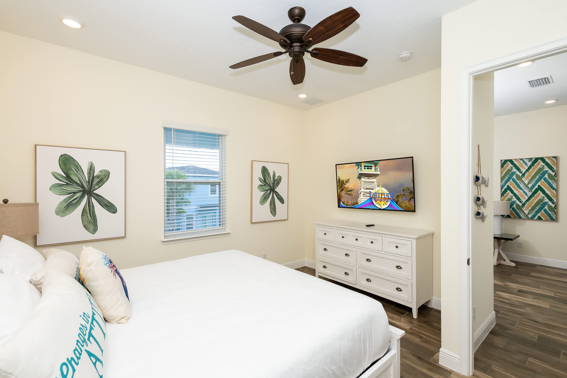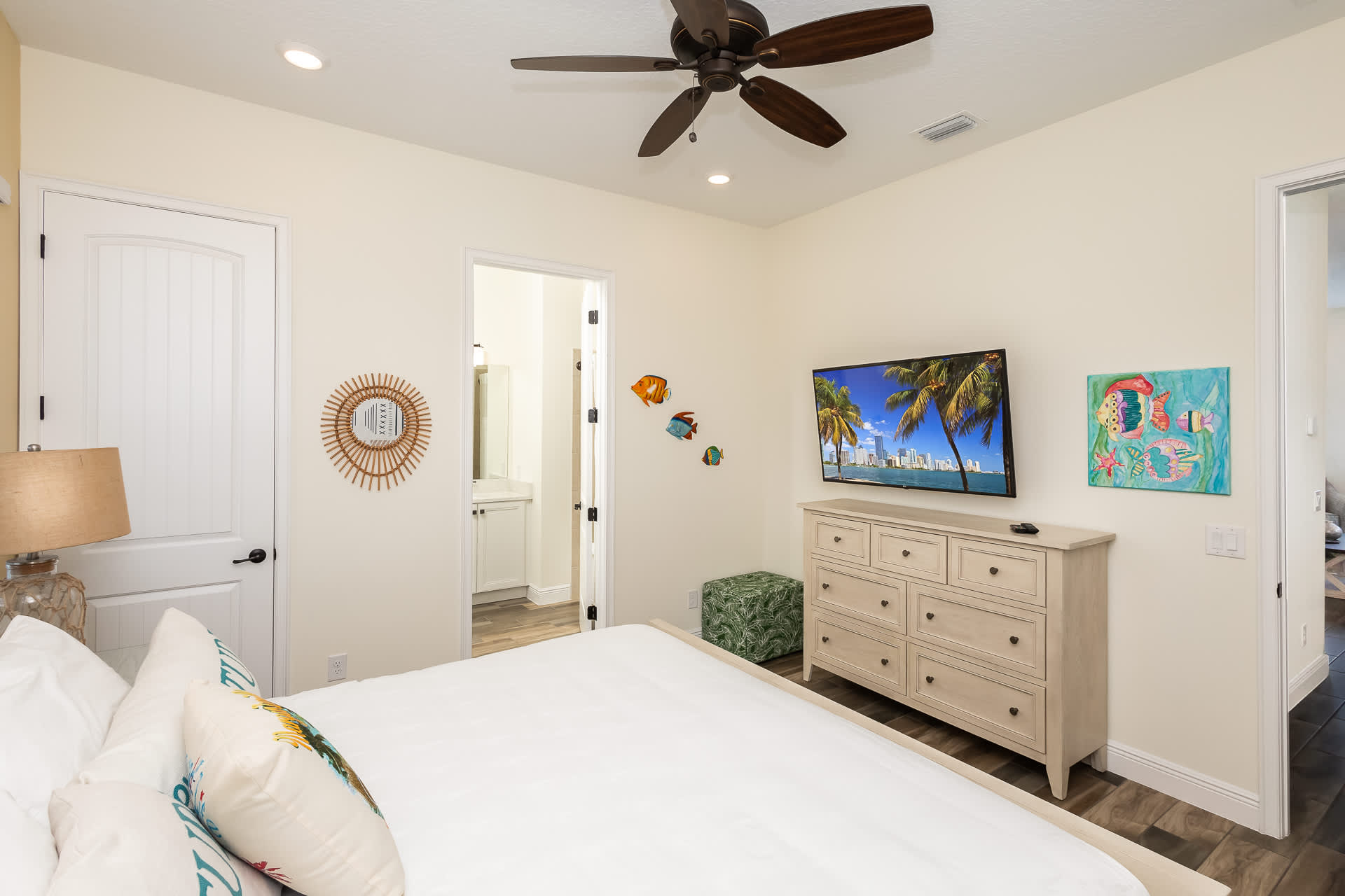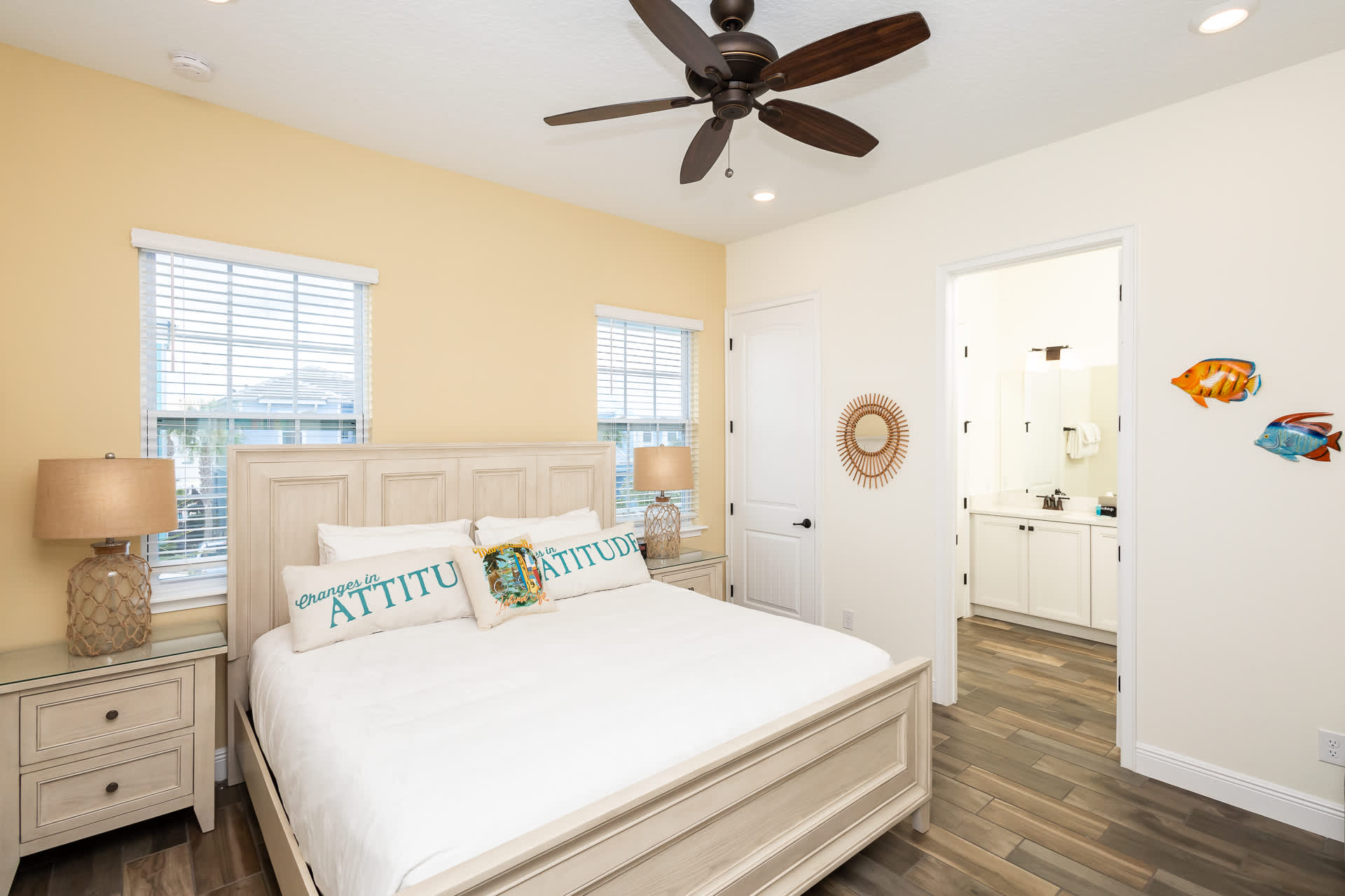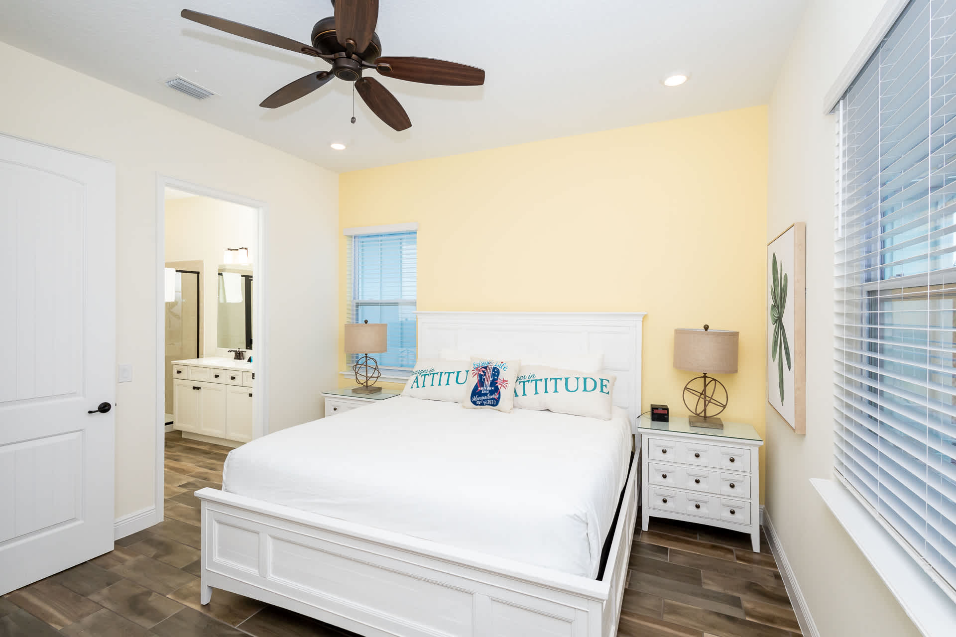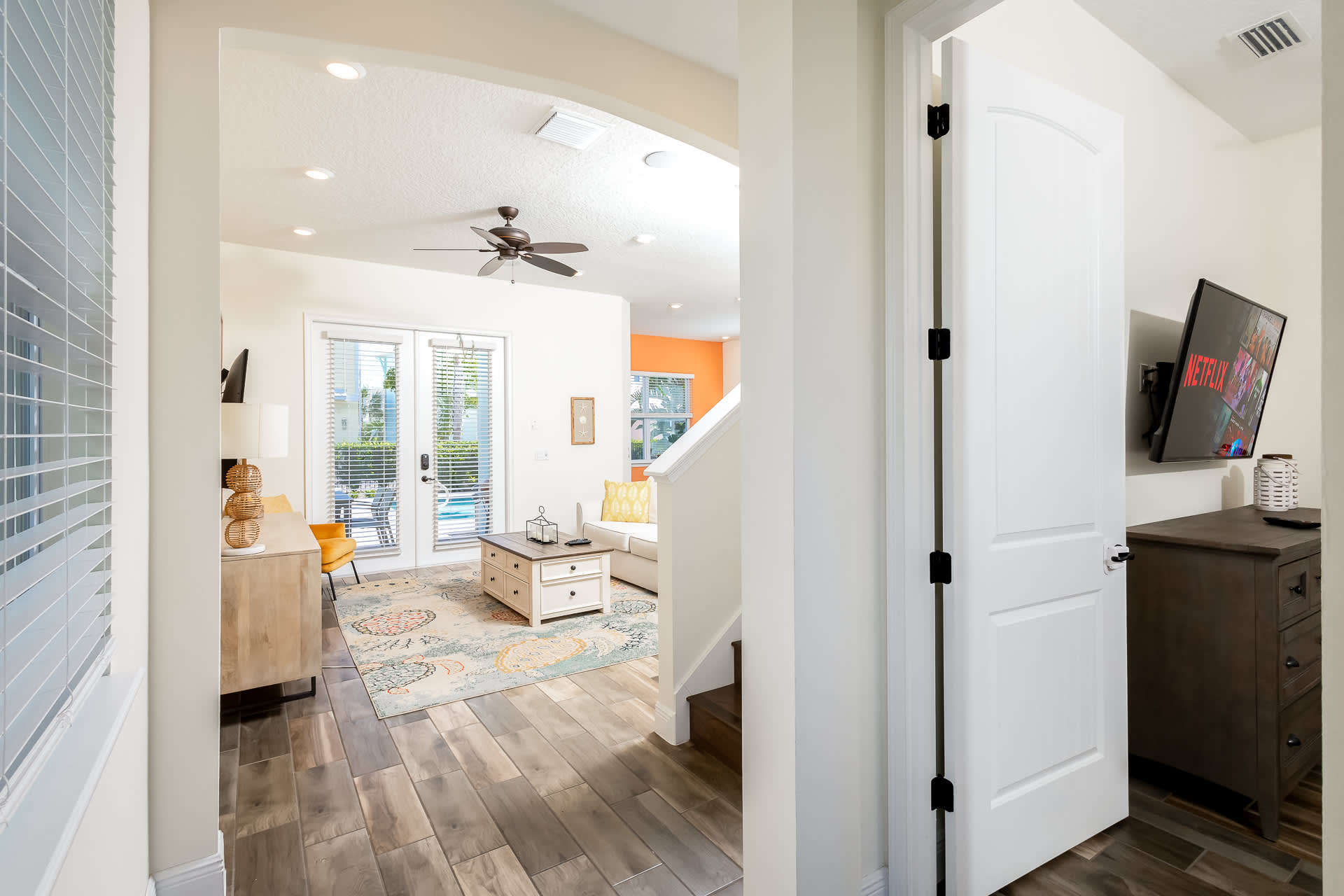 Cool off indoors in the blissful air conditioning amongst comfortable furnishings and décor, paired with soothing neutral tones accented with bright pops of color to bring the sunshine inside. The main floor living area will be a center for entertainment with comfortable sofa seating, smart TV, and access to the patio. Turn on your favorite Disney movie and let the songs flow through the home courtesy of the open floor plan keeping everyone well-connected. The kitchen and dining room are ready to host all of your meals with counter and table seating for 8. Stainless steel appliances are paired with creamy stone countertops and bright white cabinets, appealing to even the most reluctant of cooks. Keurig and drip coffee makers can also be found here along with, you guessed it, your very own margarita blender! Spiked for adults or a virgin version for kids, you can let your flavor imagination run wild and serve up icy treats any time of day.