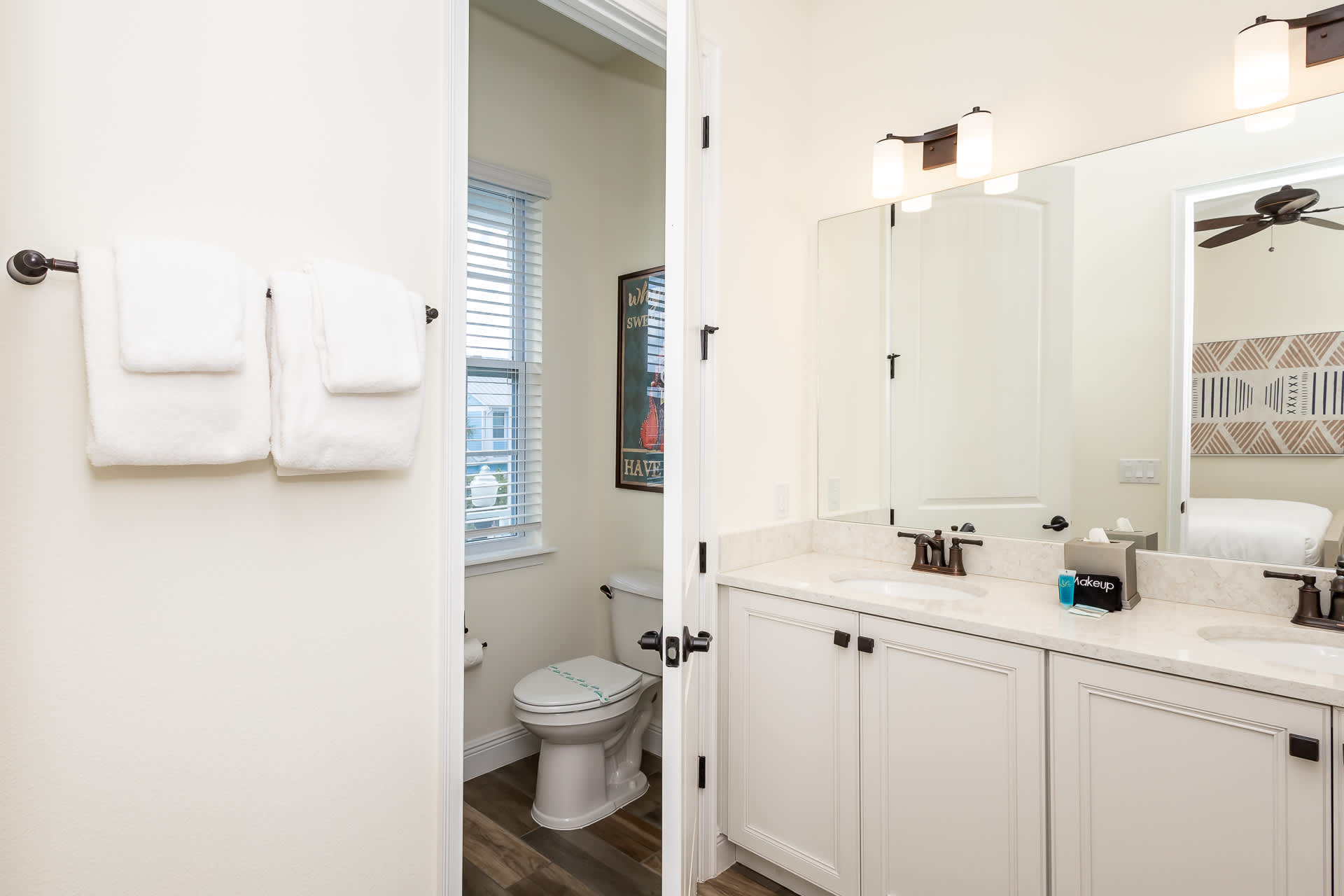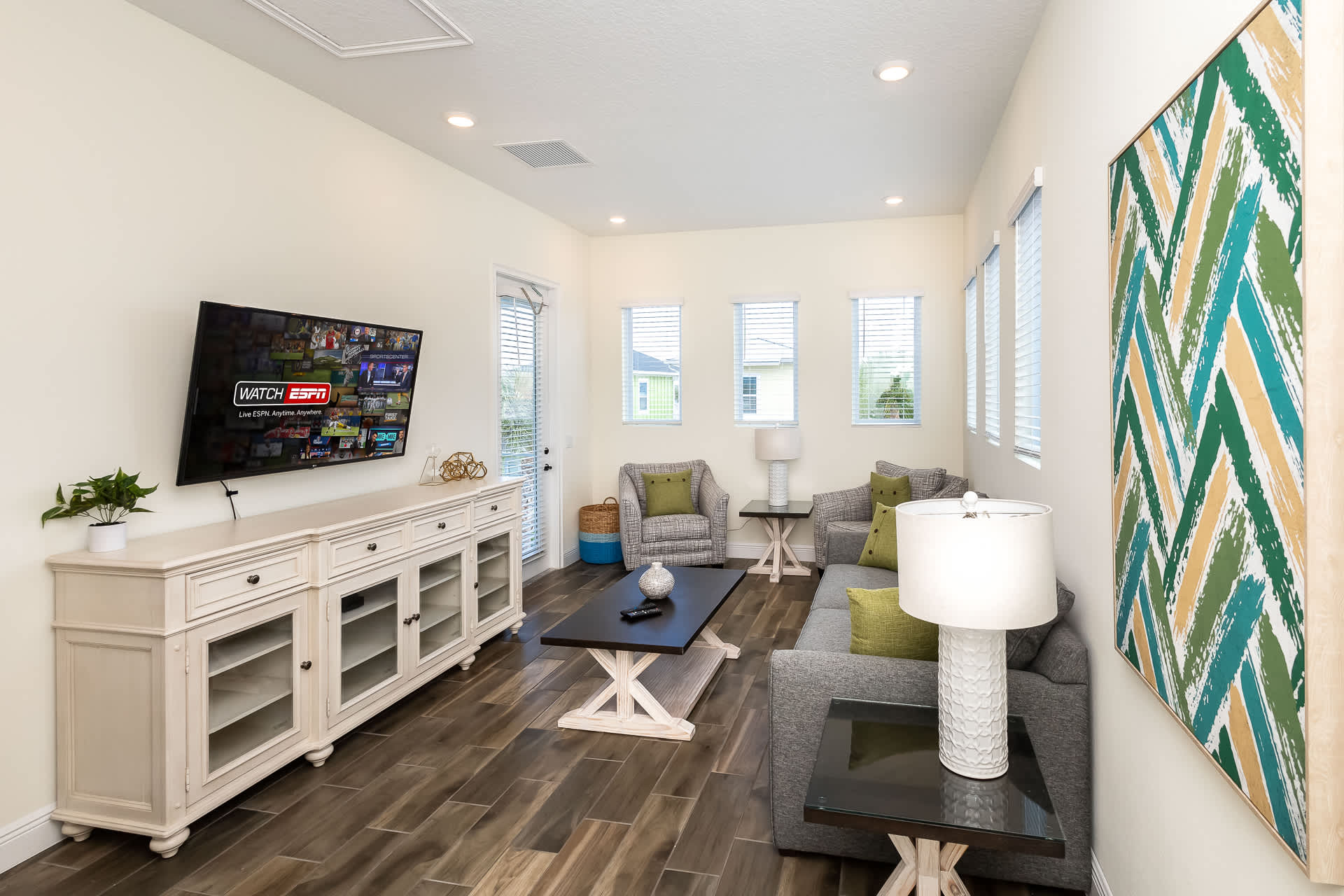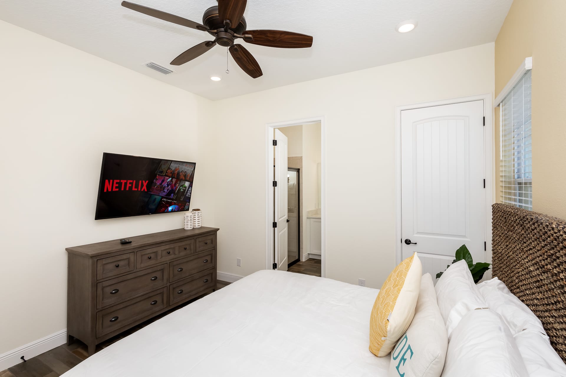 On the second level, in addition to bedrooms, you will find a second cozy living space with its own sofa and smart TV, perfect for a private movie night for the kids. Two separate balconies provide spaces for quiet reflection and taking in the view or gazing at the stars at the end of another perfect day in Kissimmee.